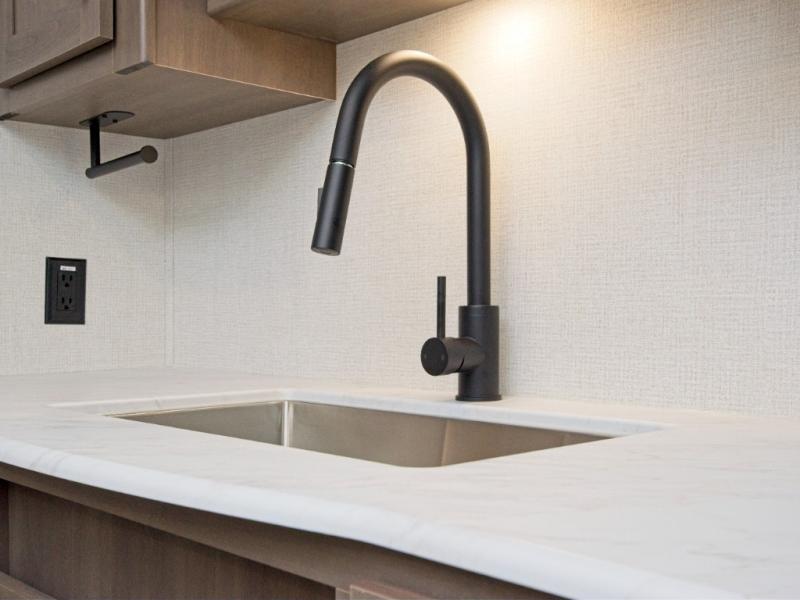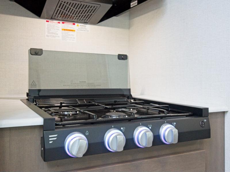 Cook indoors on the three-burner range or take the meal prep outside with the outdoor kitchen, complete with a two-burner cooktop, mini fridge, and spray port.