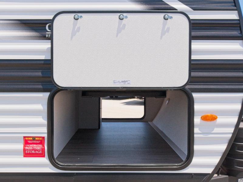 Outside, you'll find an exterior griddle and a 1.7 refrigerator, perfect for outdoor cooking. The massive 19’ awning offers ample shade and protection from the elements. With two entry/exit doors and pass-through storage, accessing the trailer and your gear is a breeze.