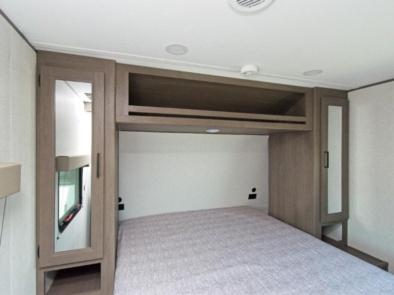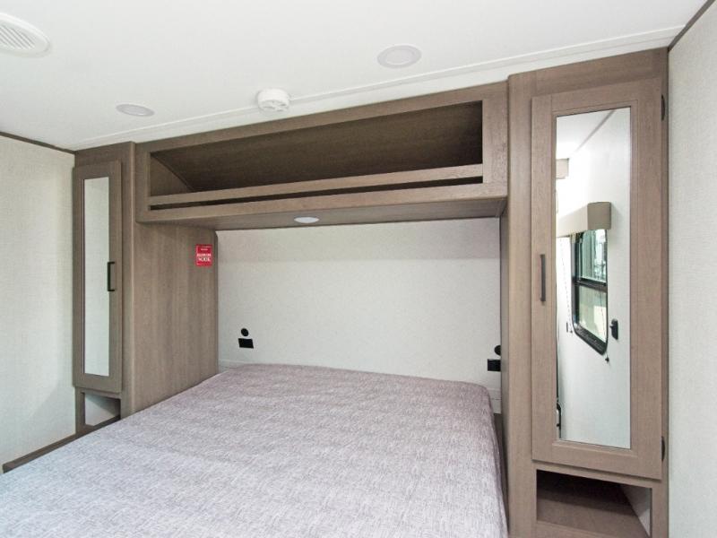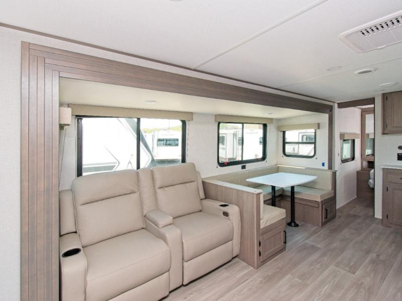 Embark on unforgettable journeys with our luxurious travel trailer. The front bedroom features a cozy queen bed, wardrobe, and overhead cabinets, creating the perfect sanctuary to unwind after a day of exploration. The combined living room and kitchen area boasts a U-shaped dinette, three-burner cooktop, microwave, refrigerator, pantry, and 62” theater seating—ideal for cooking, entertaining, or simply relaxing in comfort.
