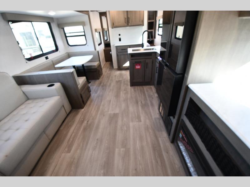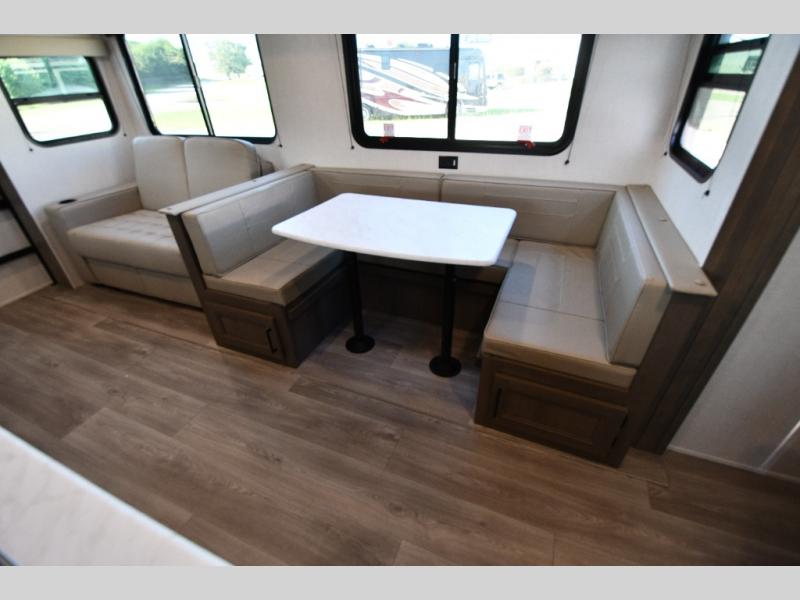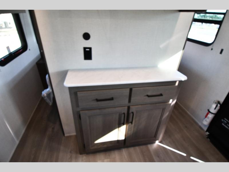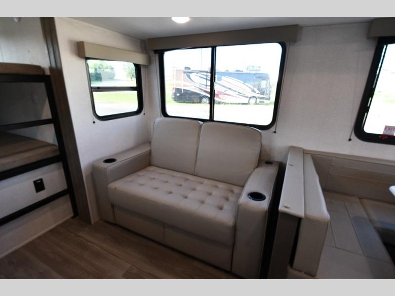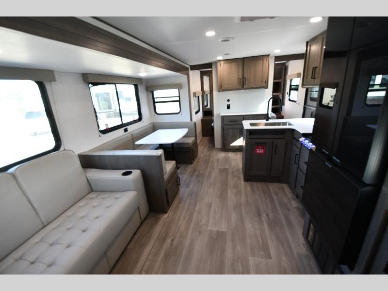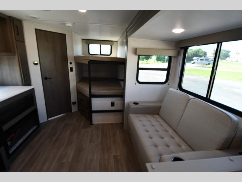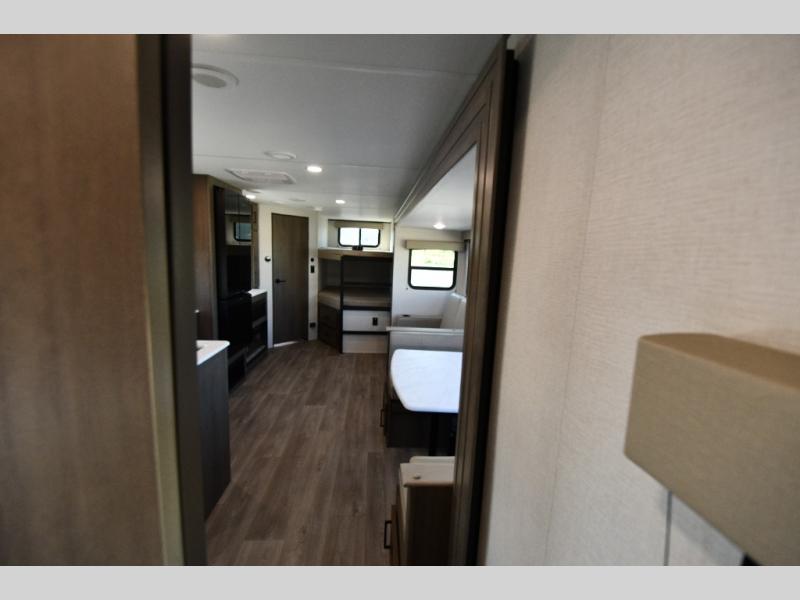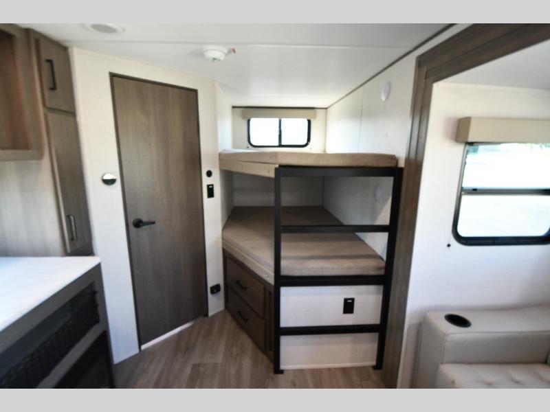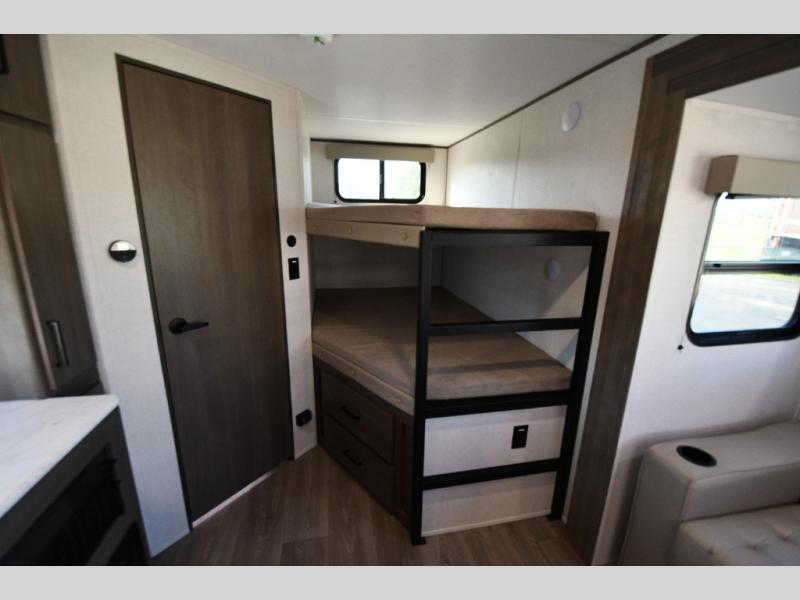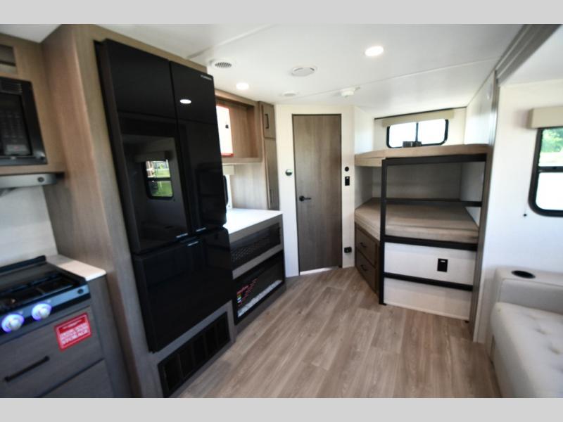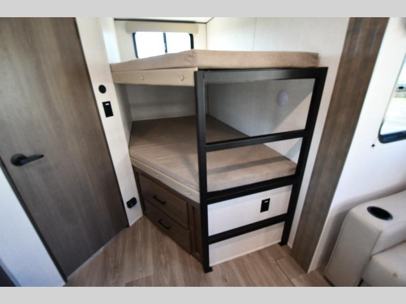 Inside, the 27DBX features a front queen bedroom with wardrobe and overhead storage for all your belongings. The combined living/kitchen area includes a U-shaped dinette, 62" theater seating, three-burner cooktop, microwave, refrigerator, and pantry, making meal prep, entertaining, and relaxing a pleasure. Double-size bunk beds with privacy curtains provide a cozy space for kids, while the full bath with linen closet adds convenience for the whole family. Options like the Elite Kitchen Package, Power and Entertainment Package, and Solar Prep Package enhance both comfort and functionality. Step outside to enjoy the exterior griddle with refrigerator, pass-through storage for all your gear, and a massive 19’ awning for shade and protection.