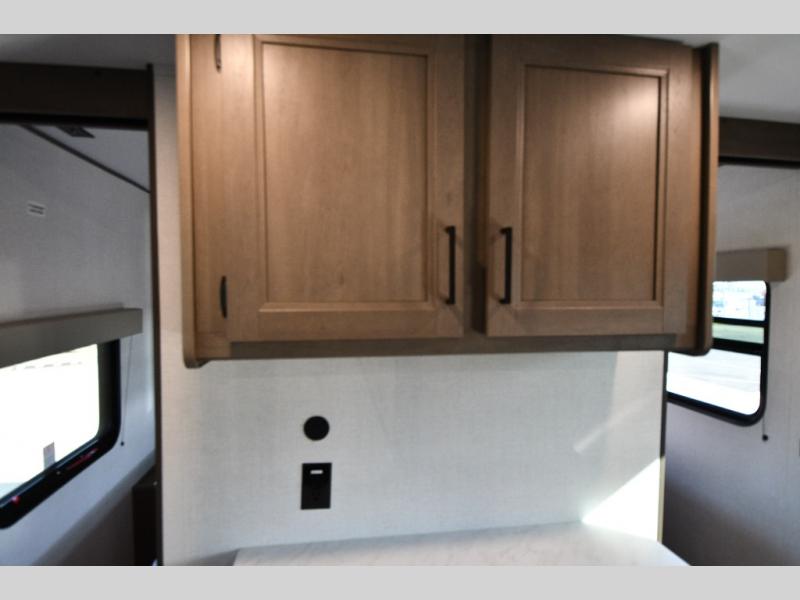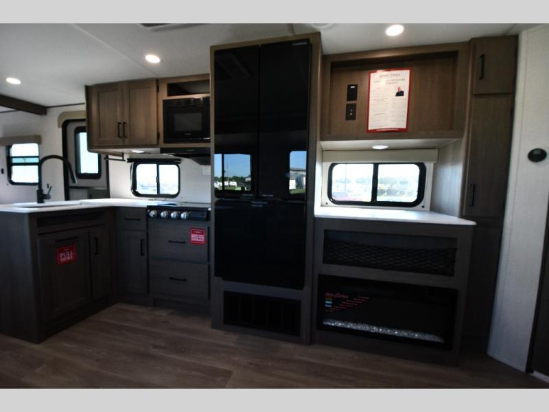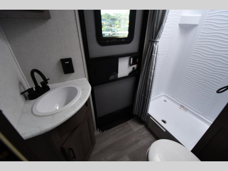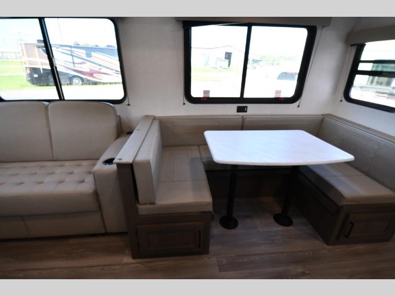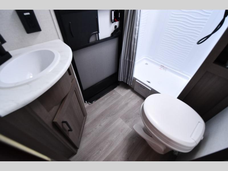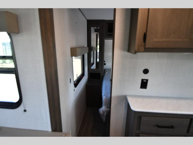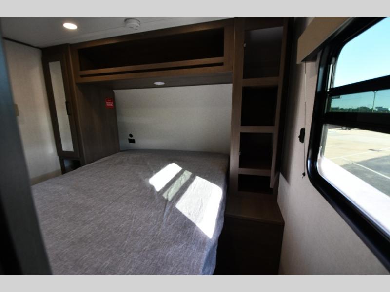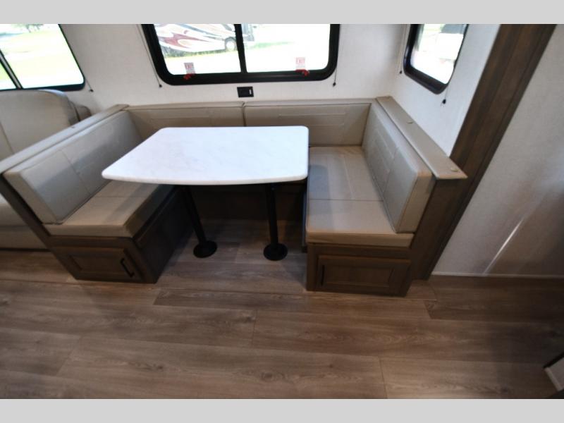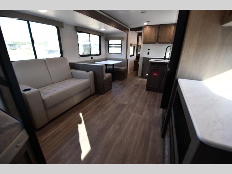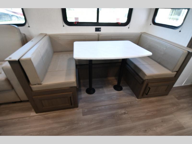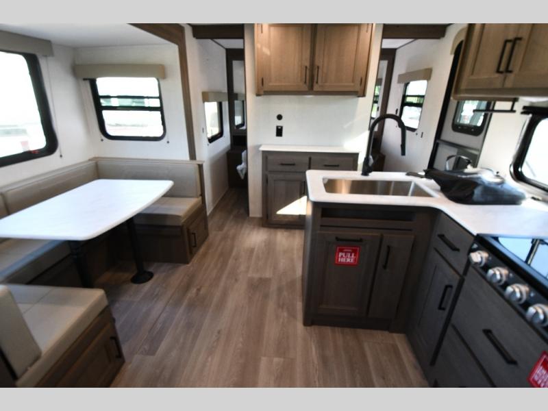 Inside, the 27DBX features a front queen bedroom with wardrobe and overhead storage for all your belongings. The combined living/kitchen area includes a U-shaped dinette, 62" theater seating, three-burner cooktop, microwave, refrigerator, and pantry, making meal prep, entertaining, and relaxing a pleasure. Double-size bunk beds with privacy curtains provide a cozy space for kids, while the full bath with linen closet adds convenience for the whole family. Options like the Elite Kitchen Package, Power and Entertainment Package, and Solar Prep Package enhance both comfort and functionality. Step outside to enjoy the exterior griddle with refrigerator, pass-through storage for all your gear, and a massive 19’ awning for shade and protection.