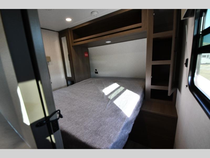 Front queen bedroom with wardrobe and overhead storage for organized living