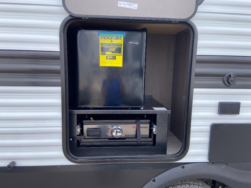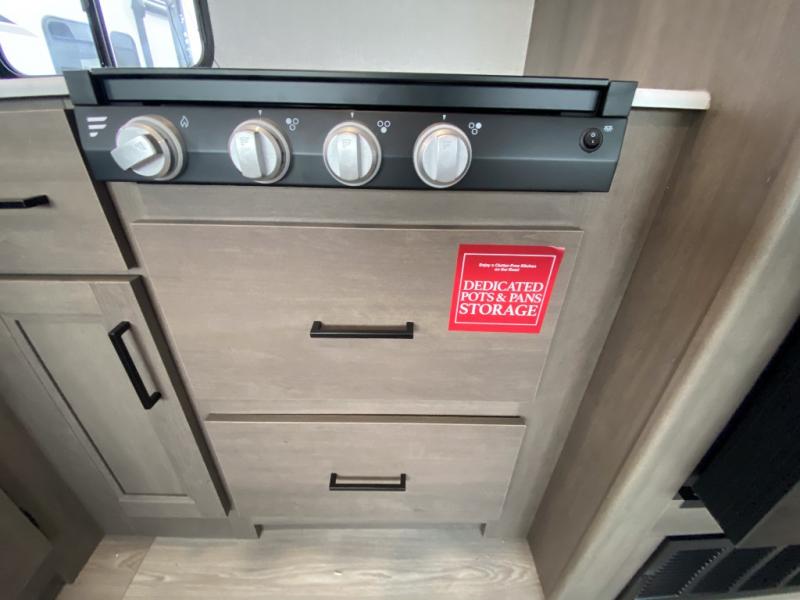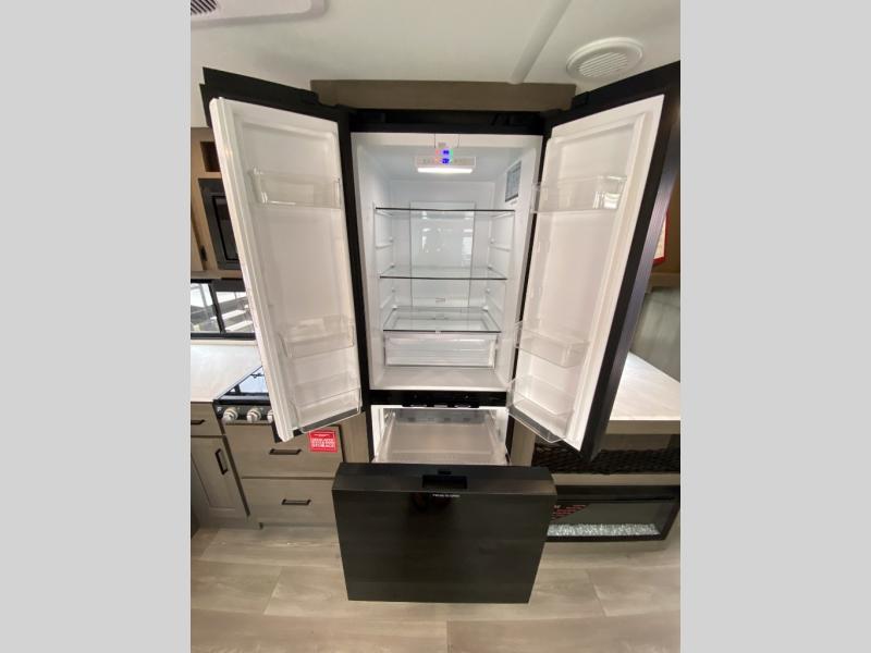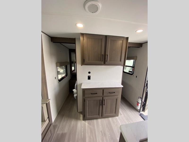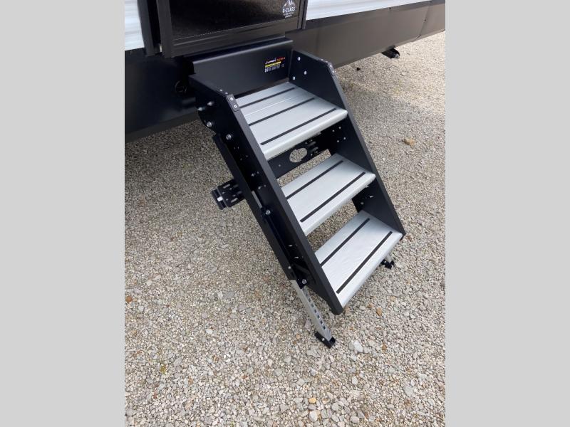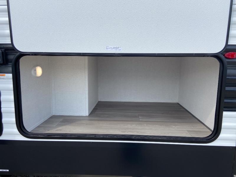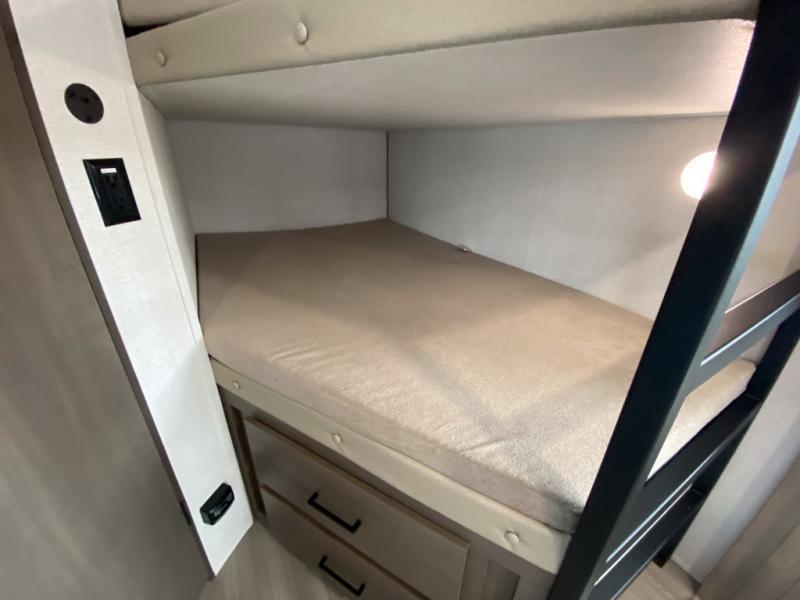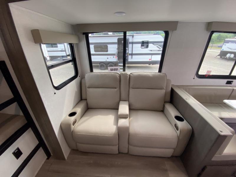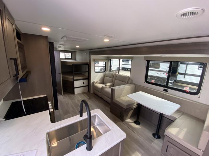 Get ready to take your travels to new heights with our incredible luxury travel trailer! The front bedroom has a queen bed, wardrobe, and overhead cabinets for all your favorite belongings, the perfect place to relax and recharge after a long day of adventure. The living room/kitchen combined area is equipped with a U-shaped dinette, three-burner cooktop, microwave, refrigerator, pantry, and 62” theater seating. Perfect for cooking up your favorite meals, entertaining friends and family, or simply relaxing and enjoying the comforts of home. The full bathroom is spacious and complete with a linen closet for added convenience. And with double-sized bunk beds featuring curtains and under-bunk storage, the kids will have their cozy retreat. But the adventure doesn't stop there! Outside, you'll find an exterior griddle with a 1.7 refrigerator, perfect for cooking up a storm in the great outdoors. And with a massive 19’ awning, you'll have plenty of shade and protection from the elements, plus, with two entry/exit doors and pass-through storage, you'll have easy access to the trailer and all your gear.
