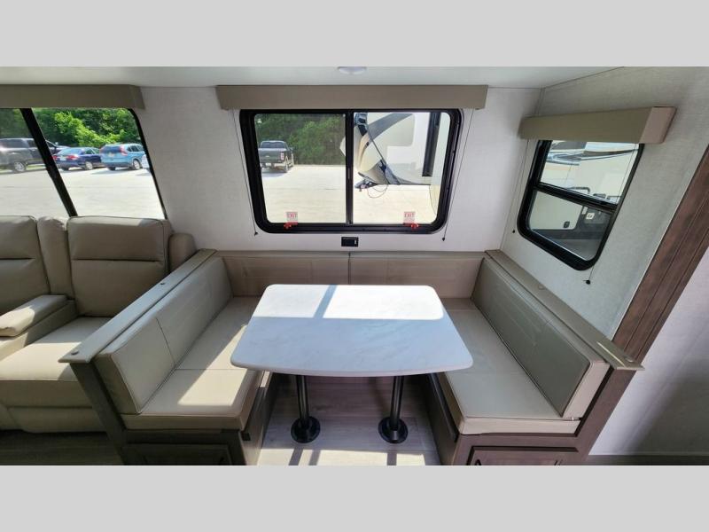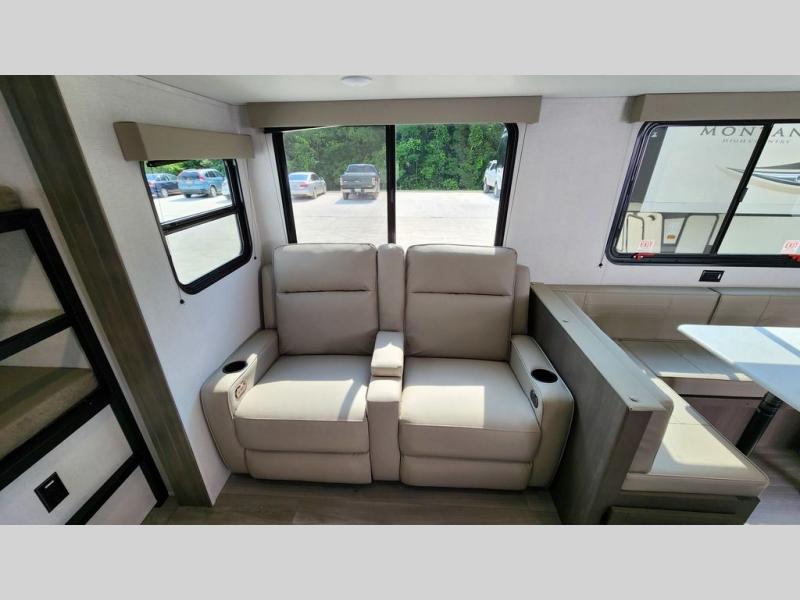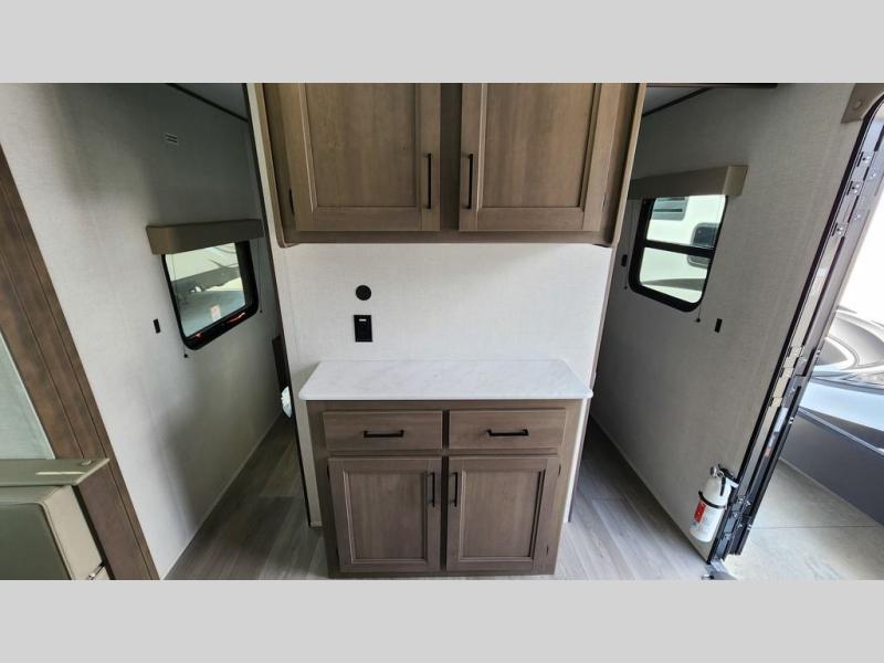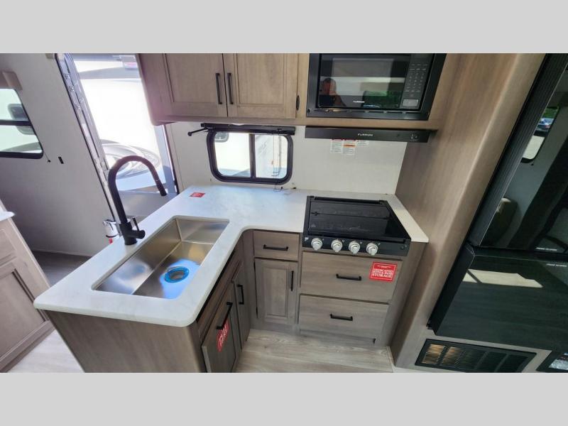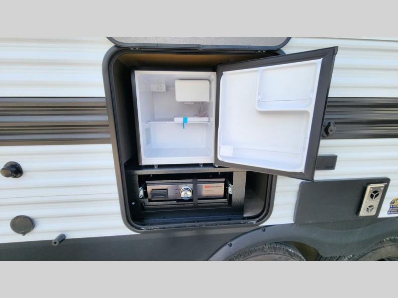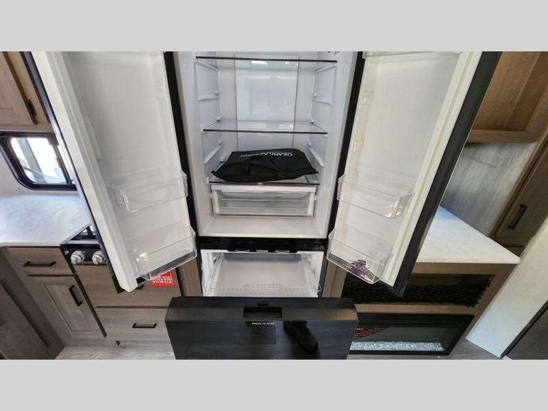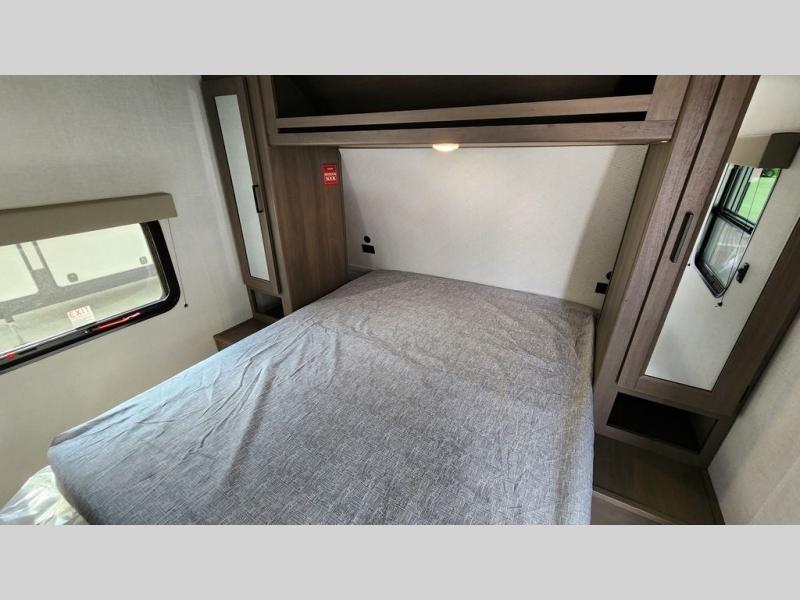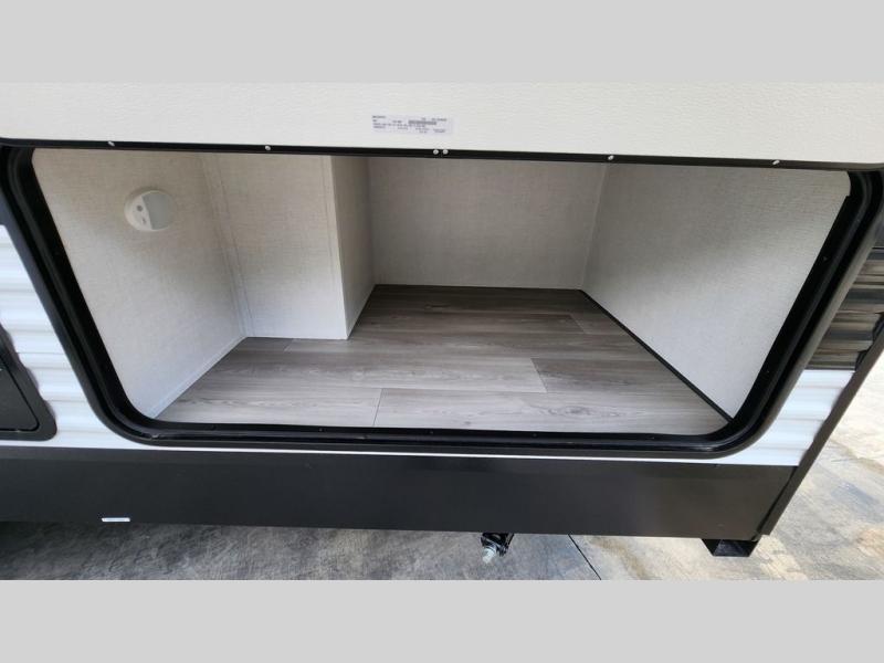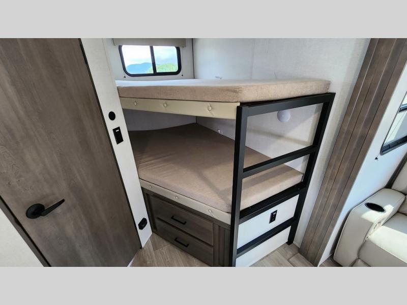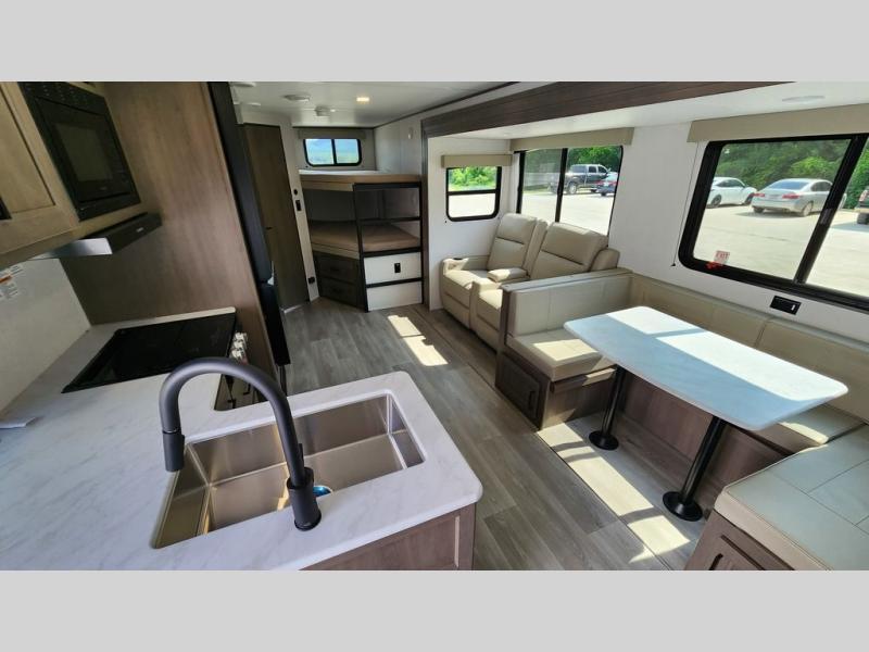 Get ready to take your travels to new heights with our incredible luxury travel trailer! The front bedroom has a queen bed, wardrobe, and overhead cabinets for all your favorite belongings, the perfect place to relax and recharge after a long day of adventure. The living room/kitchen combined area is equipped with a U-shaped dinette, three-burner cooktop, microwave, refrigerator, pantry, and 62” theater seating. Perfect for cooking up your favorite meals, entertaining friends and family, or simply relaxing and enjoying the comforts of home. The full bathroom is spacious and complete with a linen closet for added convenience. And with double-sized bunk beds featuring curtains and under-bunk storage, the kids will have their cozy retreat. But the adventure doesn't stop there! Outside, you'll find an exterior griddle with a 1.7 refrigerator, perfect for cooking up a storm in the great outdoors. And with a massive 19’ awning, you'll have plenty of shade and protection from the elements, plus, with two entry/exit doors and pass-through storage, you'll have easy access to the trailer and all your gear.