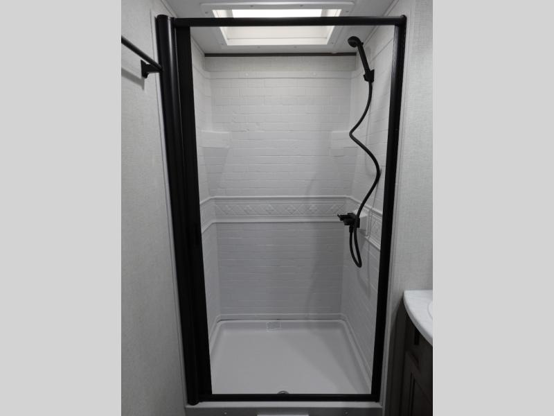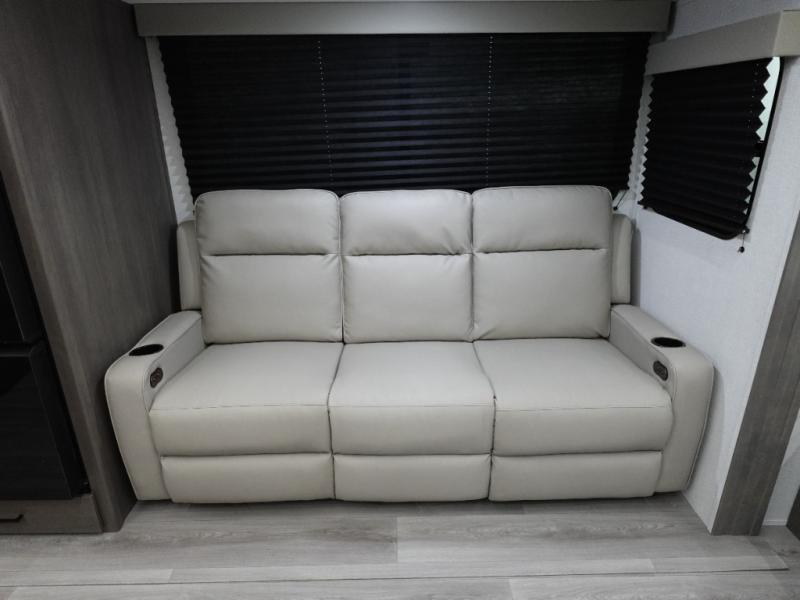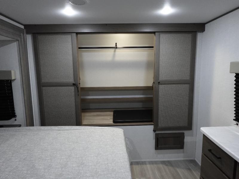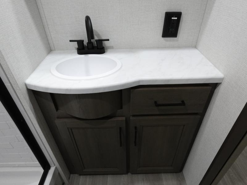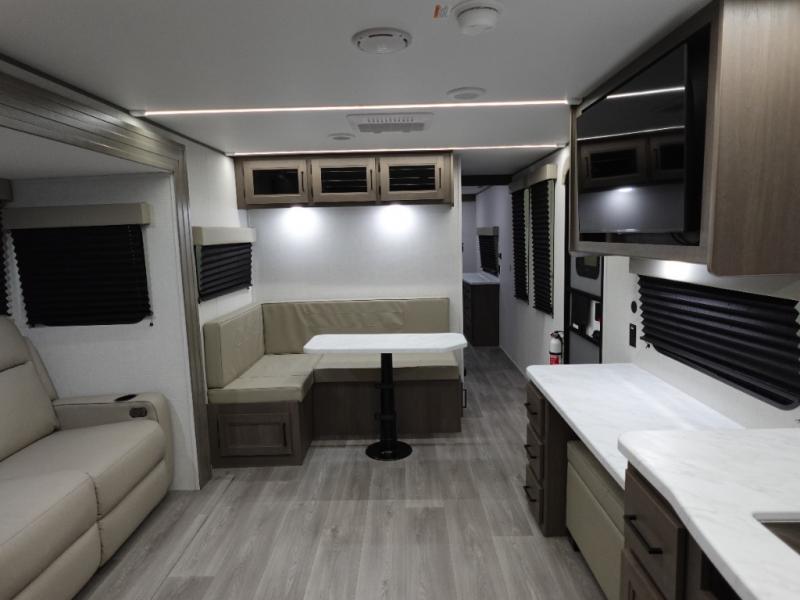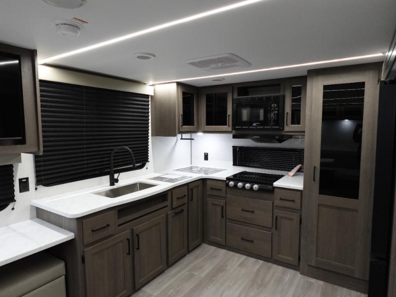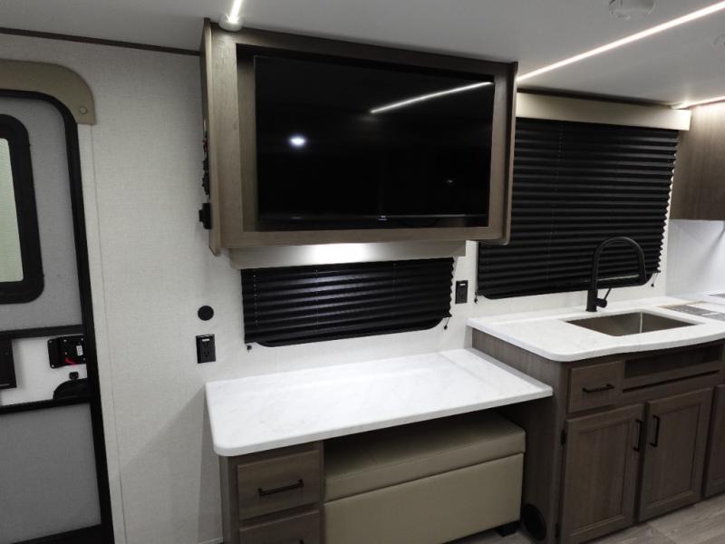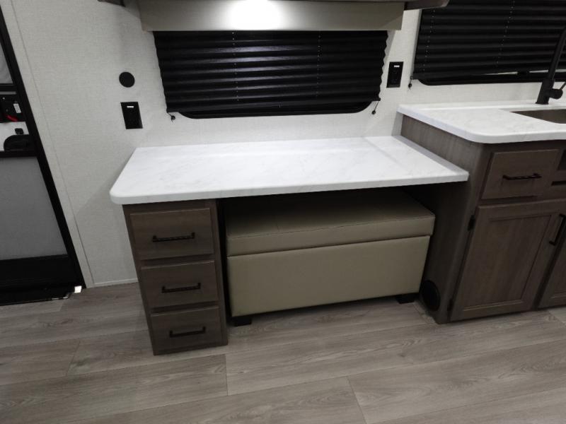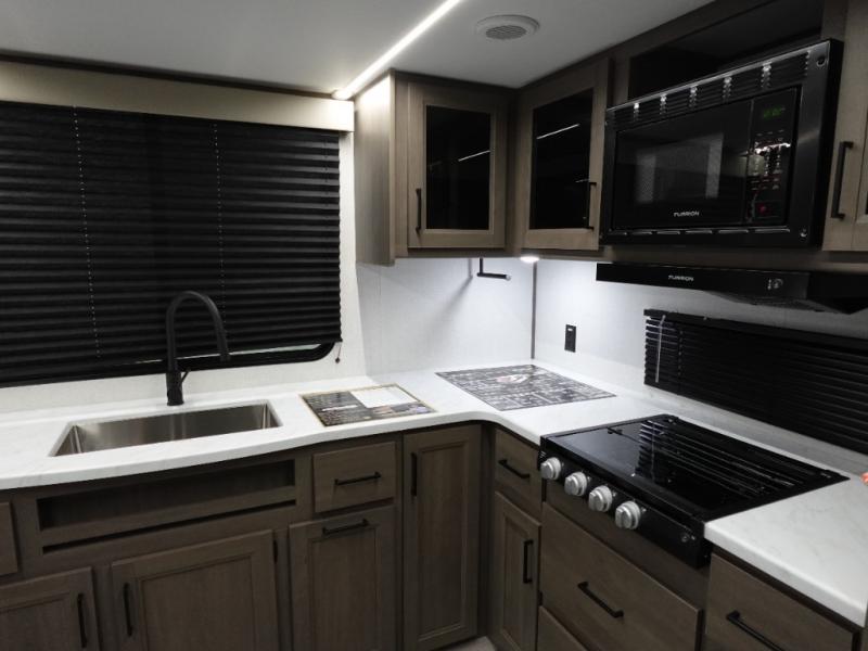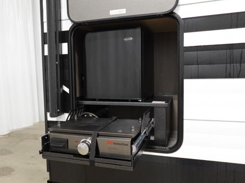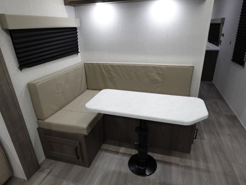 If you're looking for a cozy travel trailer for two, this is the one! You can sleep soundly each night on the king bed slide out, and you'll find plenty of storage in the front wardrobe. There is even washer and dryer prep if you choose to add those appliances. After you've freshened up in the full bath with a walk-in shower, you can head to the rear kitchen to make breakfast. There is ample counter space here, along with a three burner range and an air fryer/convection microwave, plus a pull-out trash can for easy clean up. The breakfast nook provides a fun place to dine together, and if you're needing additional sleeping space you can switch it out for the optional sleeper sofa. A theater seating slide also provides tons of comfort, especially since it's in perfect view of the 32" TV! This model also includes an exterior griddle with a 1.7 cu. ft. refrigerator, protected by the 21' power awning so you can cook in the shade!