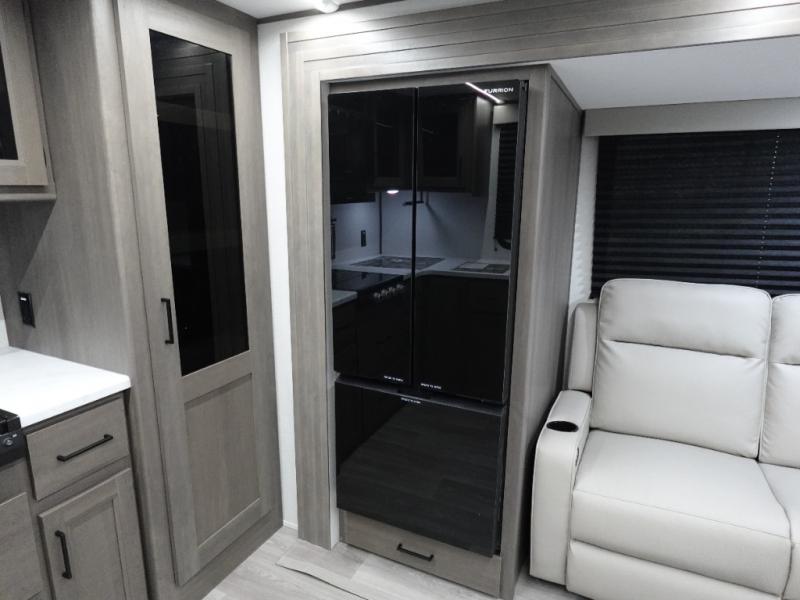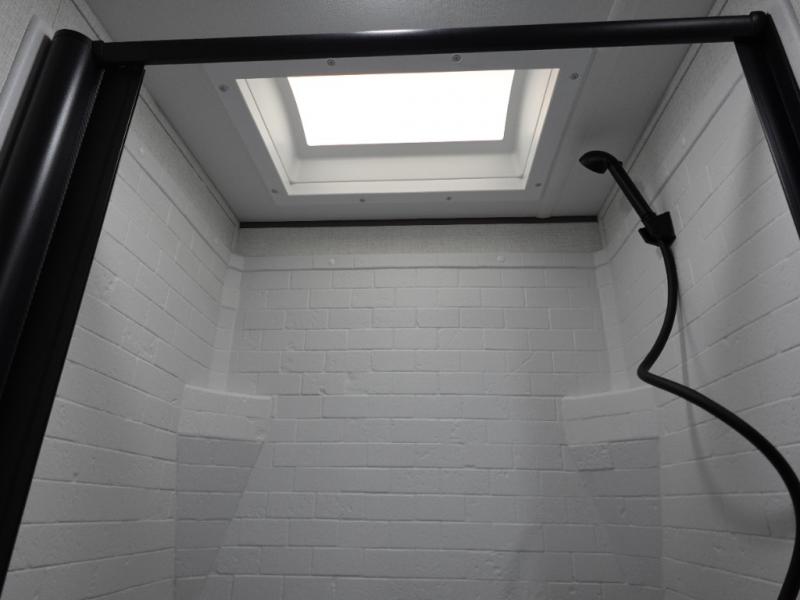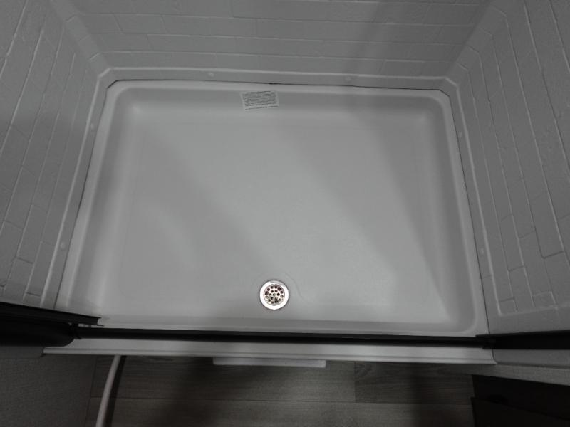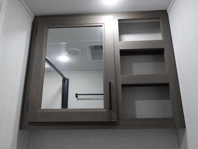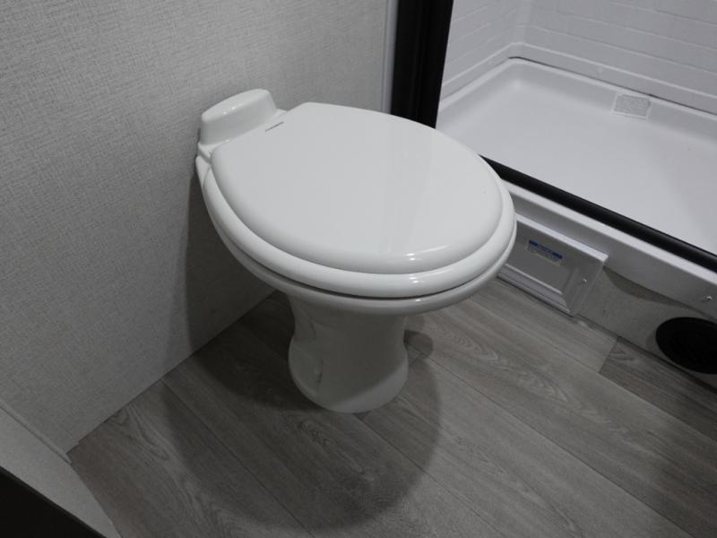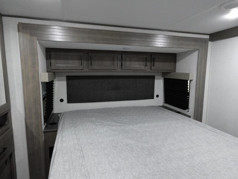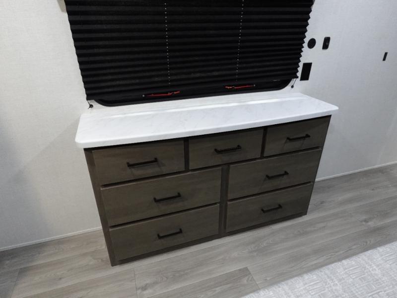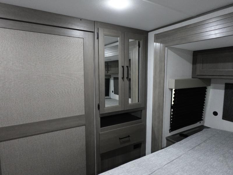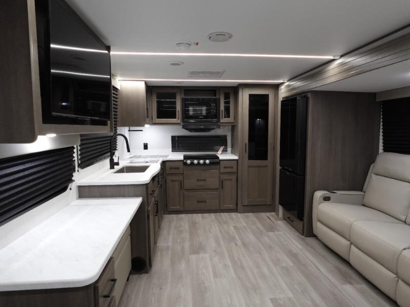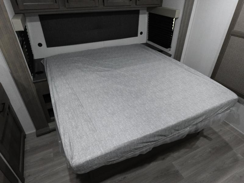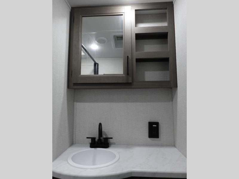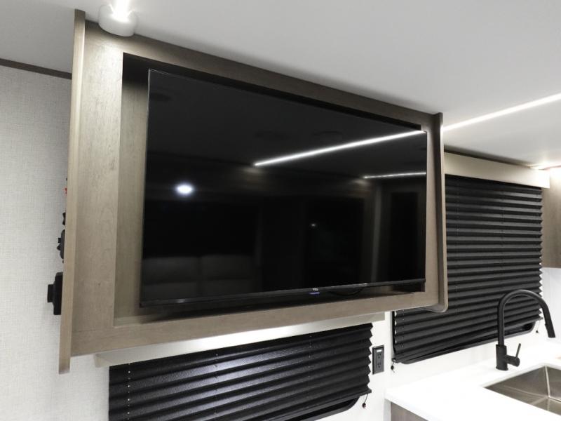 If you're looking for a cozy travel trailer for two, this is the one! You can sleep soundly each night on the king bed slide out, and you'll find plenty of storage in the front wardrobe. There is even washer and dryer prep if you choose to add those appliances. After you've freshened up in the full bath with a walk-in shower, you can head to the rear kitchen to make breakfast. There is ample counter space here, along with a three burner range and an air fryer/convection microwave, plus a pull-out trash can for easy clean up. The breakfast nook provides a fun place to dine together, and if you're needing additional sleeping space you can switch it out for the optional sleeper sofa. A theater seating slide also provides tons of comfort, especially since it's in perfect view of the 32" TV! This model also includes an exterior griddle with a 1.7 cu. ft. refrigerator, protected by the 21' power awning so you can cook in the shade!