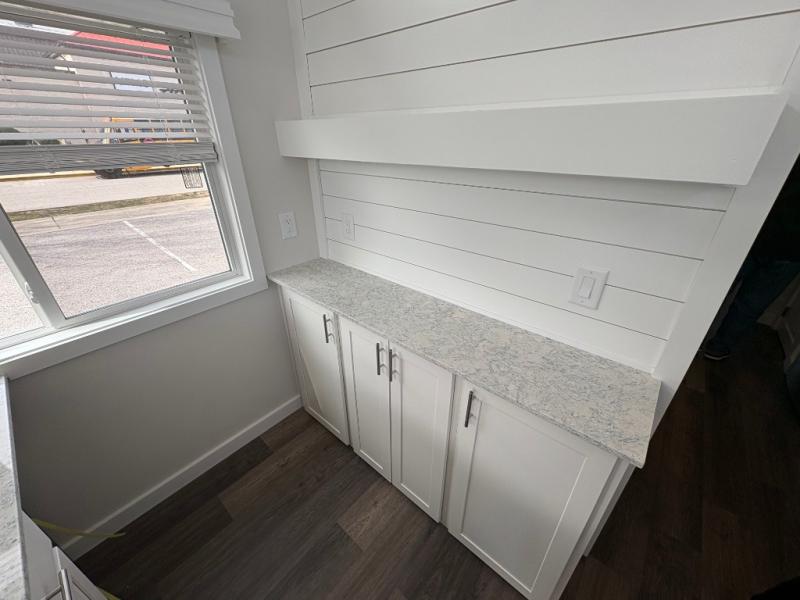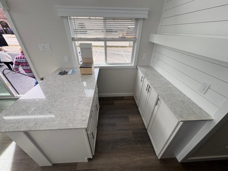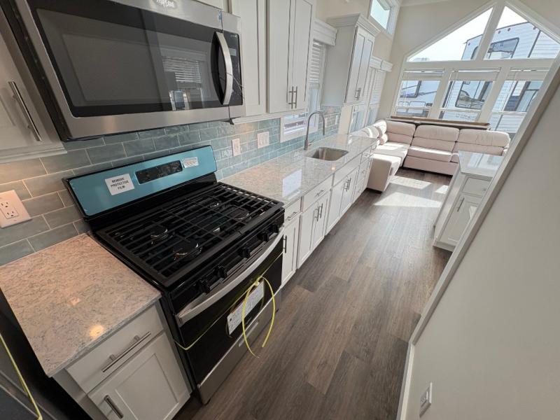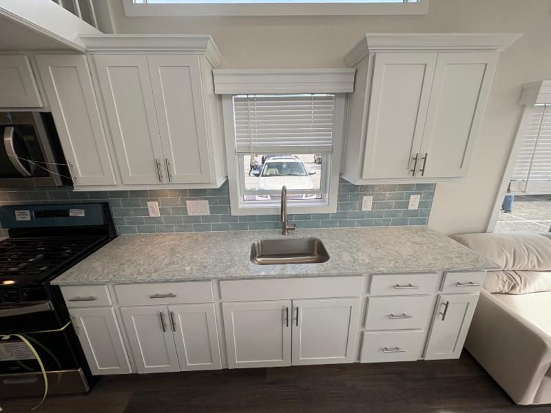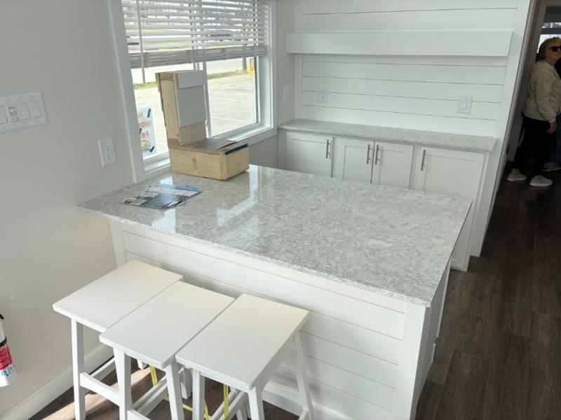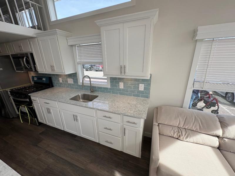 The Bay View double loft version of the 300L Vae-Cation base model provides you double loft spaces over the rear master bedroom and it extends over the kitchen area as well. You can easily access the loft with a staircase between the master bedroom and full bath. The loft is perfect for added sleeping space, play space for children, or added storage. The master bedroom provides ample natural lighting, storage, and will easily fit a queen bed. The kitchen area has all the room you need to cook your favorite meals and snacks for your family and friends, with space for a full-sized refrigerator/freezer, microwave oven, stove, sink and more. This K2 kitchen features a peninsula that is attached to the kitchen counter where you can easily enjoy meals, or use as added prep space while cooking. The full sized bath features a walk-in shower, toilet, and vanity with sink, plus plenty of natural lighting as well. You can choose from a long list of optional items to customize your new Bay View with a furniture package, additional appliances like a dishwasher or refrigerator with ice maker, a pillowtop mattress, vessel sink in bath, an exterior porch, or even Trex decking material in place of treated wood, and so much more!