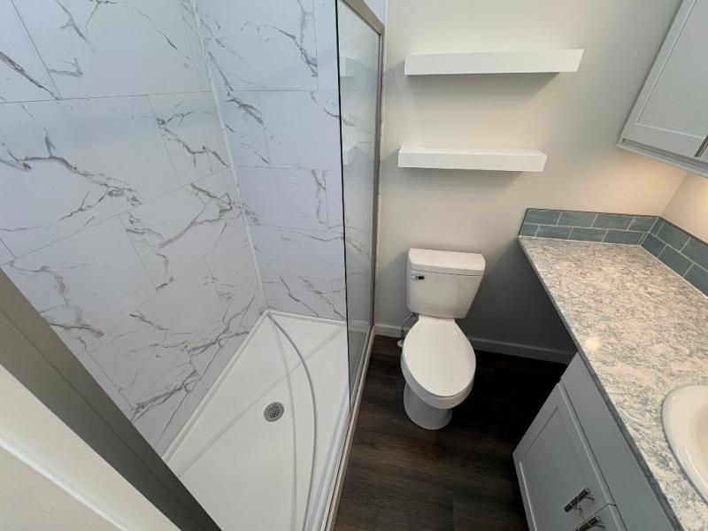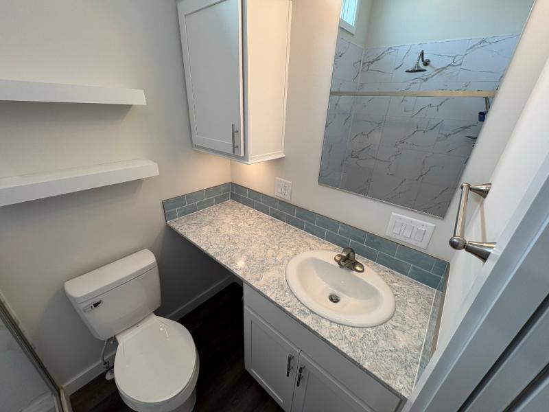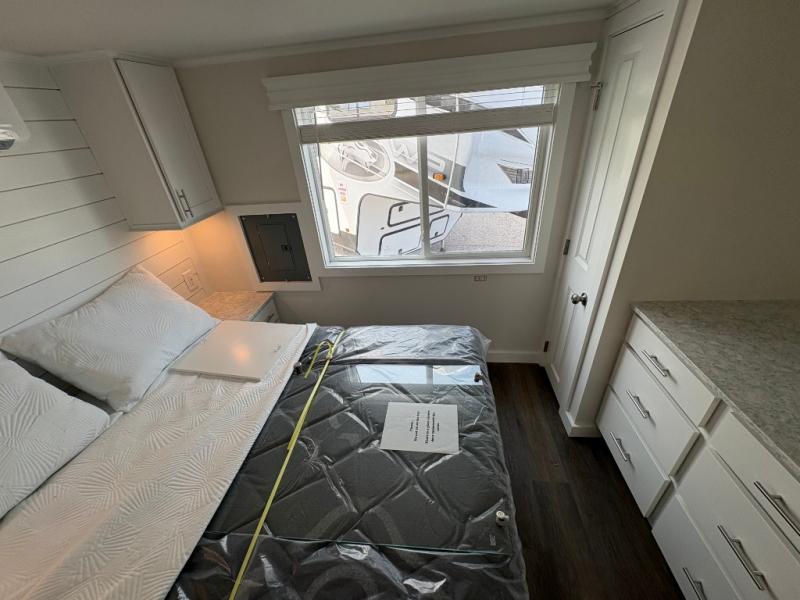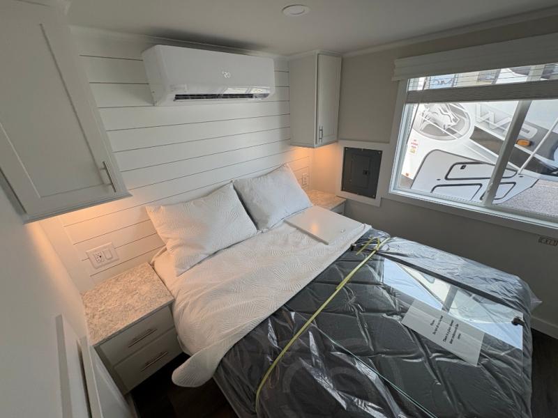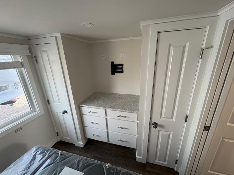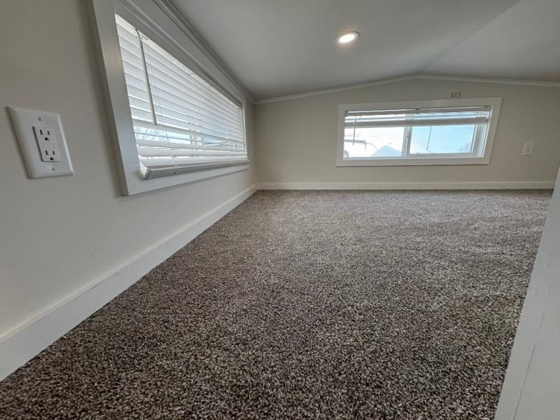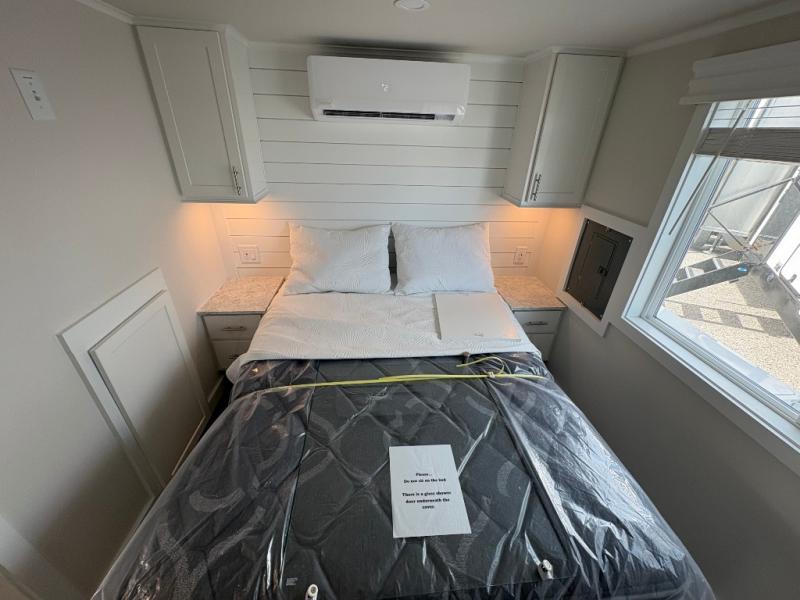The Bay View double loft version of the 300L Vae-Cation base model provides you double loft spaces over the rear master bedroom and it extends over the kitchen area as well. You can easily access the loft with a staircase between the master bedroom and full bath. The loft is perfect for added sleeping space, play space for children, or added storage. The master bedroom provides ample natural lighting, storage, and will easily fit a queen bed. The kitchen area has all the room you need to cook your favorite meals and snacks for your family and friends, with space for a full-sized refrigerator/freezer, microwave oven, stove, sink and more. This K2 kitchen features a peninsula that is attached to the kitchen counter where you can easily enjoy meals, or use as added prep space while cooking. The full sized bath features a walk-in shower, toilet, and vanity with sink, plus plenty of natural lighting as well. You can choose from a long list of optional items to customize your new Bay View with a furniture package, additional appliances like a dishwasher or refrigerator with ice maker, a pillowtop mattress, vessel sink in bath, an exterior porch, or even Trex decking material in place of treated wood, and so much more!