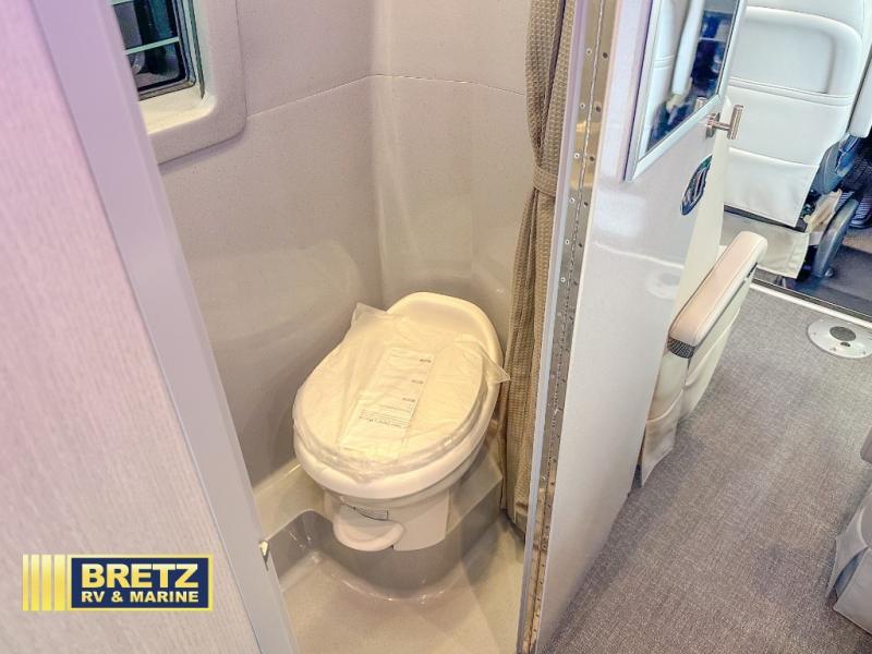 Whether you travel to see mountains, beaches or friends, this coach will provide all the luxury and functionality you will want while on the road! There are two captain's chairs plus two additional chairs right behind with a table to dine at once at your destination. You will find five more seatbelts in the rear seating when you plan a trip for everyone to tailgate at the big game, listen to music at a festival, or watch a club sport in another city. When you need to sleep two, the power sofa bed offers just that, and the private enclosed wet bath also includes a window and privacy shade. The cook can make meals using the galley kitchen with a farmhouse-style sink, combo microwave/convection/air fryer and a two-burner induction cooktop.
