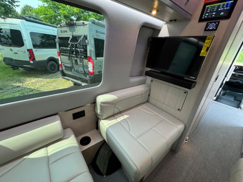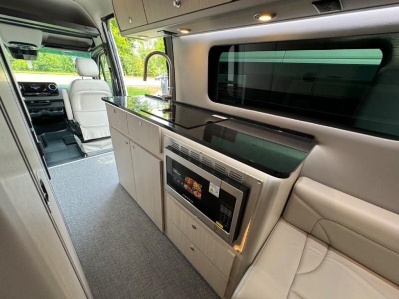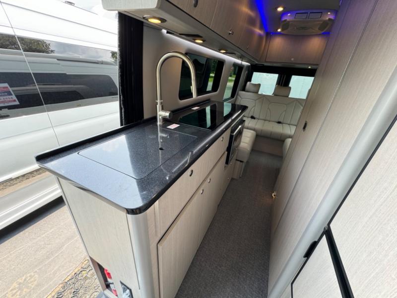 Whether you travel to see mountains, beaches or friends, this coach will provide all the luxury and functionality you will want while on the road! There are two captain's chairs plus two additional chairs right behind with a table to dine at once at your destination. You will find five more seatbelts in the rear seating when you plan a trip for everyone to tailgate at the big game, listen to music at a festival, or watch a club sport in another city. When you need to sleep two, the power sofa bed offers just that, and the private enclosed wet bath also includes a window and privacy shade. The cook can make meals using the galley kitchen with a farmhouse-style sink, combo microwave/convection/air fryer and a two-burner induction cooktop.
