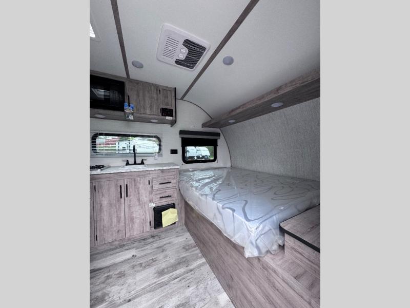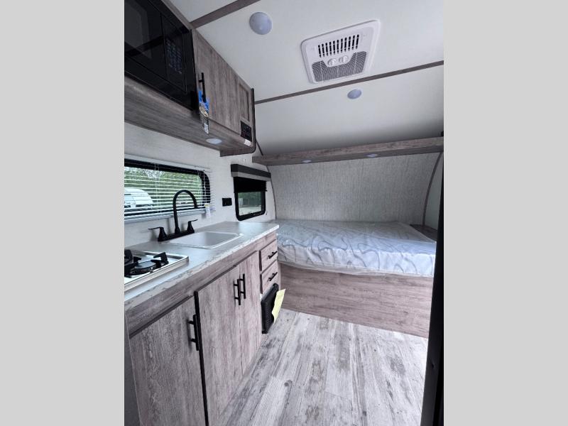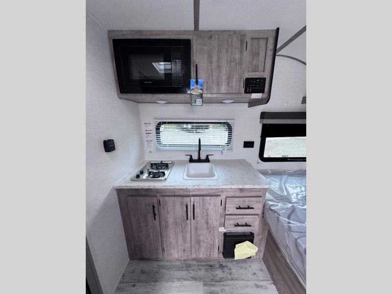 This travel trailer is ideal for families seeking adventure and relaxation! The incredible microwave and refrigerator simplify meal planning, while the two-burner cooktop lets you cook up delicious meals for the whole family. The bunk beds are a hit with kids, providing a fun and cozy sleeping space, while the comfortable bed is perfect for parents to unwind. Ample storage space is available, including flip-up storage and overhead shelves, keeping your belongings organized and within reach.