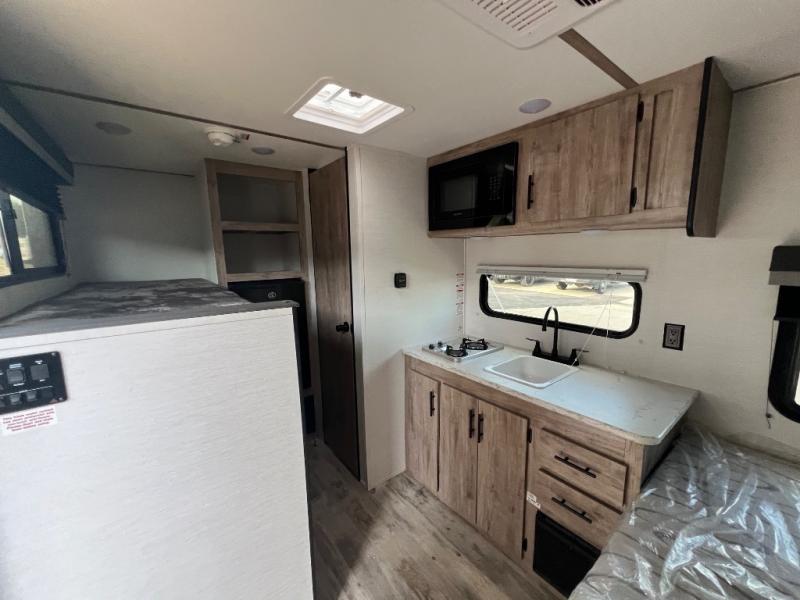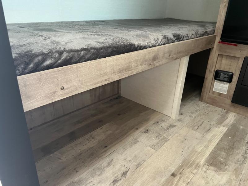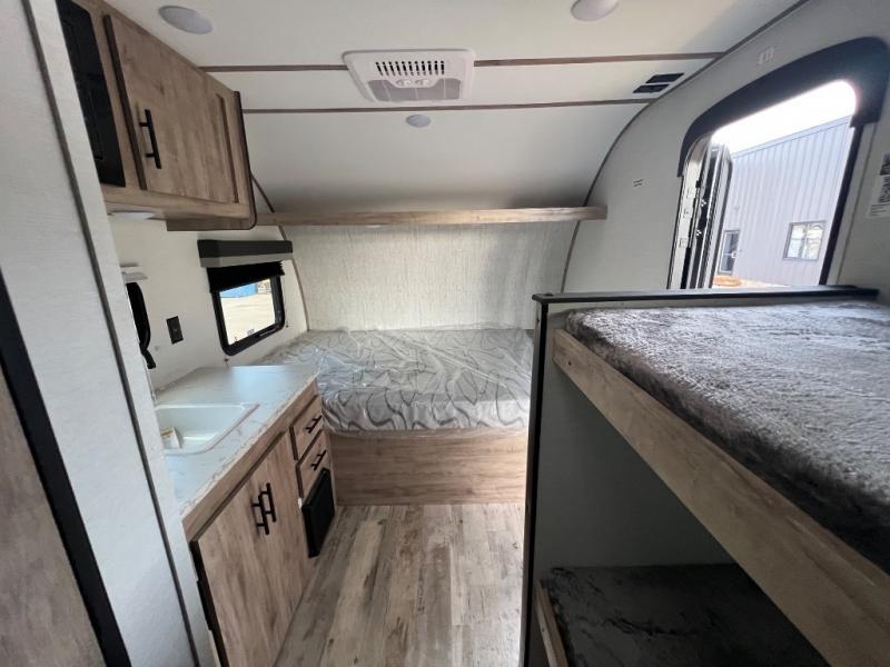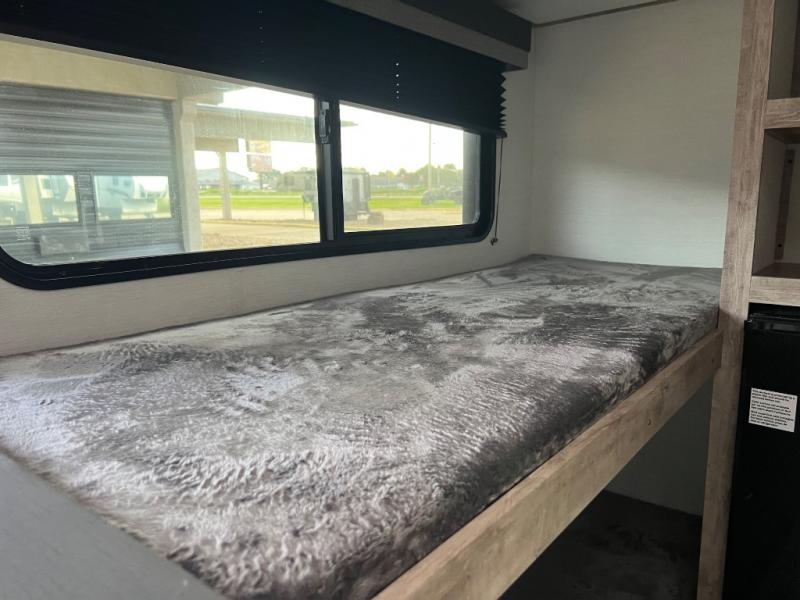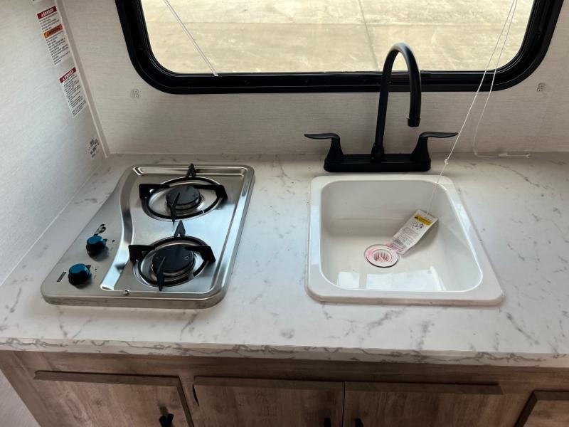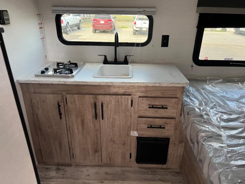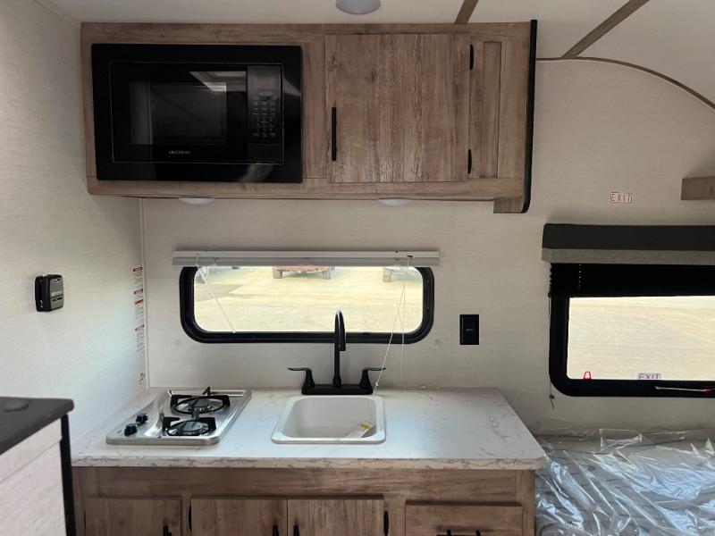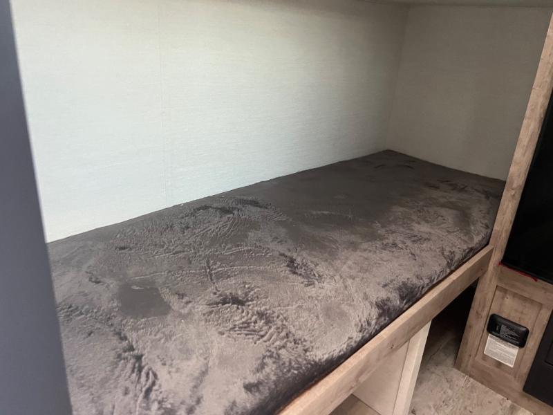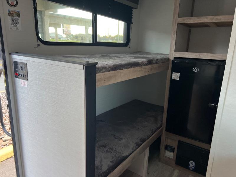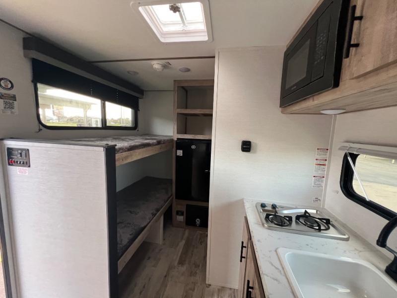 This travel trailer is ideal for families seeking adventure and relaxation! The incredible microwave and refrigerator simplify meal planning, while the two-burner cooktop lets you cook up delicious meals for the whole family. The bunk beds are a hit with kids, providing a fun and cozy sleeping space, while the comfortable bed is perfect for parents to unwind. Ample storage space is available, including flip-up storage and overhead shelves, keeping your belongings organized and within reach.