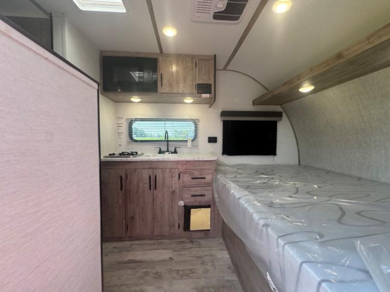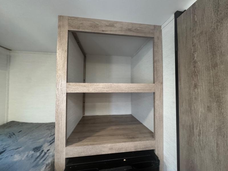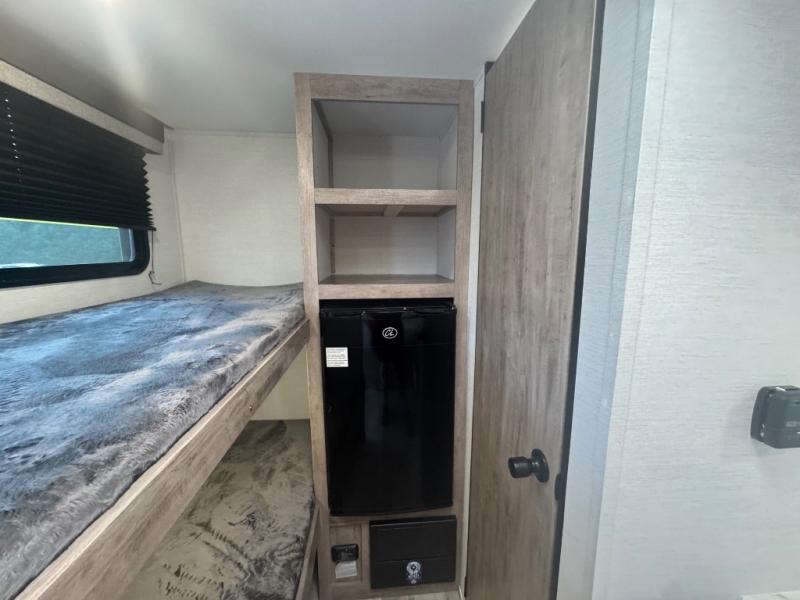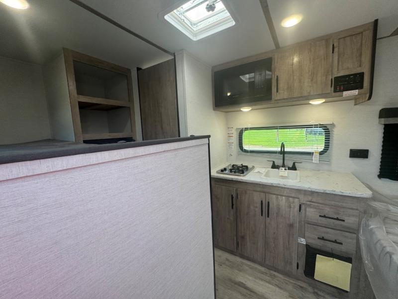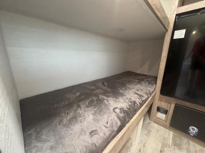 This travel trailer is ideal for families seeking adventure and relaxation! The incredible microwave and refrigerator simplify meal planning, while the two-burner cooktop lets you cook up delicious meals for the whole family. The bunk beds are a hit with kids, providing a fun and cozy sleeping space, while the comfortable bed is perfect for parents to unwind. Ample storage space is available, including flip-up storage and overhead shelves, keeping your belongings organized and within reach.