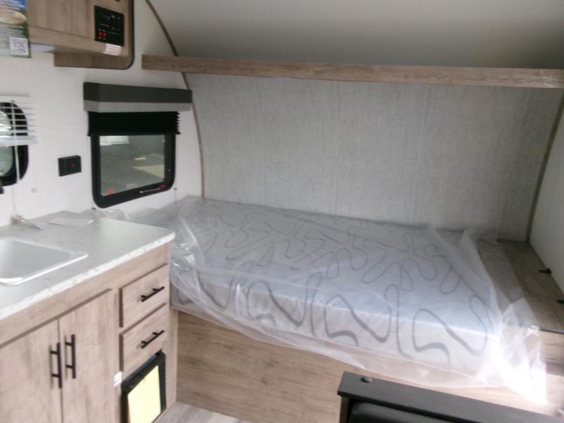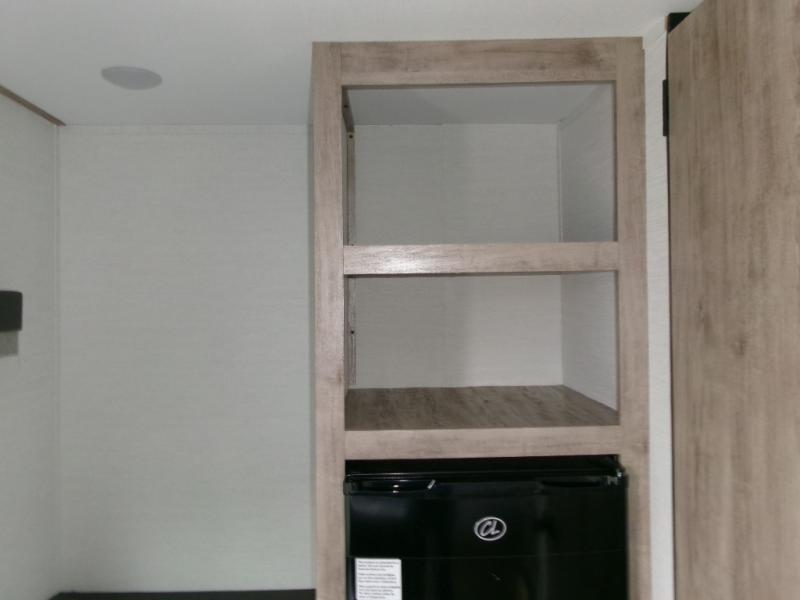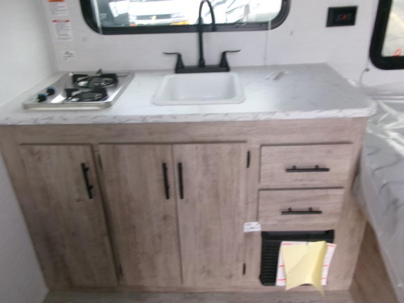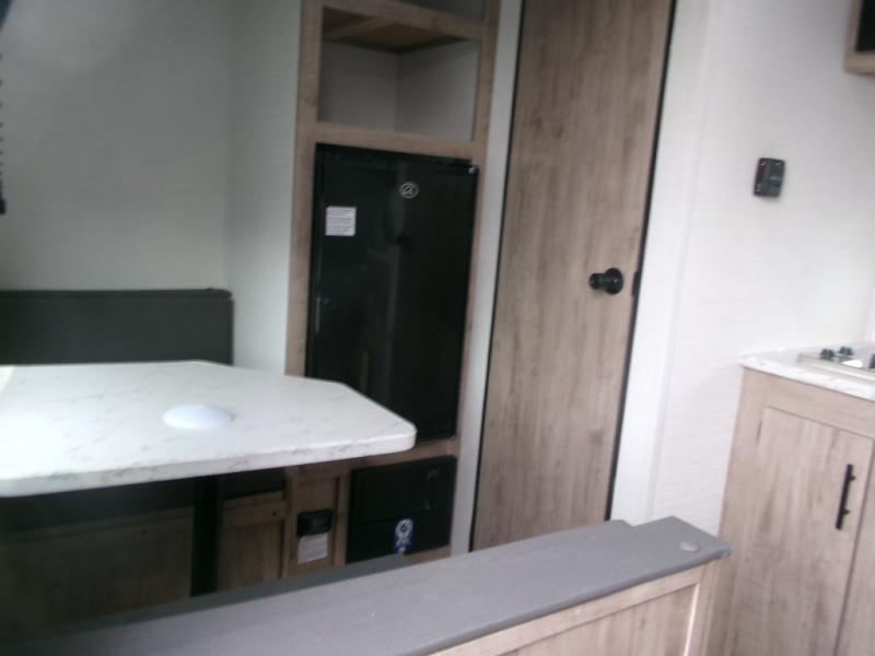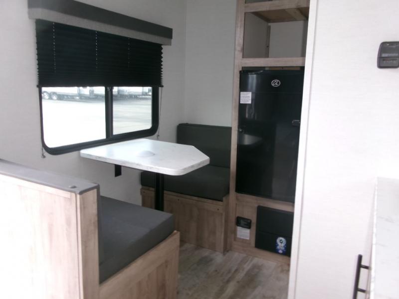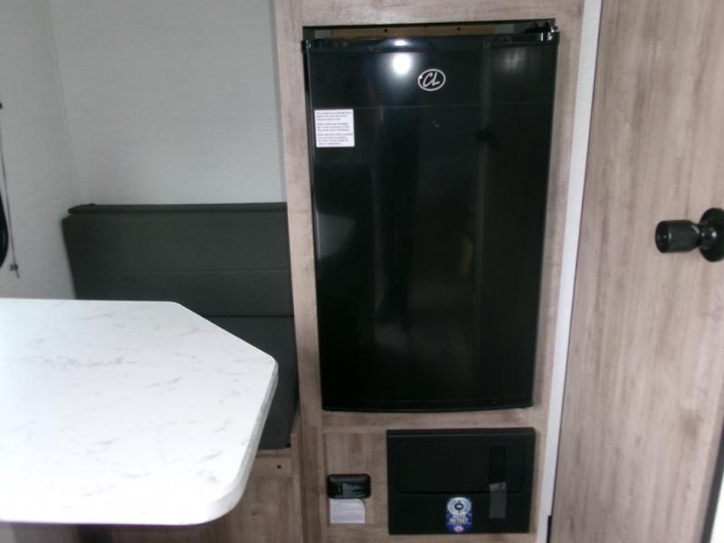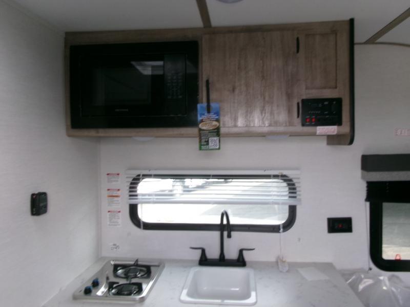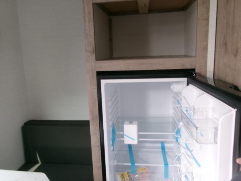 You will love these travel trailer appliances! The sleek microwave and spacious refrigerator make meal prep effortless, while the convenient two-burner cooktop lets you cook up tasty meals on the go. The cozy dinette is perfect for savoring meals or enjoying quality time, and the plush bed ensures a rejuvenating night's sleep. Thoughtful storage solutions, including flip-up storage and overhead shelves, keep your belongings tidy and easily accessible. This travel trailer is perfect for anyone seeking a peaceful and adventurous retreat. With its clever design and functional features, it's easy to tow and park, allowing you to explore scenic destinations with ease.