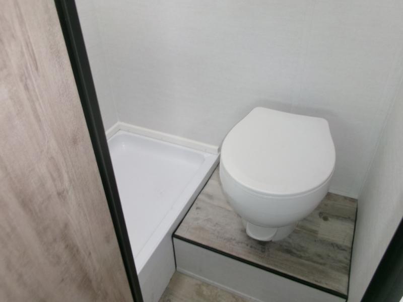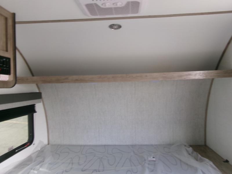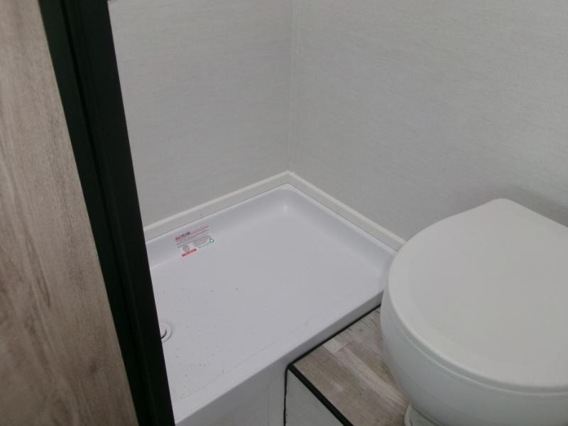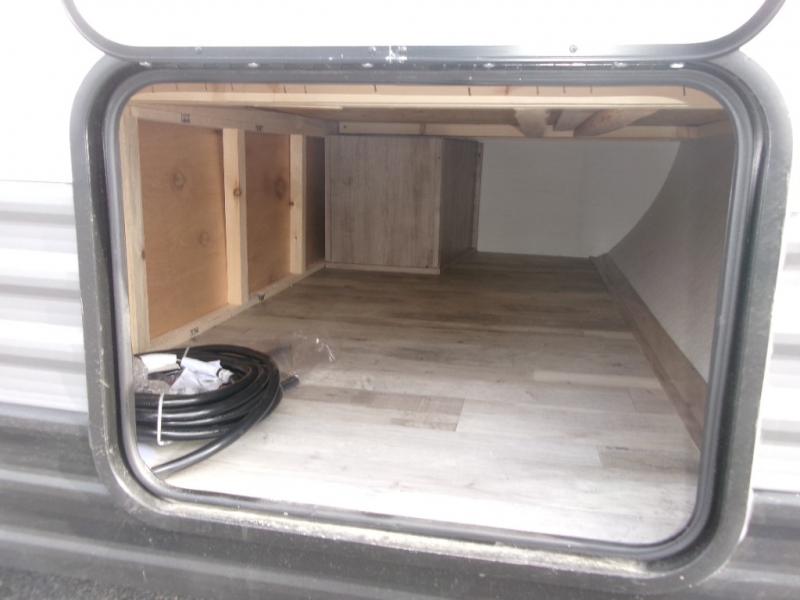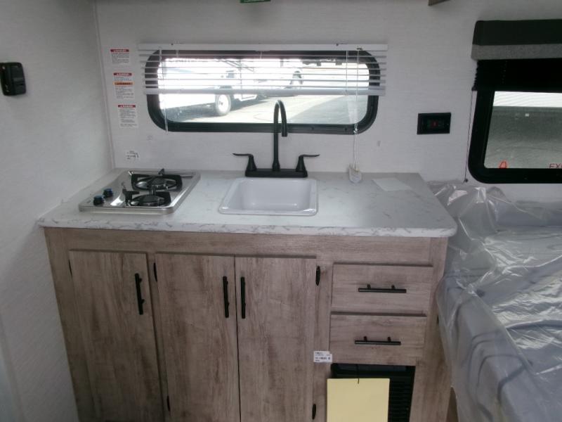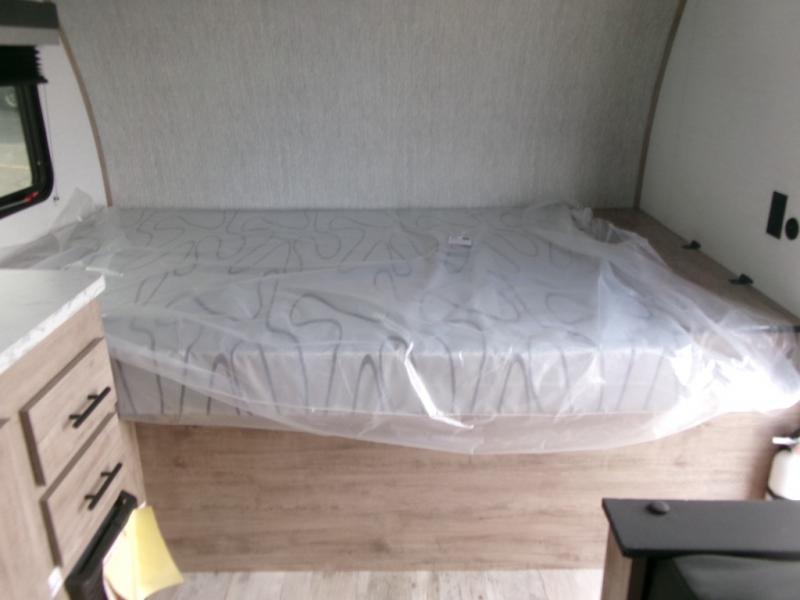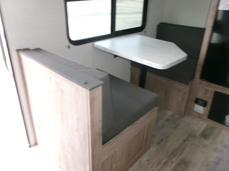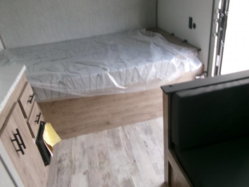 You will love these travel trailer appliances! The sleek microwave and spacious refrigerator make meal prep effortless, while the convenient two-burner cooktop lets you cook up tasty meals on the go. The cozy dinette is perfect for savoring meals or enjoying quality time, and the plush bed ensures a rejuvenating night's sleep. Thoughtful storage solutions, including flip-up storage and overhead shelves, keep your belongings tidy and easily accessible. This travel trailer is perfect for anyone seeking a peaceful and adventurous retreat. With its clever design and functional features, it's easy to tow and park, allowing you to explore scenic destinations with ease.
