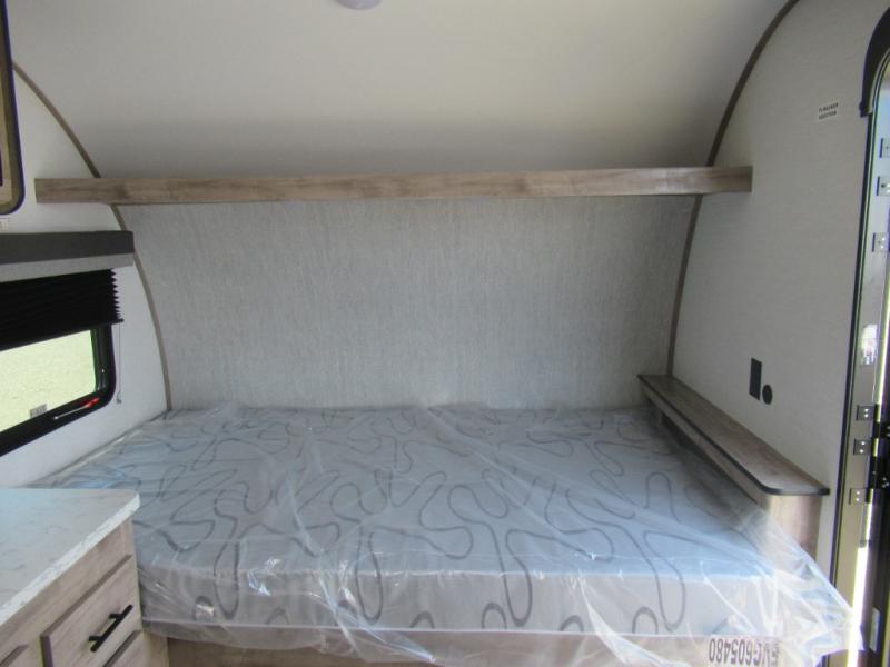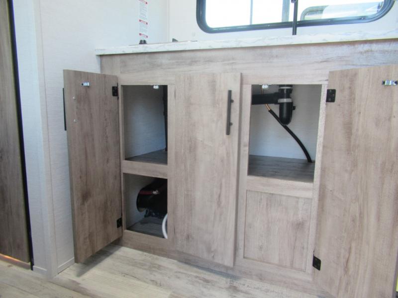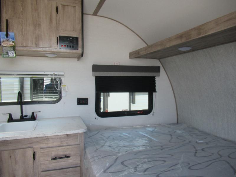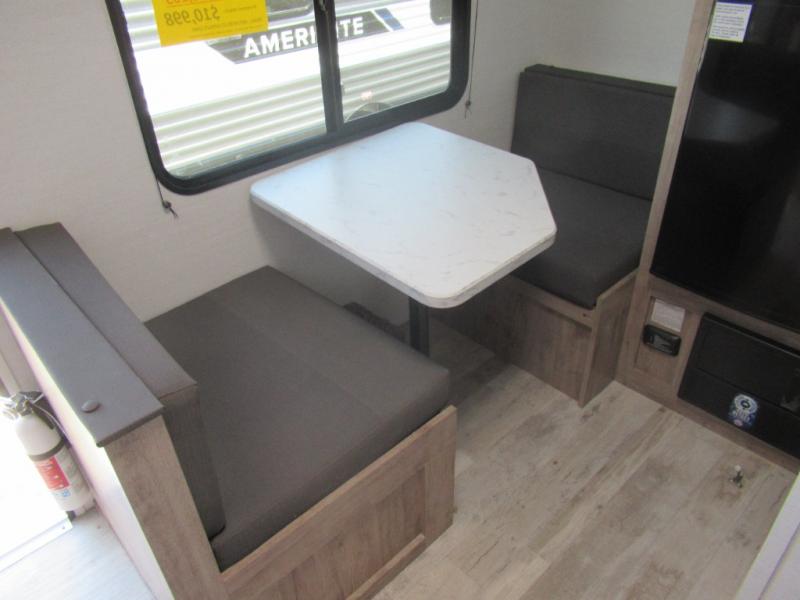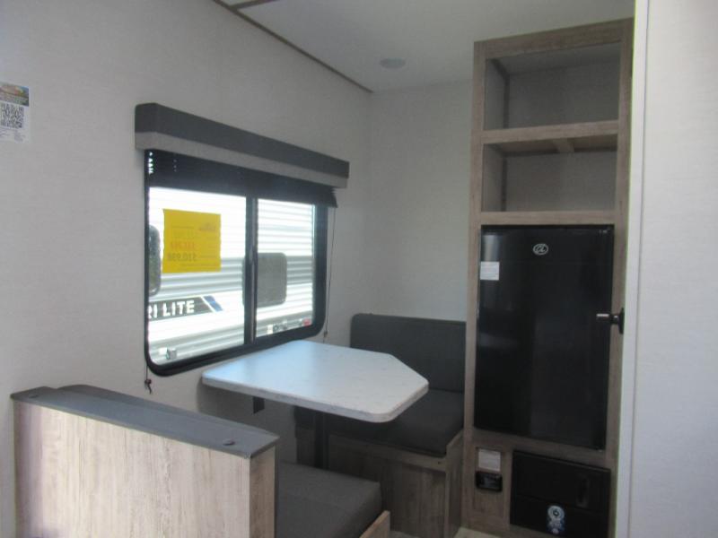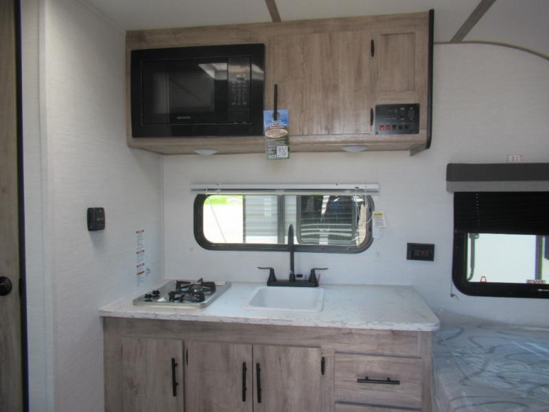 You will love these travel trailer appliances! The sleek microwave and spacious refrigerator make meal prep effortless, while the convenient two-burner cooktop lets you cook up tasty meals on the go. The cozy dinette is perfect for savoring meals or enjoying quality time, and the plush bed ensures a rejuvenating night's sleep. Thoughtful storage solutions, including flip-up storage and overhead shelves, keep your belongings tidy and easily accessible. This travel trailer is perfect for anyone seeking a peaceful and adventurous retreat. With its clever design and functional features, it's easy to tow and park, allowing you to explore scenic destinations with ease.