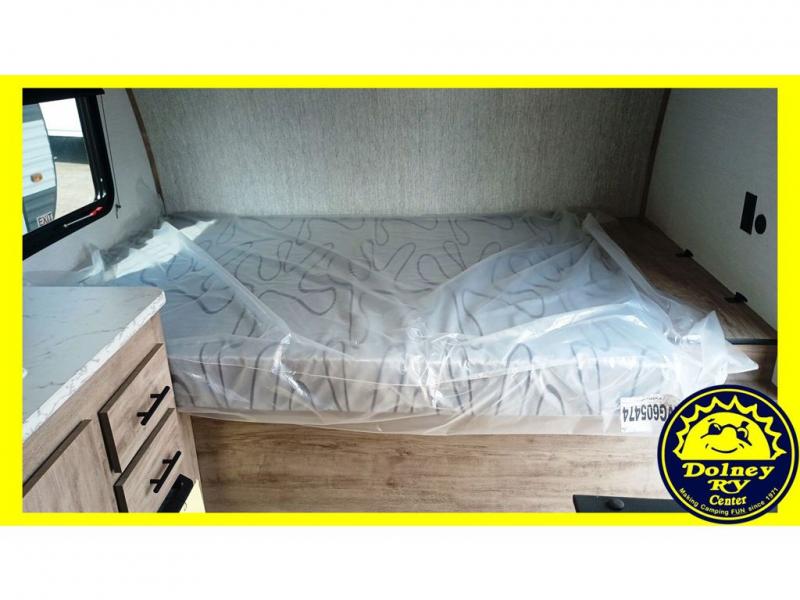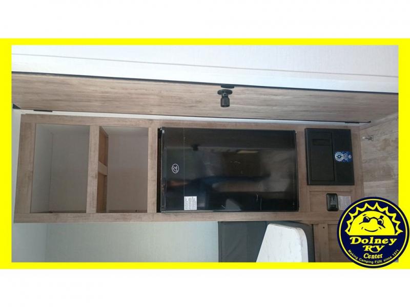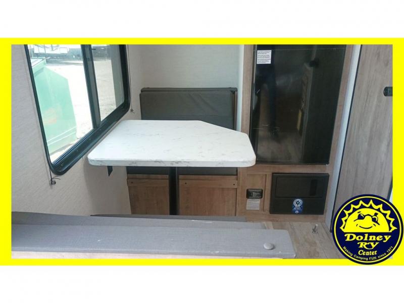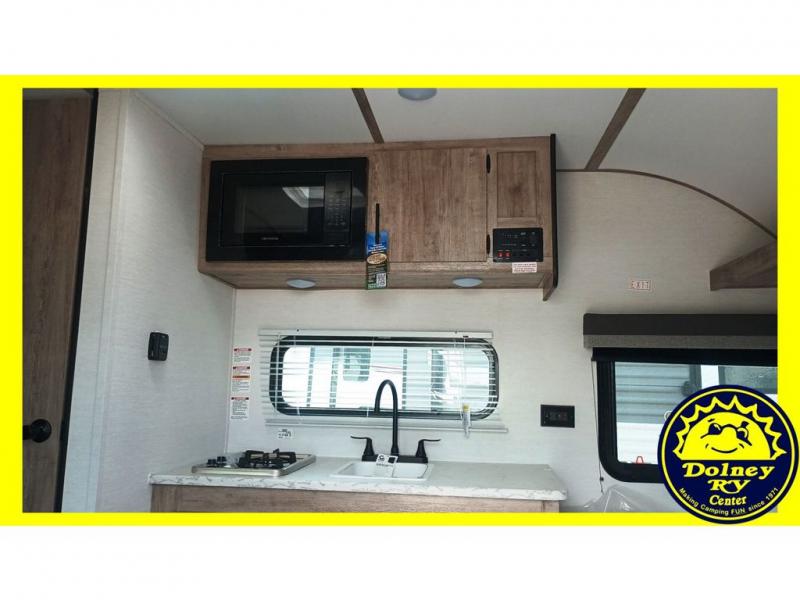 You will love these travel trailer appliances! The sleek microwave and spacious refrigerator make meal prep effortless, while the convenient two-burner cooktop lets you cook up tasty meals on the go. The cozy dinette is perfect for savoring meals or enjoying quality time, and the plush bed ensures a rejuvenating night's sleep. Thoughtful storage solutions, including flip-up storage and overhead shelves, keep your belongings tidy and easily accessible. This travel trailer is perfect for anyone seeking a peaceful and adventurous retreat. With its clever design and functional features, it's easy to tow and park, allowing you to explore scenic destinations with ease.