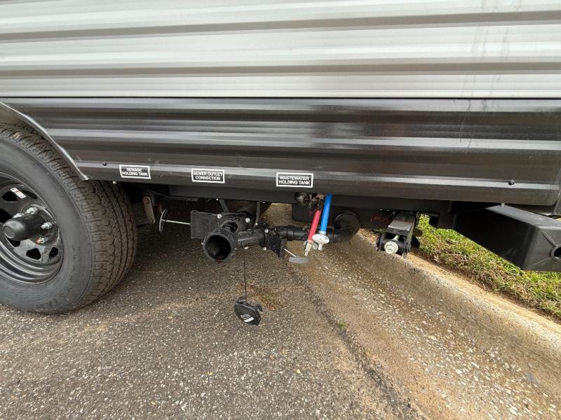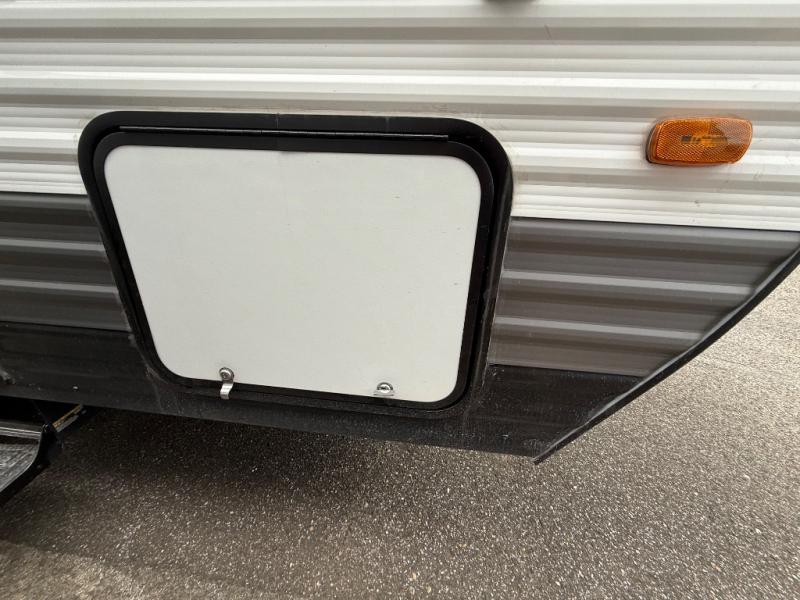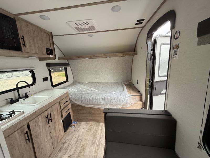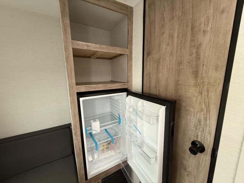 You will love these travel trailer appliances! The sleek microwave and spacious refrigerator make meal prep effortless, while the convenient two-burner cooktop lets you cook up tasty meals on the go. The cozy dinette is perfect for savoring meals or enjoying quality time, and the plush bed ensures a rejuvenating night's sleep. Thoughtful storage solutions, including flip-up storage and overhead shelves, keep your belongings tidy and easily accessible. This travel trailer is perfect for anyone seeking a peaceful and adventurous retreat. With its clever design and functional features, it's easy to tow and park, allowing you to explore scenic destinations with ease.