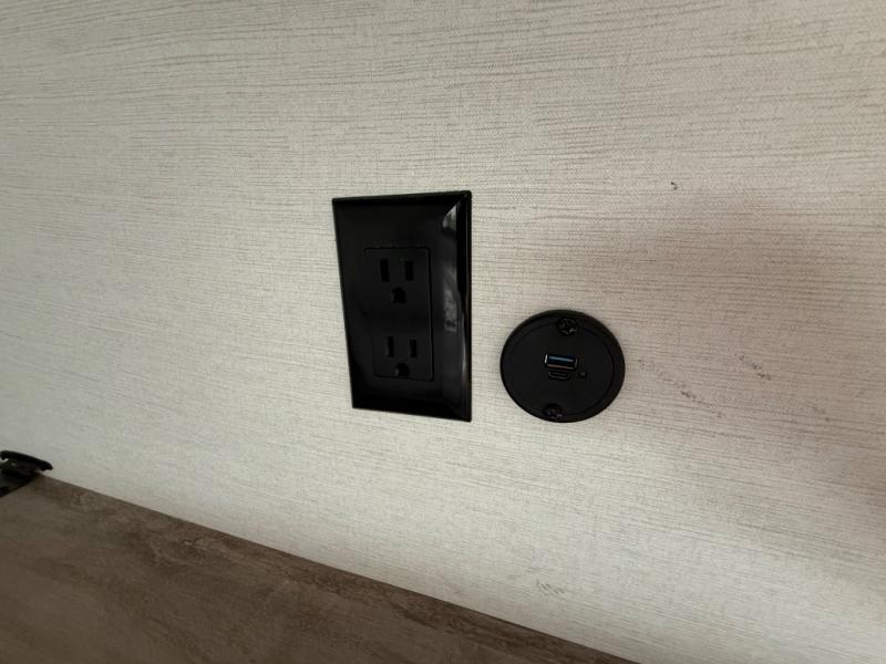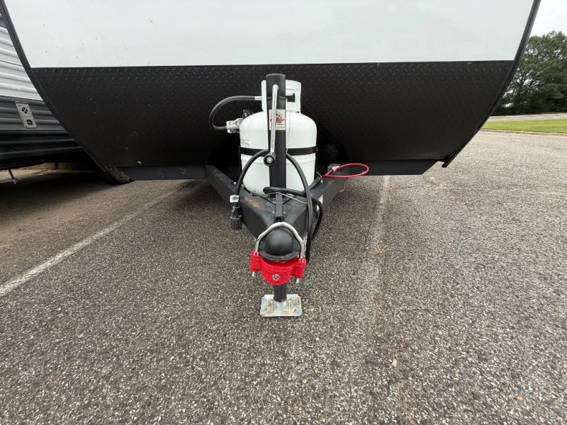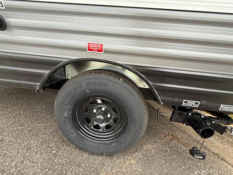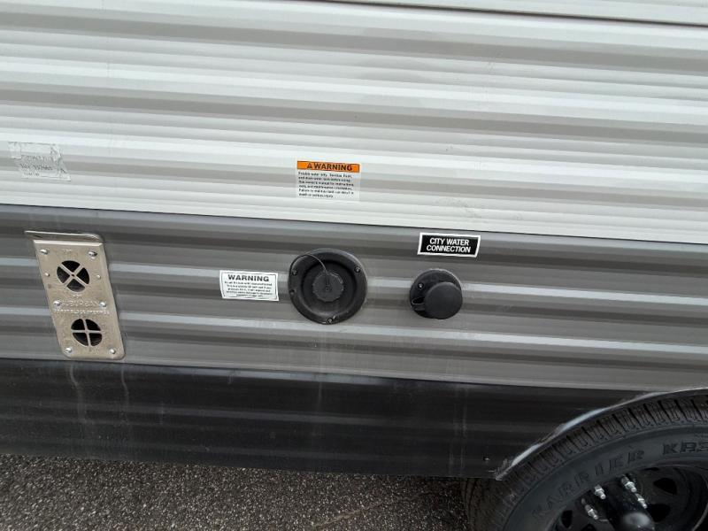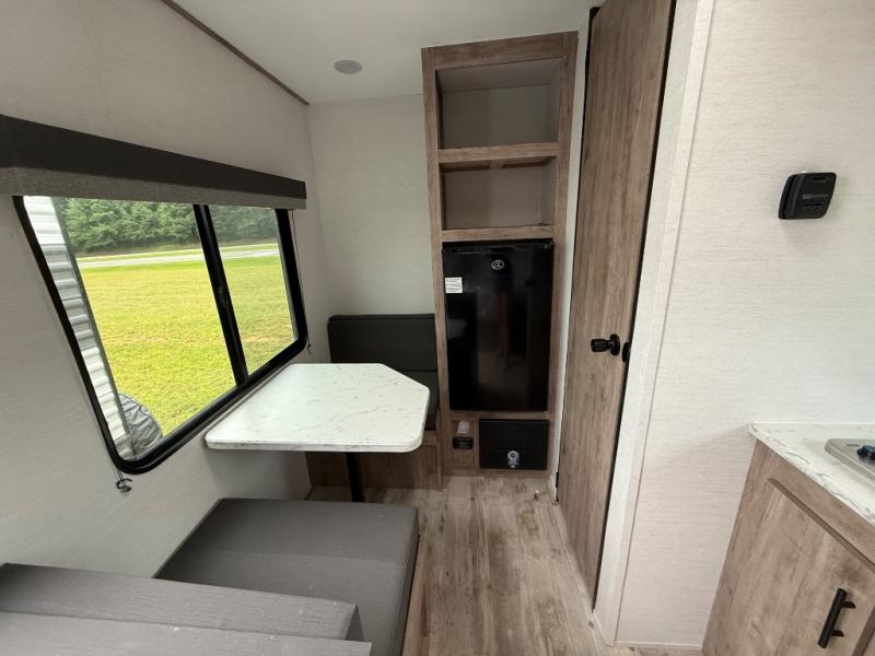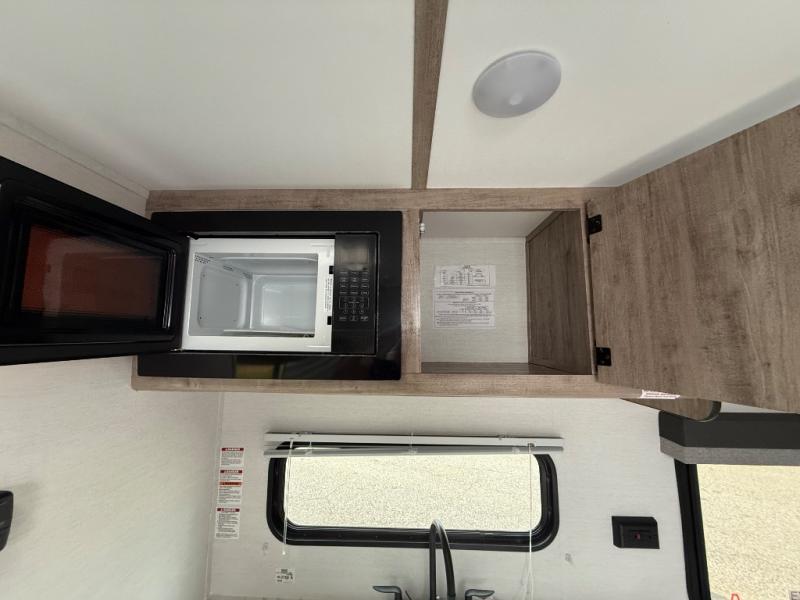 You will love these travel trailer appliances! The sleek microwave and spacious refrigerator make meal prep effortless, while the convenient two-burner cooktop lets you cook up tasty meals on the go. The cozy dinette is perfect for savoring meals or enjoying quality time, and the plush bed ensures a rejuvenating night's sleep. Thoughtful storage solutions, including flip-up storage and overhead shelves, keep your belongings tidy and easily accessible. This travel trailer is perfect for anyone seeking a peaceful and adventurous retreat. With its clever design and functional features, it's easy to tow and park, allowing you to explore scenic destinations with ease.