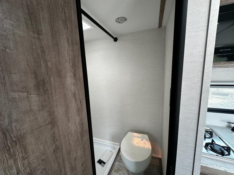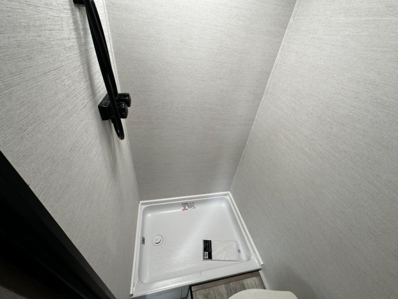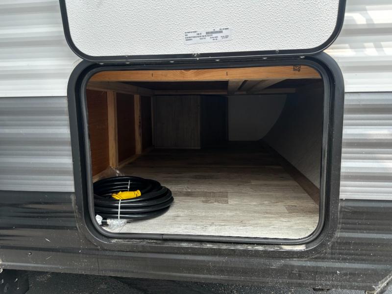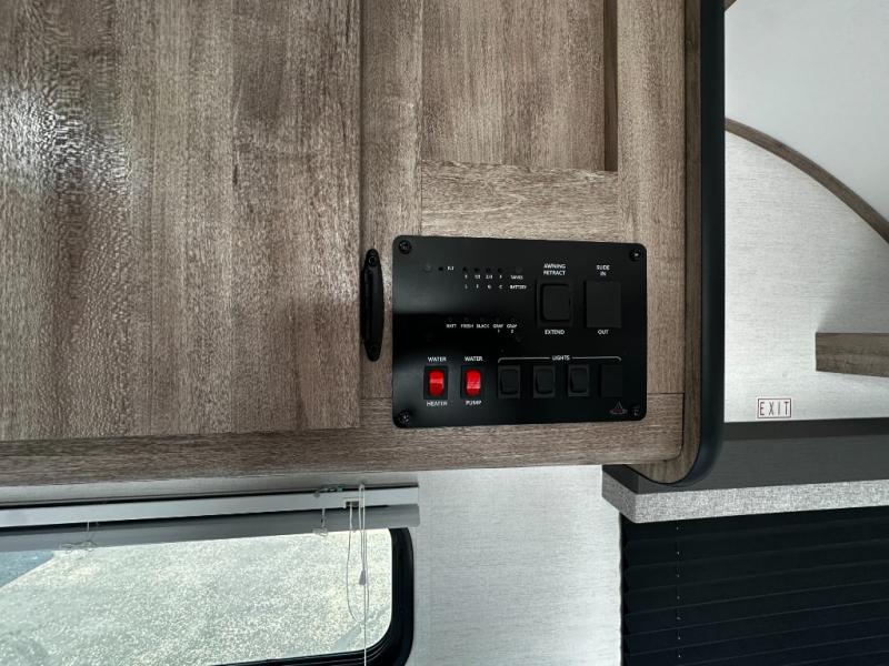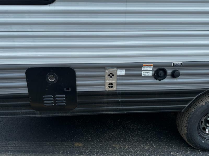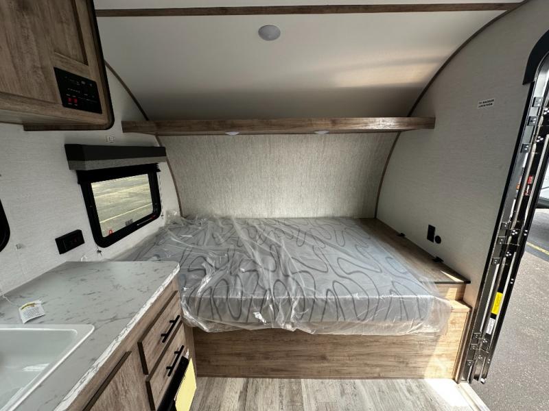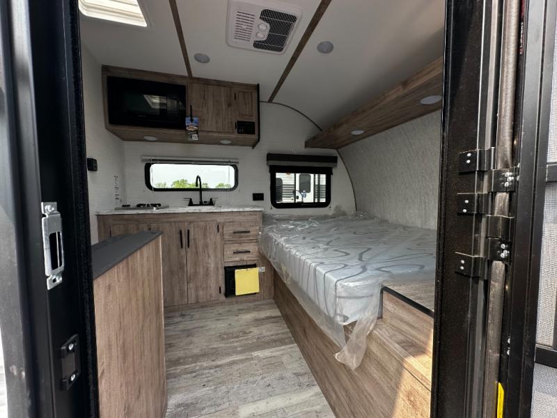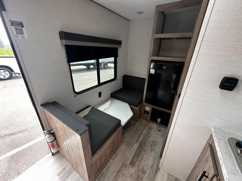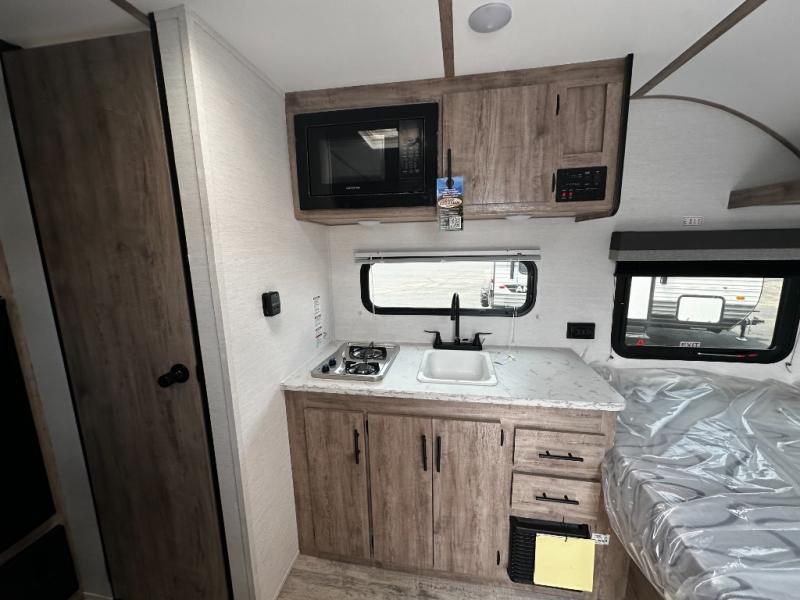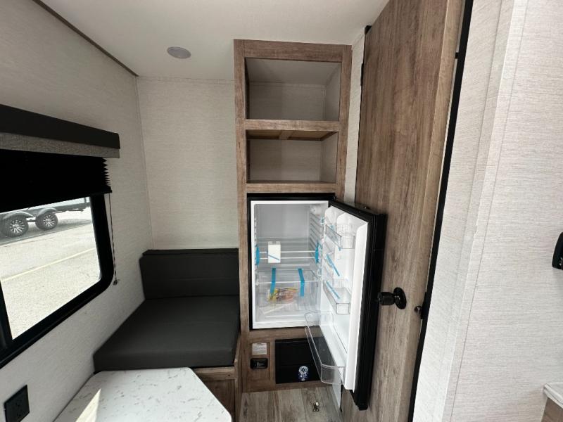 You will love these travel trailer appliances! The sleek microwave and spacious refrigerator make meal prep effortless, while the convenient two-burner cooktop lets you cook up tasty meals on the go. The cozy dinette is perfect for savoring meals or enjoying quality time, and the plush bed ensures a rejuvenating night's sleep. Thoughtful storage solutions, including flip-up storage and overhead shelves, keep your belongings tidy and easily accessible. This travel trailer is perfect for anyone seeking a peaceful and adventurous retreat. With its clever design and functional features, it's easy to tow and park, allowing you to explore scenic destinations with ease.