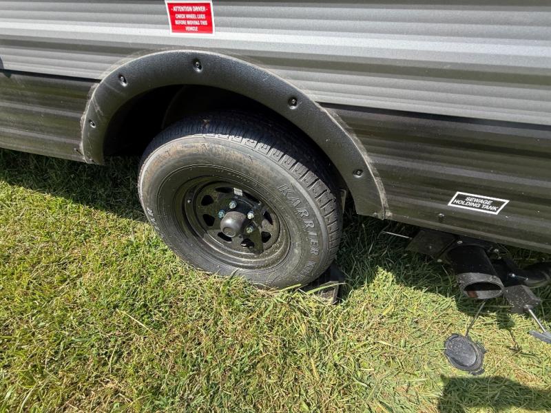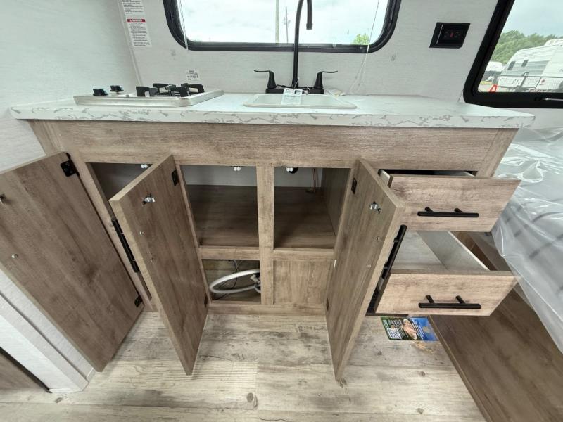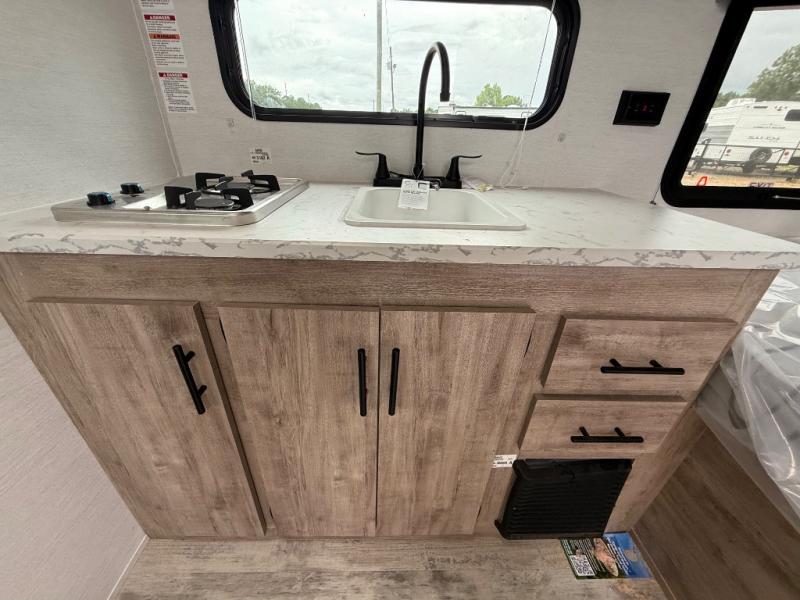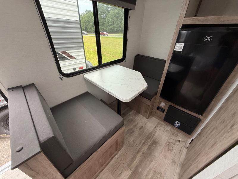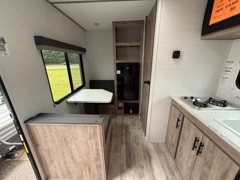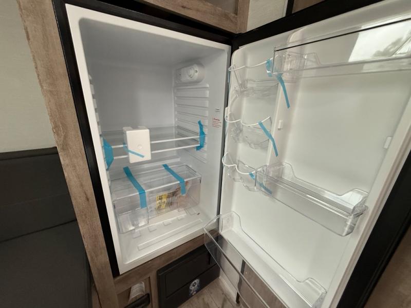 You will love these travel trailer appliances! The sleek microwave and spacious refrigerator make meal prep effortless, while the convenient two-burner cooktop lets you cook up tasty meals on the go. The cozy dinette is perfect for savoring meals or enjoying quality time, and the plush bed ensures a rejuvenating night's sleep. Thoughtful storage solutions, including flip-up storage and overhead shelves, keep your belongings tidy and easily accessible. This travel trailer is perfect for anyone seeking a peaceful and adventurous retreat. With its clever design and functional features, it's easy to tow and park, allowing you to explore scenic destinations with ease.