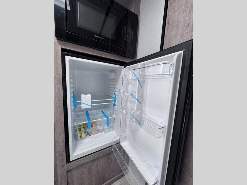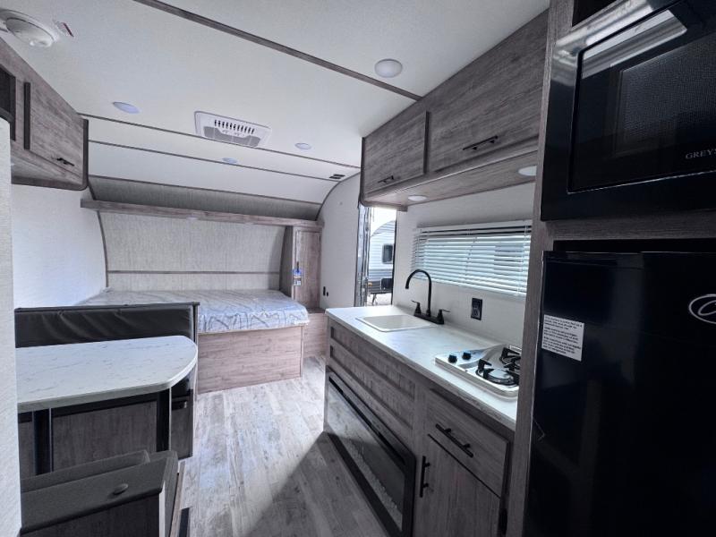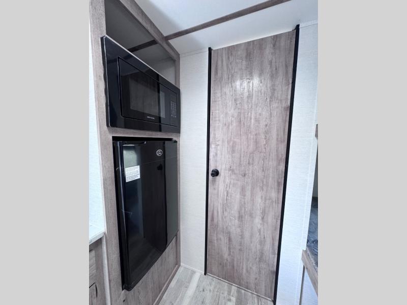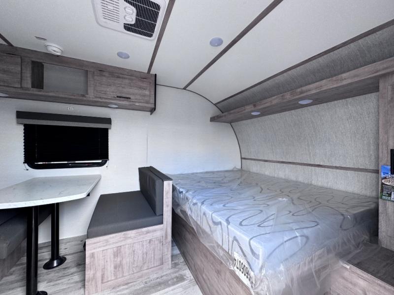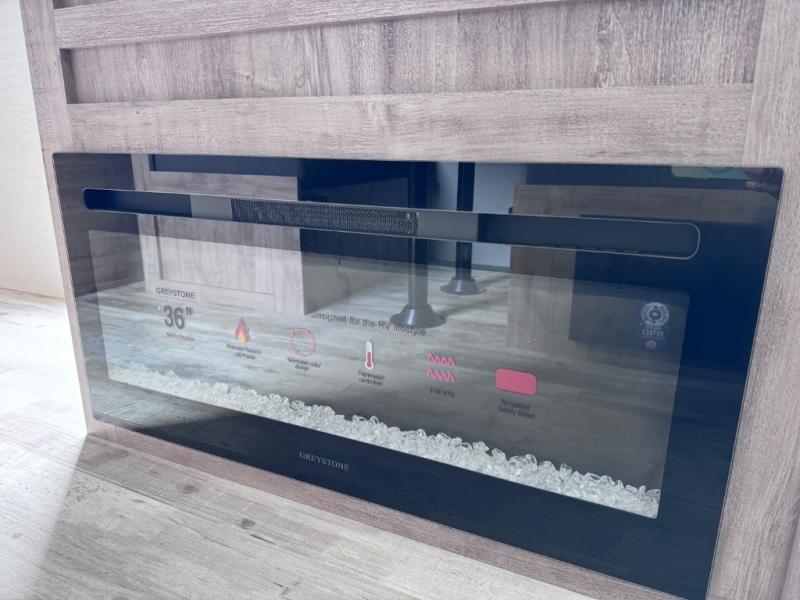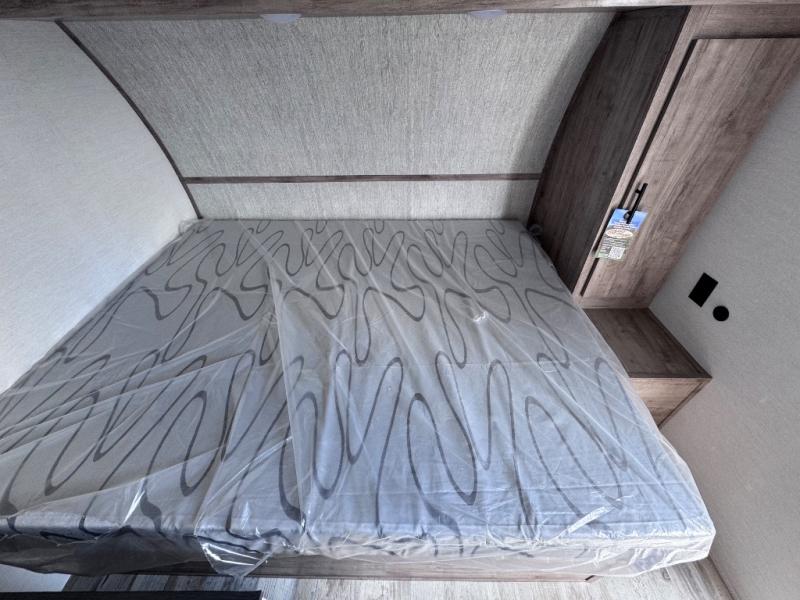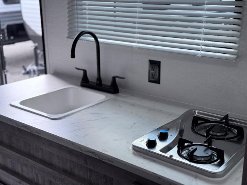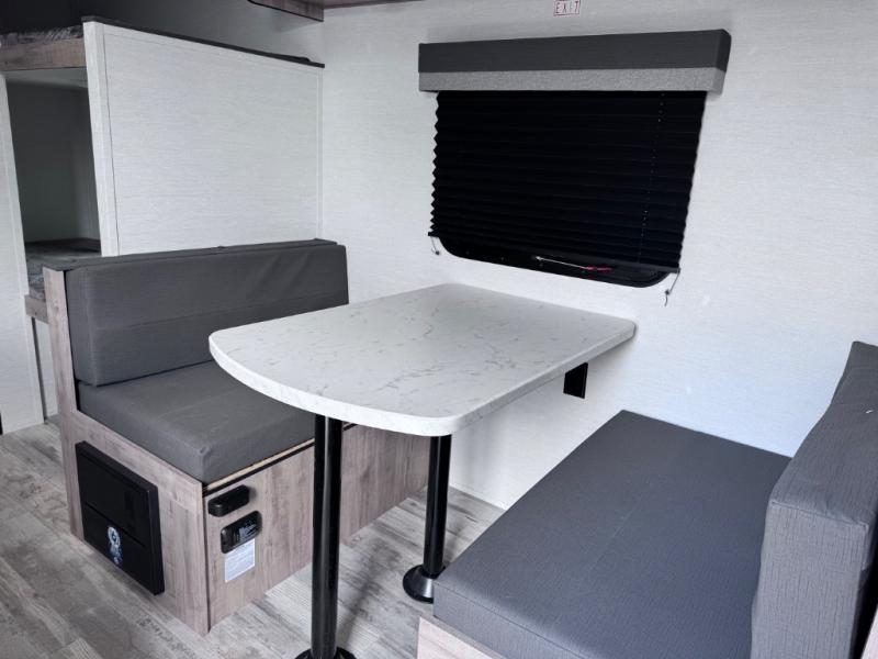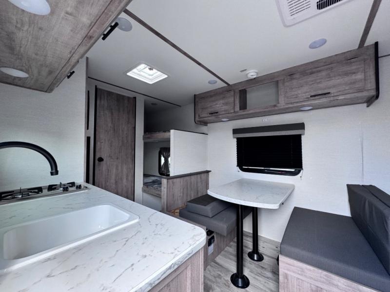 It's easier than ever to enjoy the camping lifestyle with this lightweight travel trailer. There are bunk beds for your guests or little ones, a front bed for you, plus a booth dinette that can double as dining and sleeping space. The private toilet and shower will allow you to stay clean throughout each trip, and since the sink is at the kitchen counter, someone can brush their teeth while the other showers before bed. You will love the fireplace included in this model for a more at-home feel, or you just might find yourselves outdoors under the power awning most of the day!