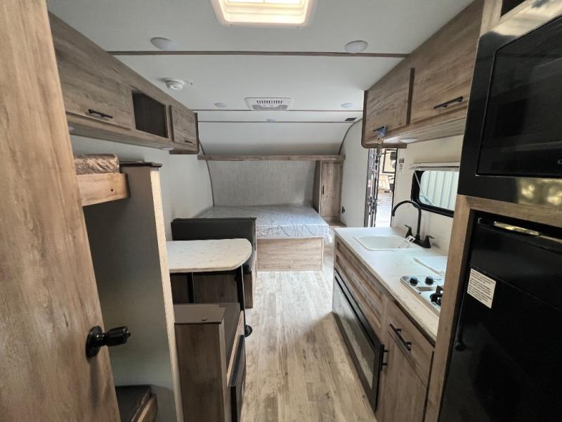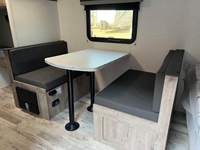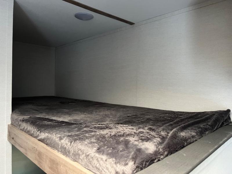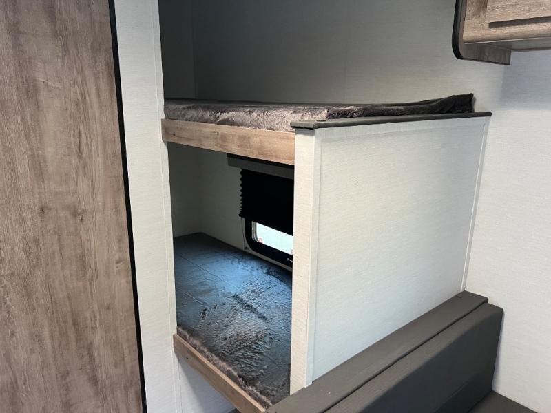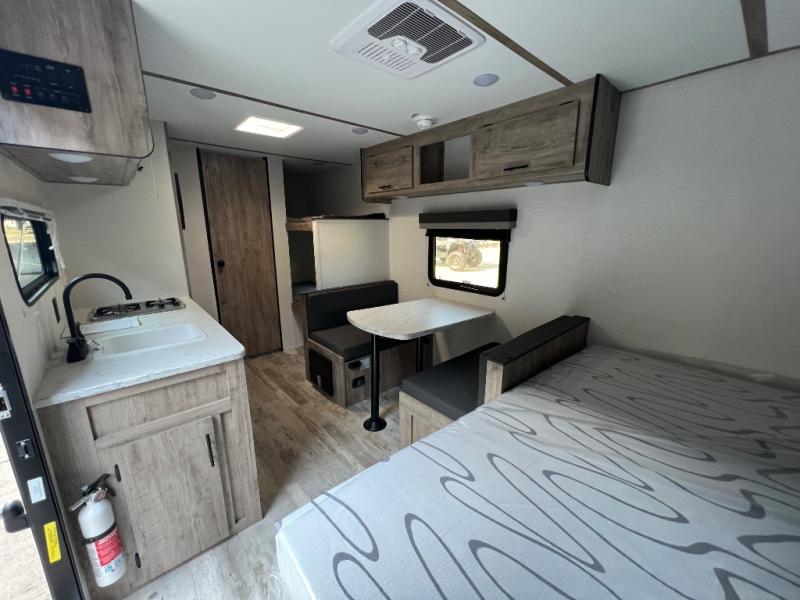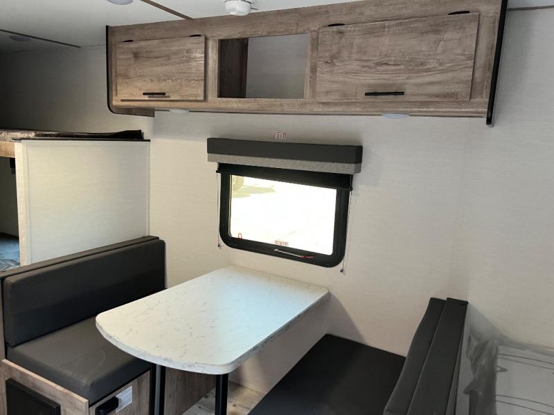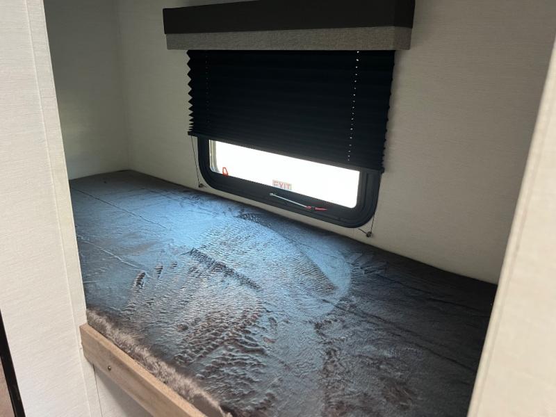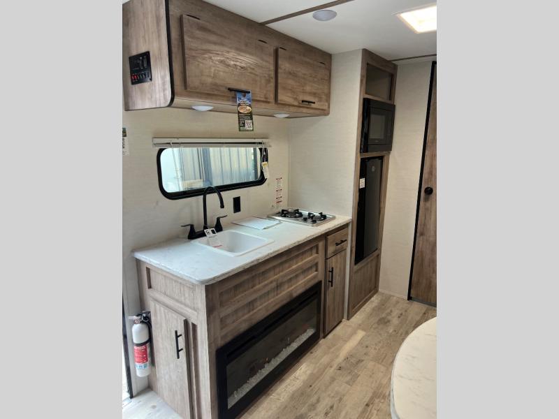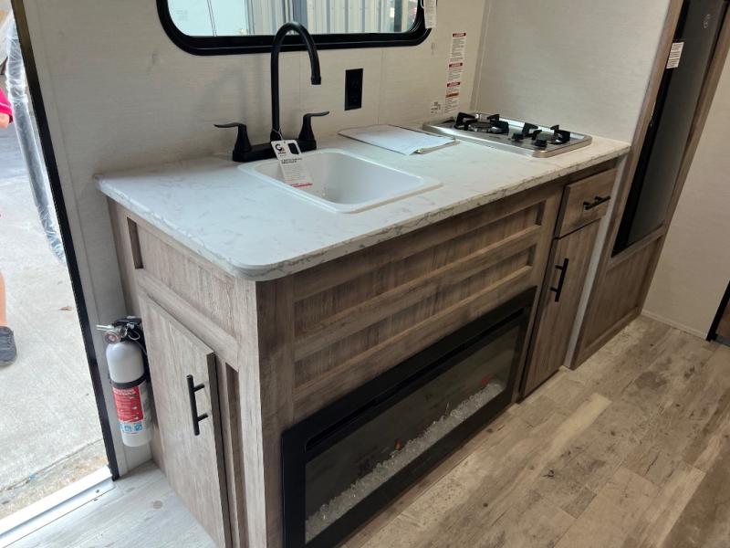 It's easier than ever to enjoy the camping lifestyle with this lightweight travel trailer. There are bunk beds for your guests or little ones, a front bed for you, plus a booth dinette that can double as dining and sleeping space. The private toilet and shower will allow you to stay clean throughout each trip, and since the sink is at the kitchen counter, someone can brush their teeth while the other showers before bed. You will love the fireplace included in this model for a more at-home feel, or you just might find yourselves outdoors under the power awning most of the day!
