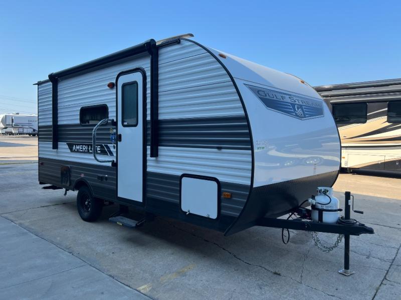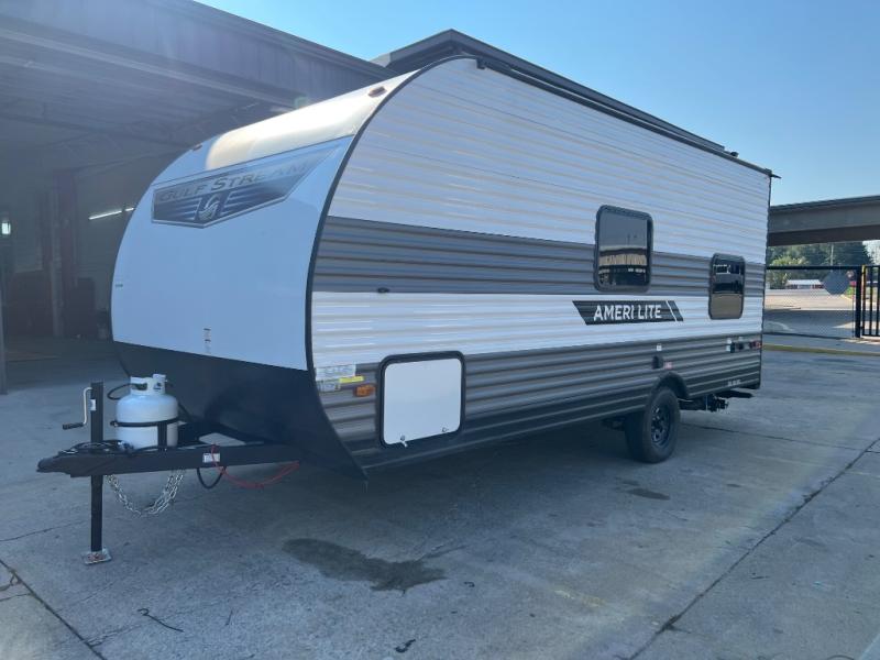 If you're looking for an affordable, lightweight travel trailer, you've found it in the Ameri-Lite Super Lite by Gulf Stream. These models may be lighter in weight, but they don't skimp out on comfortable features. Each unit includes high-performance vinyl flooring throughout, a white kitchen sink, craft-made cabinetry with designer pulls, plus fabric-wrapped box valances to make you feel right at home. You'll enjoy the 6' 8" interior height, wood ceiling trim, multiple USB ports, and more features included within the Camping Package. These models also include a tankless water heater, a central control panel to control your unit's functions, plus plenty of safety features you are sure to appreciate for your family. You can't go wrong with an Ameri-Lite Super Lite travel trailer. Choose your favorite floorplan today!