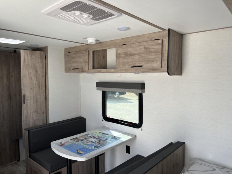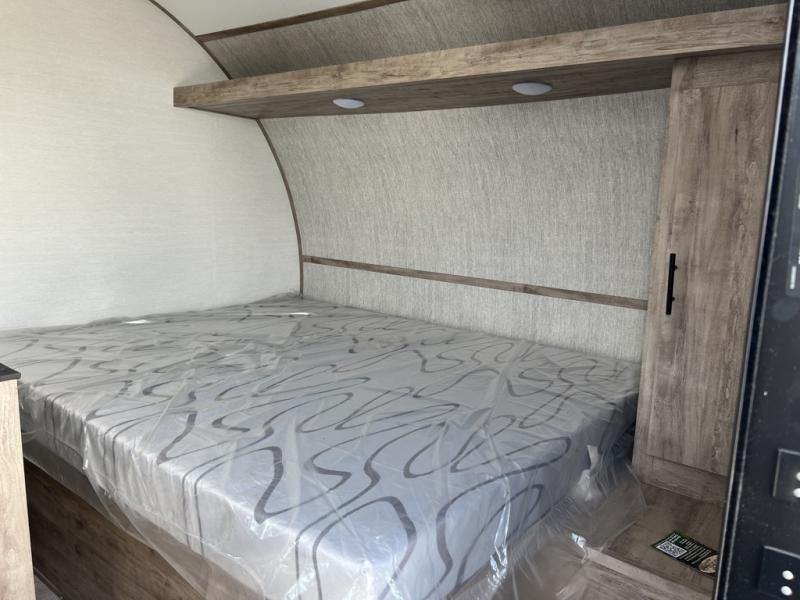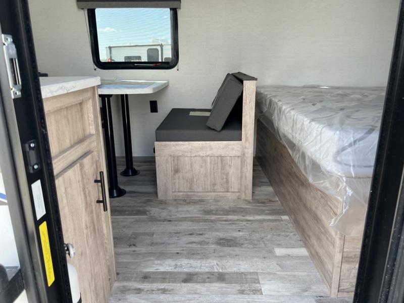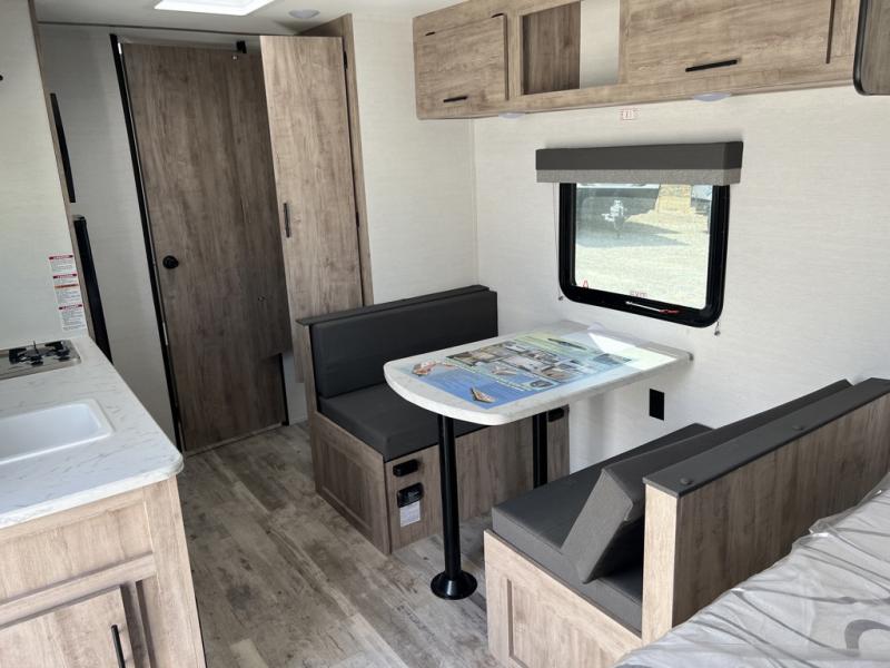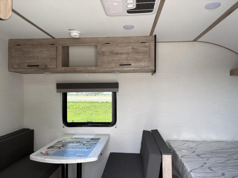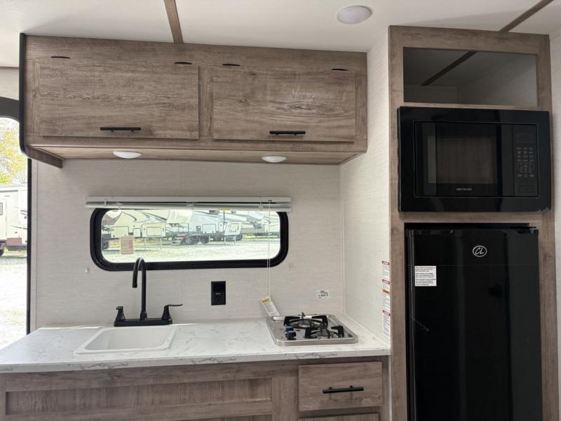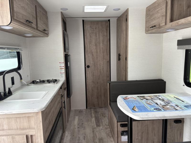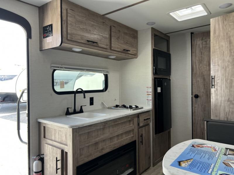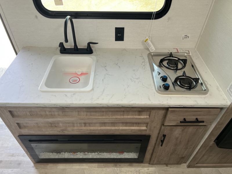 A cozy travel trailer for two or four to enjoy! This unit features a rear bath layout which includes a shower, toilet, and vanity with sink, plus medicine cabinet. No campsite facilities needed! Cook meals and snacks using the two burner cooktop and microwave oven and enjoy eating inside at the booth dinette. When you are not enjoying a meal, the dinette is a great place to play a board game or cards. There is a large closet for clothing storage, and overhead cabinets for your things as well. The front bed is perfect for two, and a nightstand is available for your personal belongings, plus more storage can be found with a large front overhead shelf. This unit even has a fireplace beneath the kitchen sink area!!
