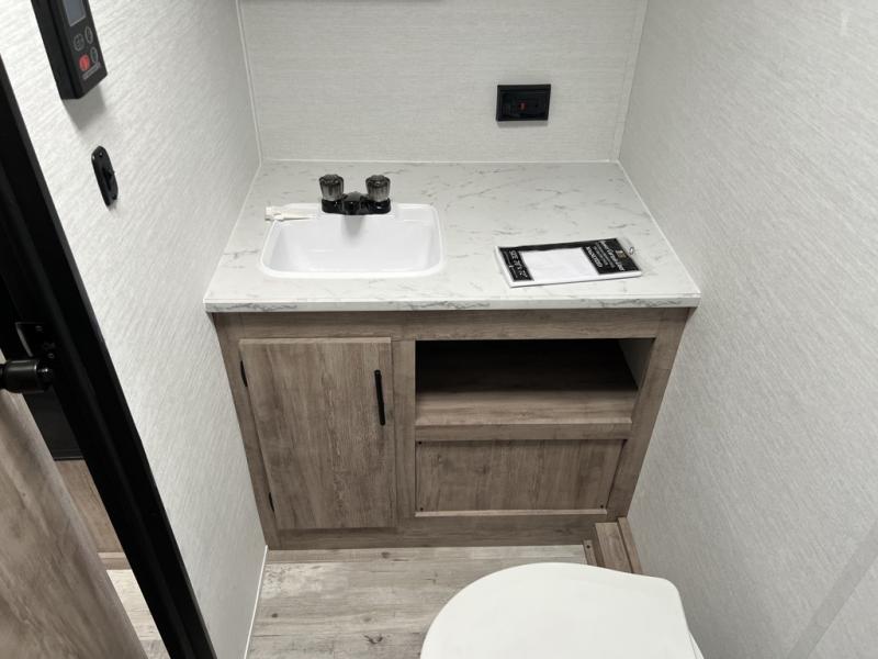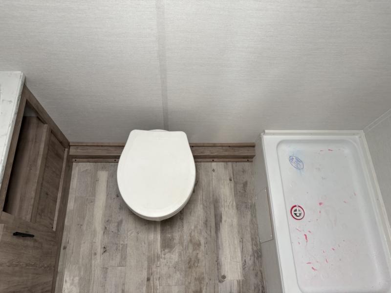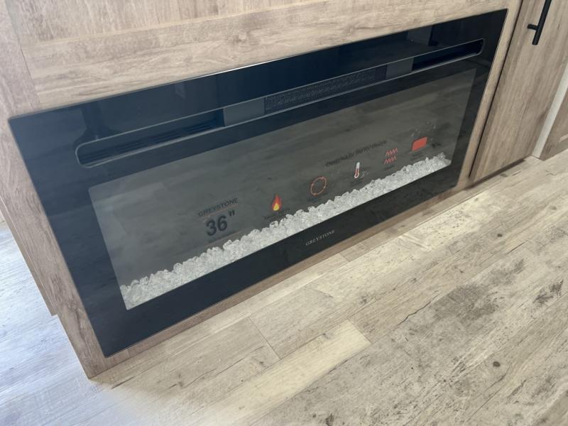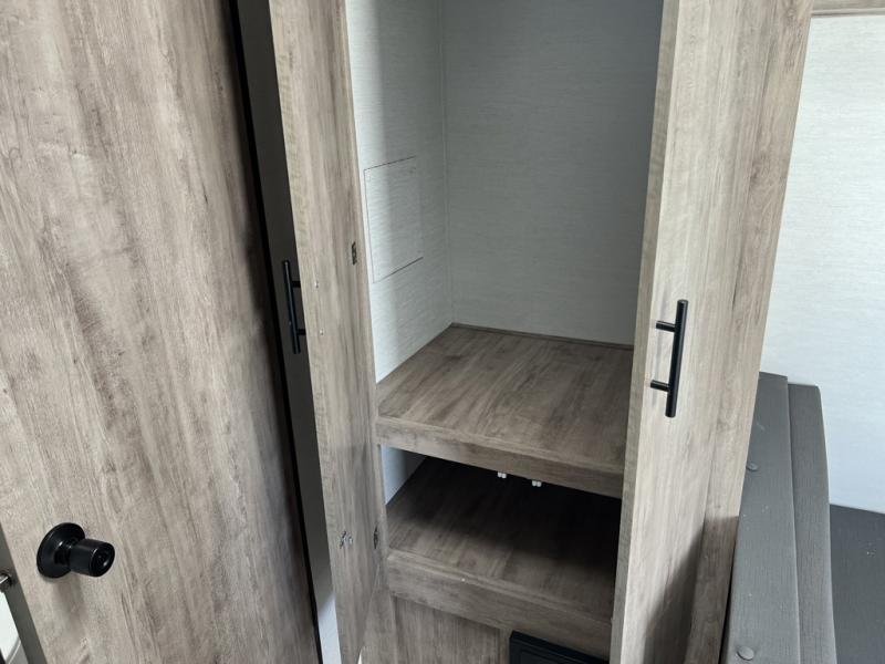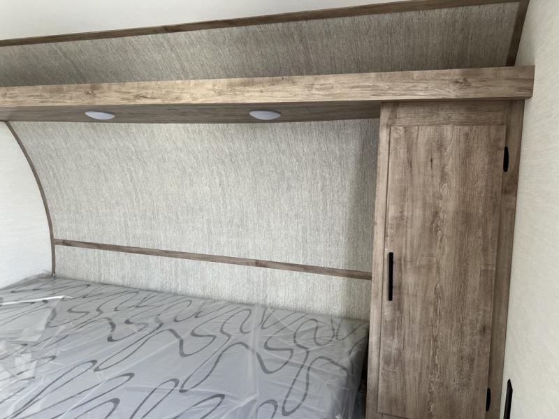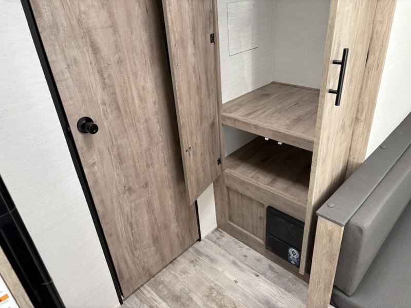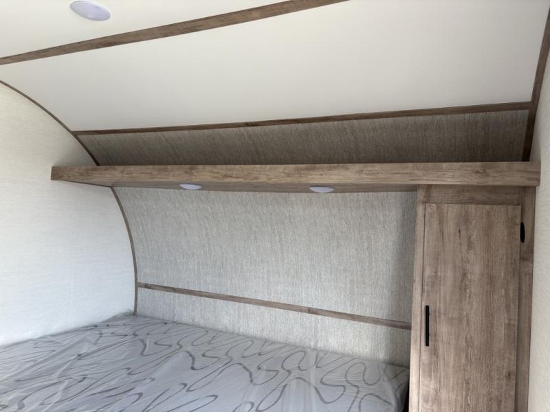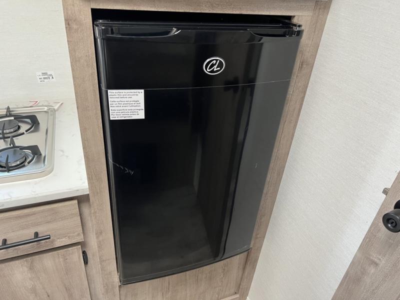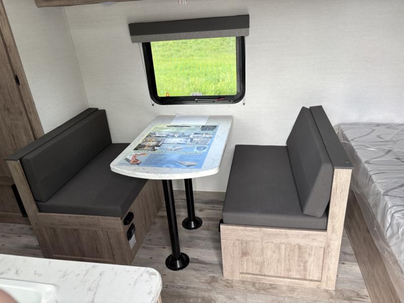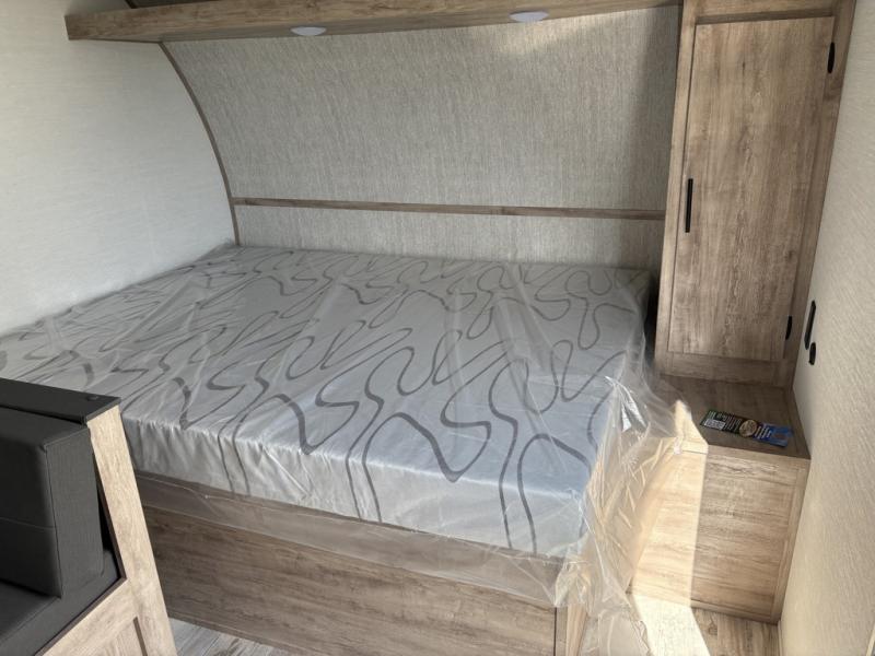 A cozy travel trailer for two or four to enjoy! This unit features a rear bath layout which includes a shower, toilet, and vanity with sink, plus medicine cabinet. No campsite facilities needed! Cook meals and snacks using the two burner cooktop and microwave oven and enjoy eating inside at the booth dinette. When you are not enjoying a meal, the dinette is a great place to play a board game or cards. There is a large closet for clothing storage, and overhead cabinets for your things as well. The front bed is perfect for two, and a nightstand is available for your personal belongings, plus more storage can be found with a large front overhead shelf. This unit even has a fireplace beneath the kitchen sink area!!