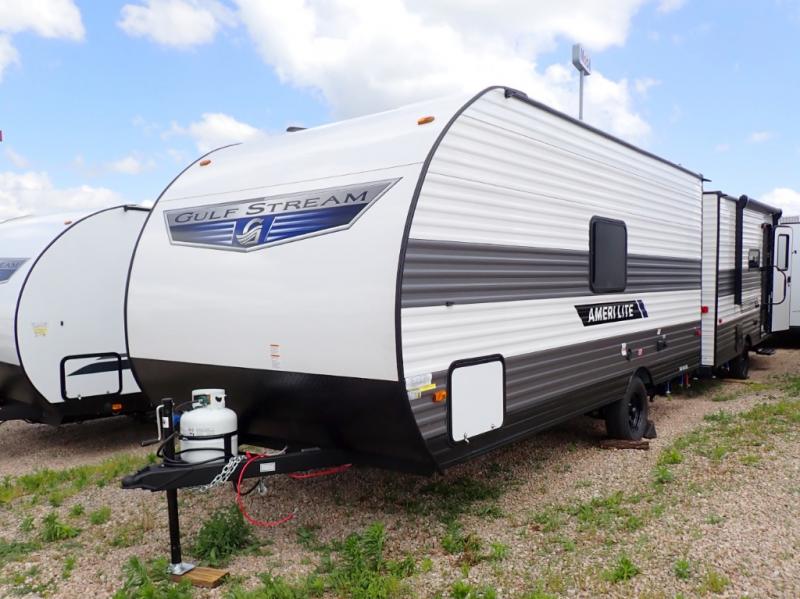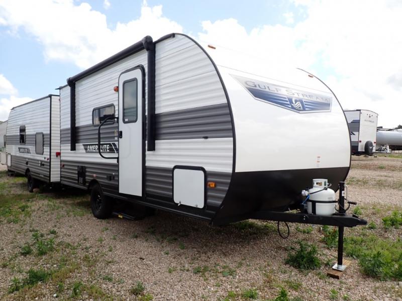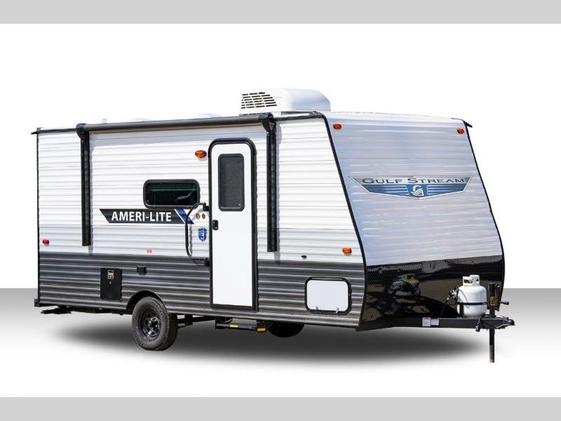 If you're looking for an affordable, lightweight travel trailer, you've found it in the Ameri-Lite Super Lite by Gulf Stream. These models may be lighter in weight, but they don't skimp out on comfortable features. Each unit includes high-performance vinyl flooring throughout, a white kitchen sink, craft-made cabinetry with designer pulls, plus fabric-wrapped box valances to make you feel right at home. You'll enjoy the 6' 8" interior height, wood ceiling trim, multiple USB ports, and more features included within the Camping Package. These models also include a tankless water heater, a central control panel to control your unit's functions, plus plenty of safety features you are sure to appreciate for your family. You can't go wrong with an Ameri-Lite Super Lite travel trailer. Choose your favorite floorplan today!