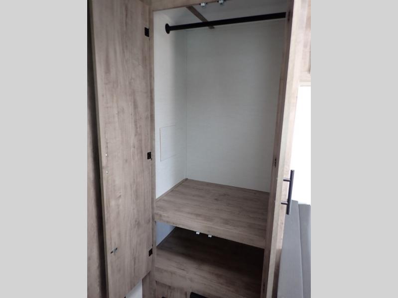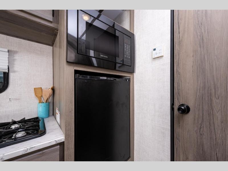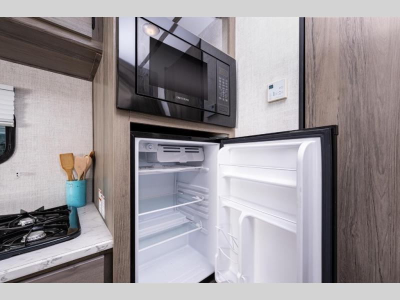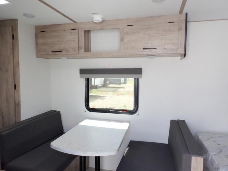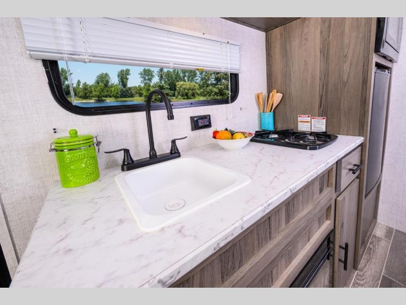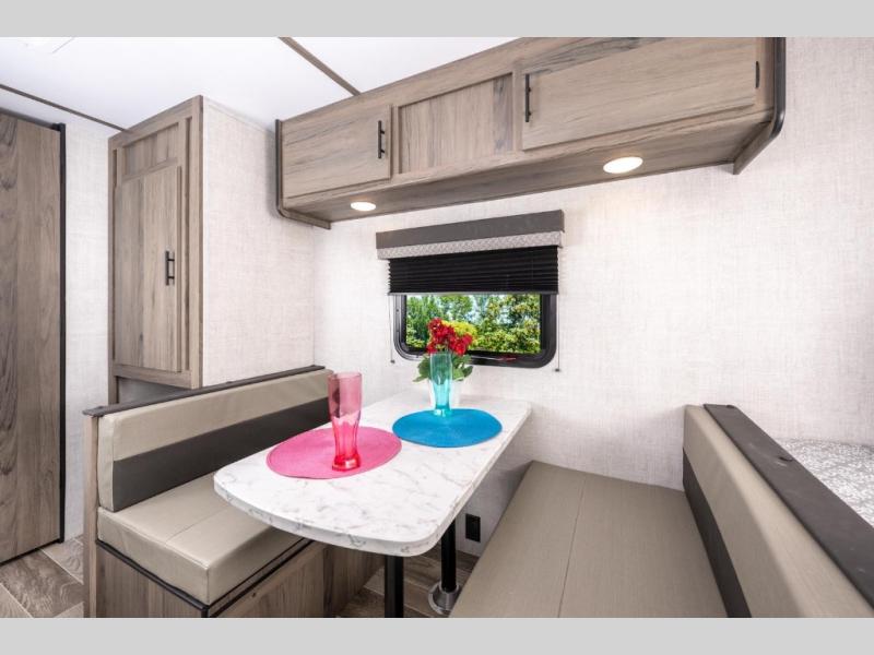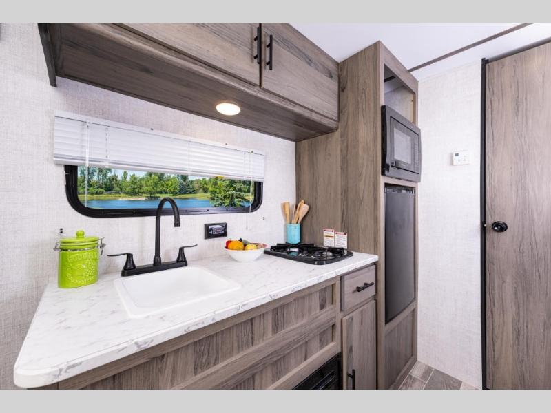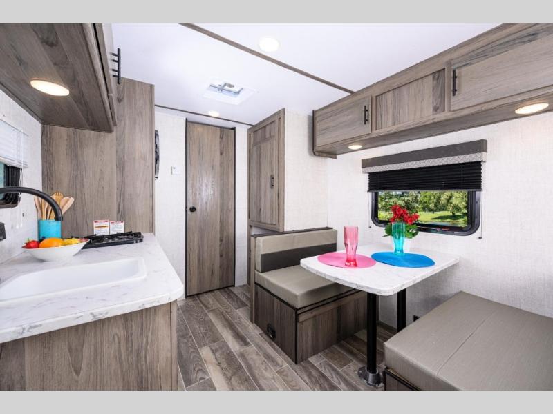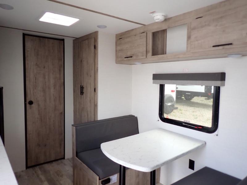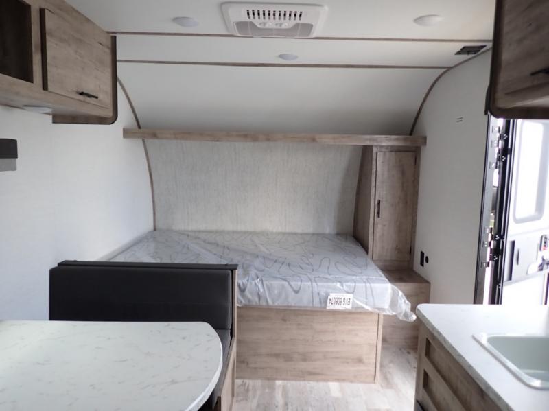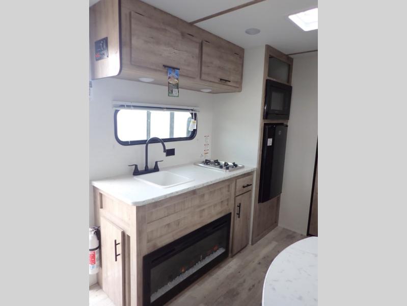 A cozy travel trailer for two or four to enjoy! This unit features a rear bath layout which includes a shower, toilet, and vanity with sink, plus medicine cabinet. No campsite facilities needed! Cook meals and snacks using the two burner cooktop and microwave oven and enjoy eating inside at the booth dinette. When you are not enjoying a meal, the dinette is a great place to play a board game or cards. There is a large closet for clothing storage, and overhead cabinets for your things as well. The front bed is perfect for two, and a nightstand is available for your personal belongings, plus more storage can be found with a large front overhead shelf. This unit even has a fireplace beneath the kitchen sink area!!