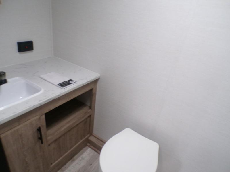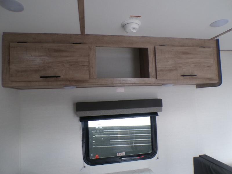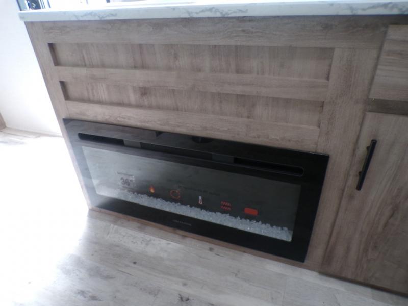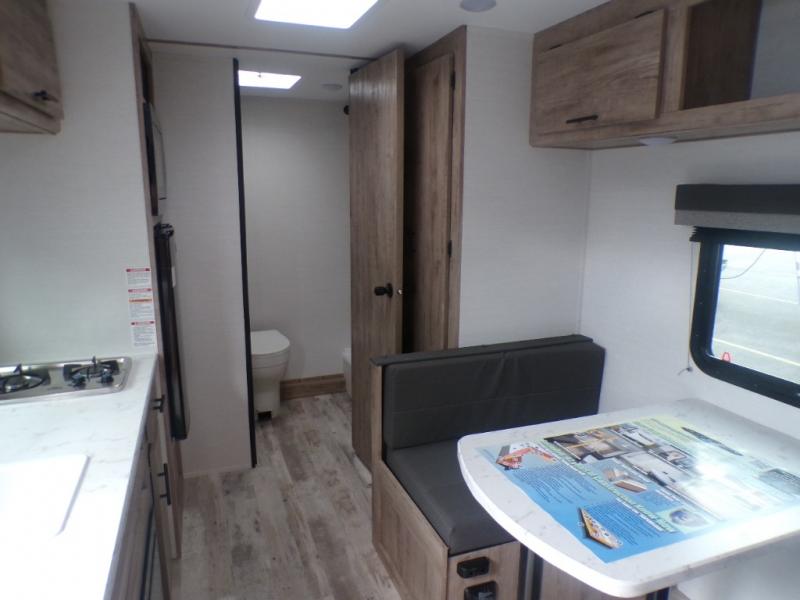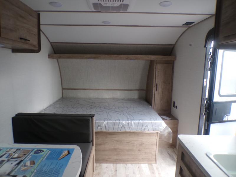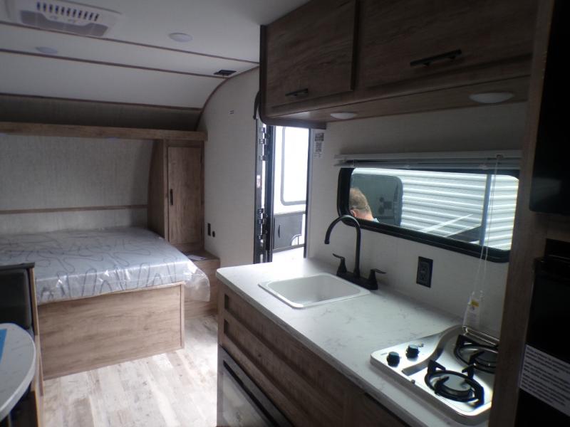 A cozy travel trailer for two or four to enjoy! This unit features a rear bath layout which includes a shower, toilet, and vanity with sink, plus medicine cabinet. No campsite facilities needed! Cook meals and snacks using the two burner cooktop and microwave oven and enjoy eating inside at the booth dinette. When you are not enjoying a meal, the dinette is a great place to play a board game or cards. There is a large closet for clothing storage, and overhead cabinets for your things as well. The front bed is perfect for two, and a nightstand is available for your personal belongings, plus more storage can be found with a large front overhead shelf. This unit even has a fireplace beneath the kitchen sink area!!