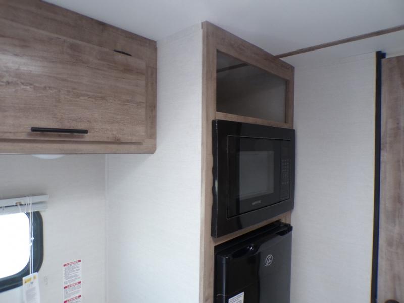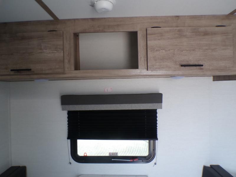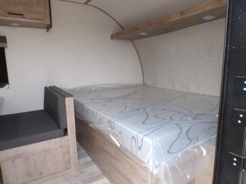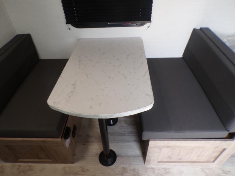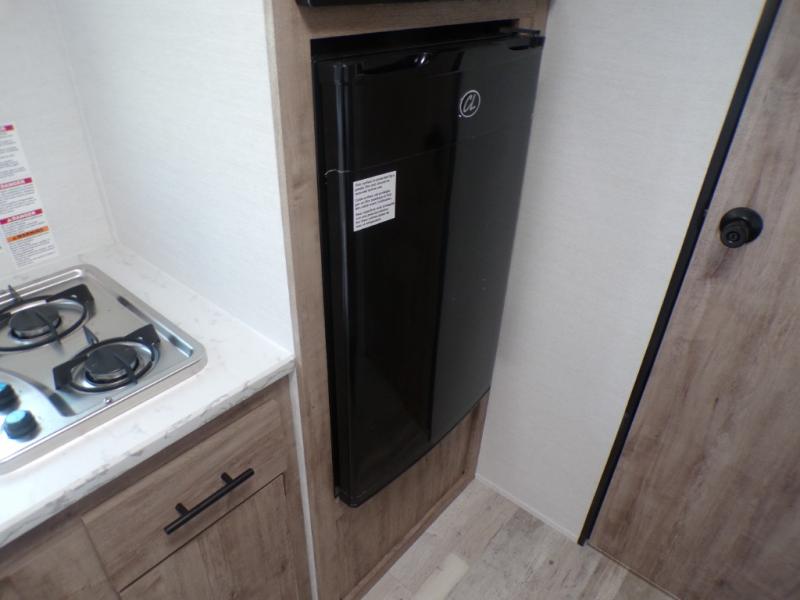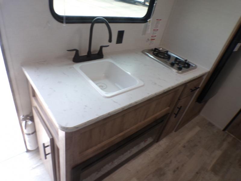 A cozy travel trailer for two or four to enjoy! This unit features a rear bath layout which includes a shower, toilet, and vanity with sink, plus medicine cabinet. No campsite facilities needed! Cook meals and snacks using the two burner cooktop and microwave oven and enjoy eating inside at the booth dinette. When you are not enjoying a meal, the dinette is a great place to play a board game or cards. There is a large closet for clothing storage, and overhead cabinets for your things as well. The front bed is perfect for two, and a nightstand is available for your personal belongings, plus more storage can be found with a large front overhead shelf. This unit even has a fireplace beneath the kitchen sink area!!