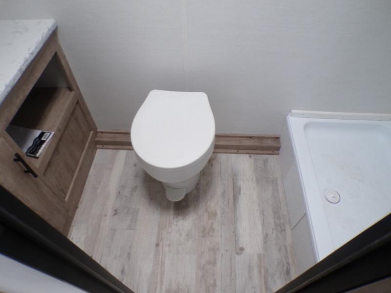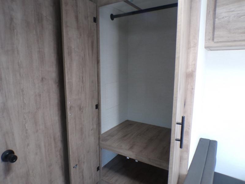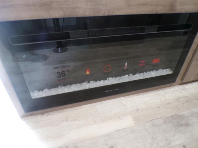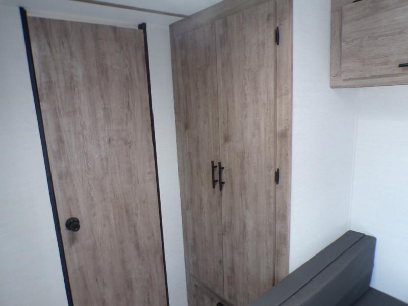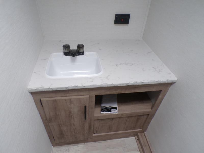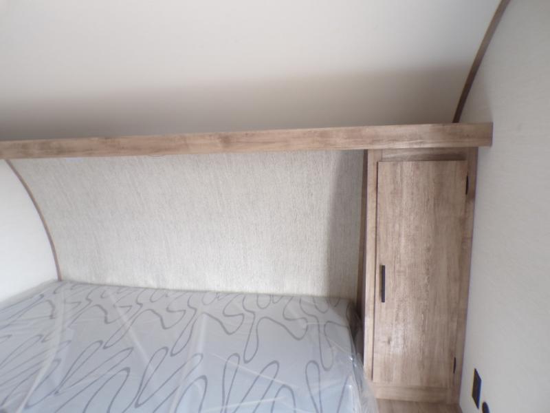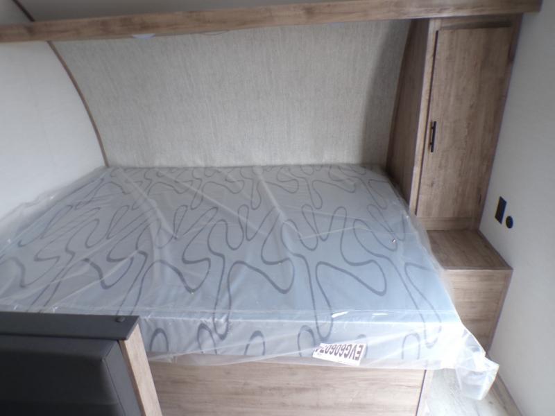 A cozy travel trailer for two or four to enjoy! This unit features a rear bath layout which includes a shower, toilet, and vanity with sink, plus medicine cabinet. No campsite facilities needed! Cook meals and snacks using the two burner cooktop and microwave oven and enjoy eating inside at the booth dinette. When you are not enjoying a meal, the dinette is a great place to play a board game or cards. There is a large closet for clothing storage, and overhead cabinets for your things as well. The front bed is perfect for two, and a nightstand is available for your personal belongings, plus more storage can be found with a large front overhead shelf. This unit even has a fireplace beneath the kitchen sink area!!