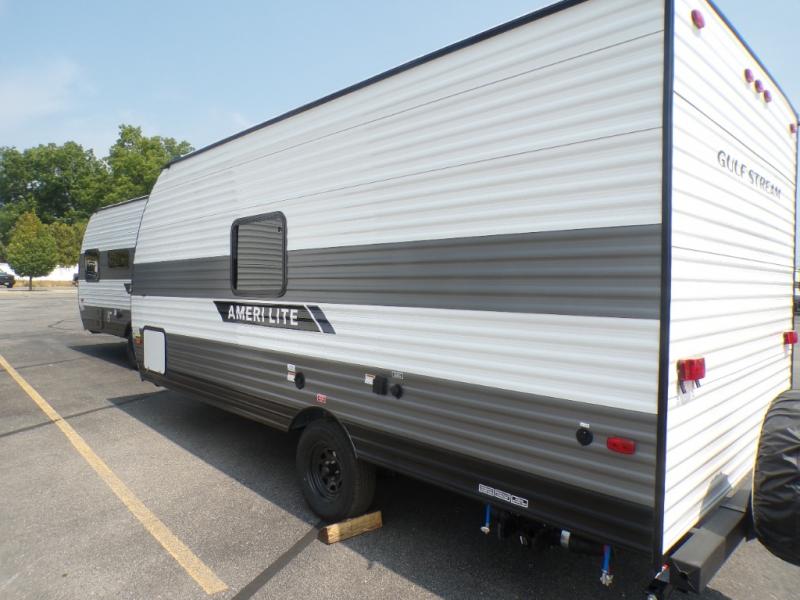If you're looking for an affordable, lightweight travel trailer, you've found it in the Ameri-Lite Super Lite by Gulf Stream. These models may be lighter in weight, but they don't skimp out on comfortable features. Each unit includes high-performance vinyl flooring throughout, a white kitchen sink, craft-made cabinetry with designer pulls, plus fabric-wrapped box valances to make you feel right at home. You'll enjoy the 6' 8" interior height, wood ceiling trim, multiple USB ports, and more features included within the Camping Package. These models also include a tankless water heater, a central control panel to control your unit's functions, plus plenty of safety features you are sure to appreciate for your family. You can't go wrong with an Ameri-Lite Super Lite travel trailer. Choose your favorite floorplan today!