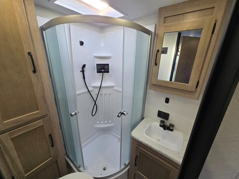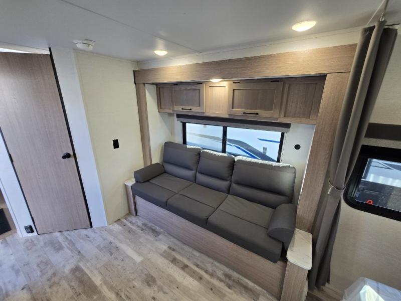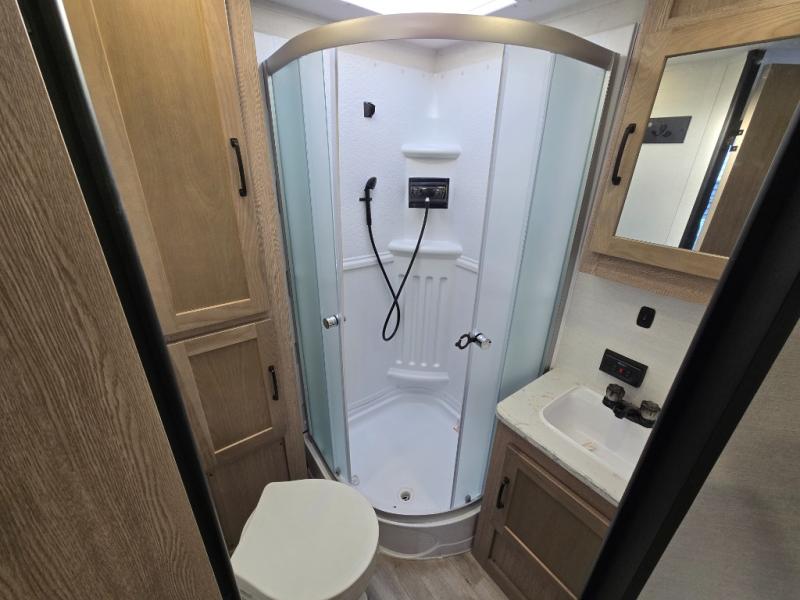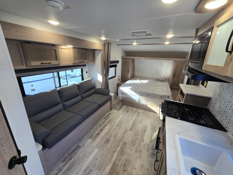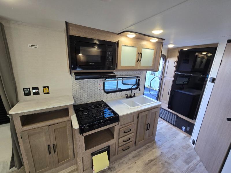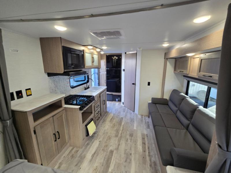 It's time to ditch that old tent and upgrade to this cozy trailer trailer! You will love having your own queen bed to sleep on instead of an air mattress, and you even have dual wardrobes and a nightstand to store your things. And you won't have to use the camp's facilities since there is a full bath in the rear corner. Meals can be made on the three burner cooktop or in the microwave oven, and the 10.7 cu. ft. Everchill refrigerator/freezer included means you won't have to keep food cold in a cooler all weekend. Once dinner is made, you can dine at the jack knife sofa with a folding table, and any guests you may have can sleep here for the night. There is even a slide out for more space; how convenient!