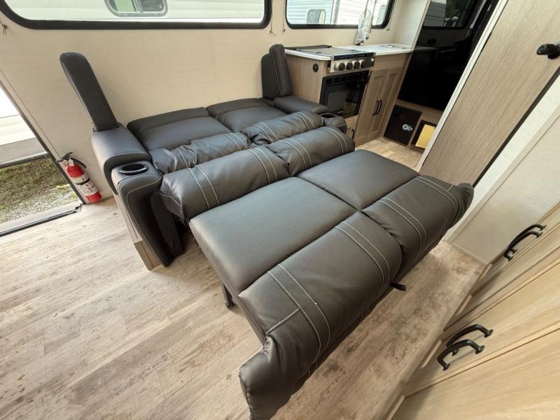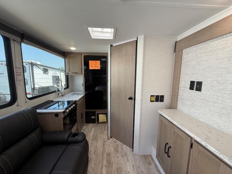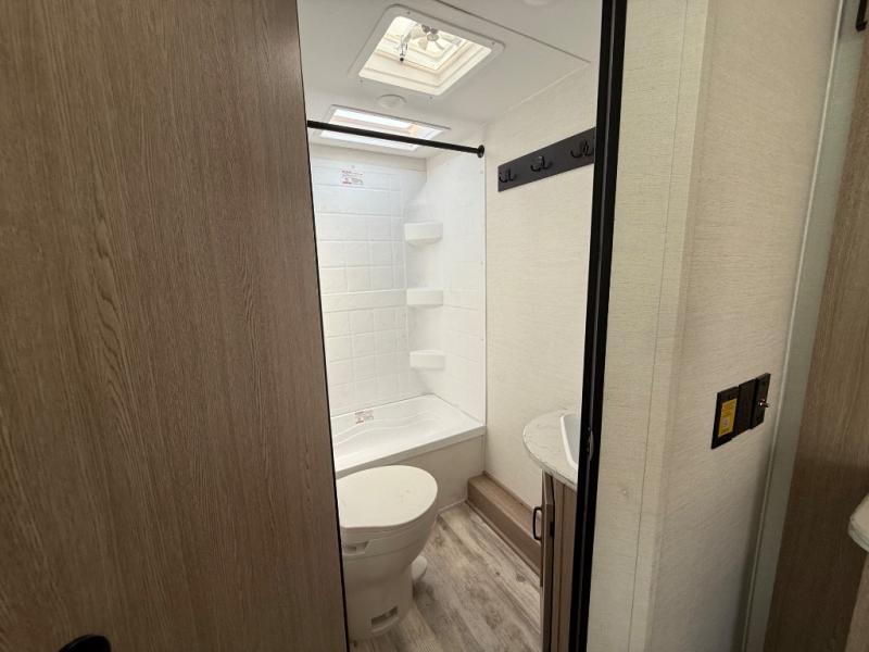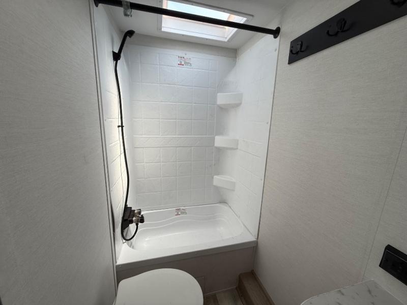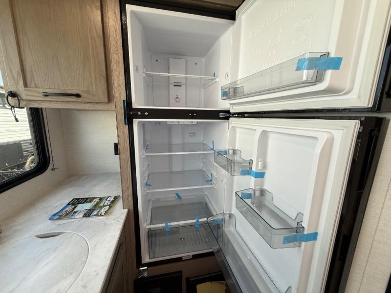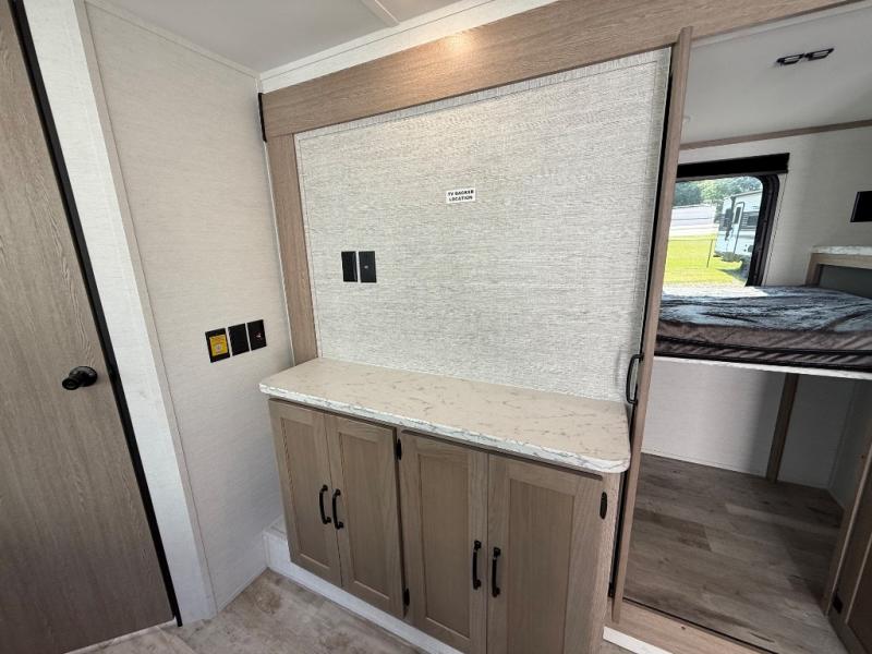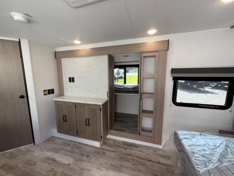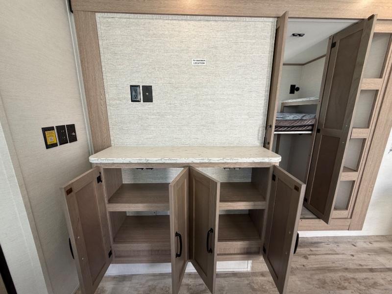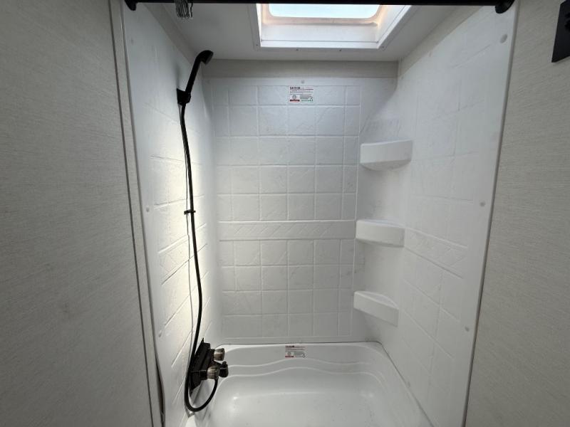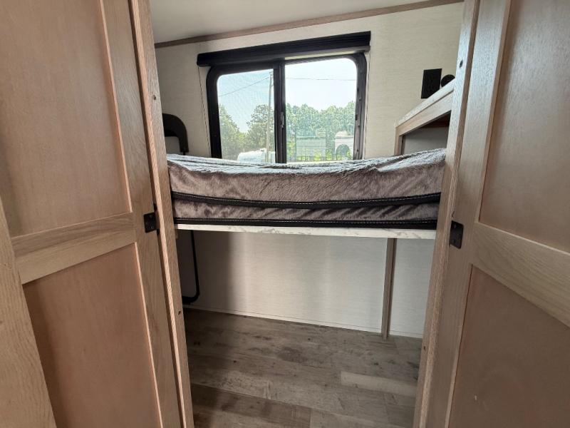 This travel trailer is perfect for a family thanks to its several spaces for rest on the road like the queen bed for you and your partner, the upper and lower bunks for kids, and a folding sofa table for guests, who will also have tons of fun thanks to the entertainment center place In front of the sofa. This unit also has a lot of space to store things and belongings like a shirt closet and wardrobe closet beside the bed, bunk shelves next to the bunk beds, and a sliding overhead cabinet in the kitchen. Also, you will find a refrigerator, sink, and a three-cooktop burner in the kitchen area. Finally, take a relaxing bath in the incredible full bathroom with a skylight