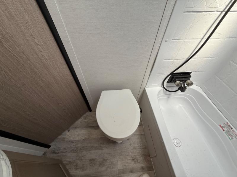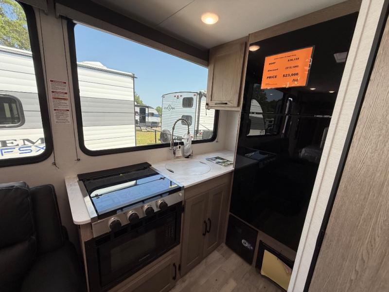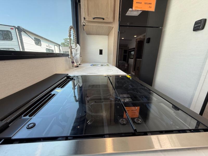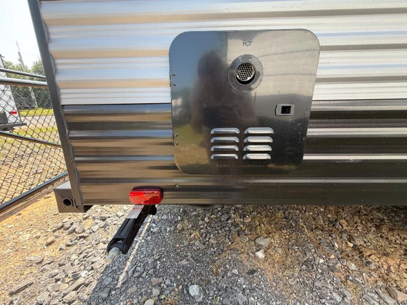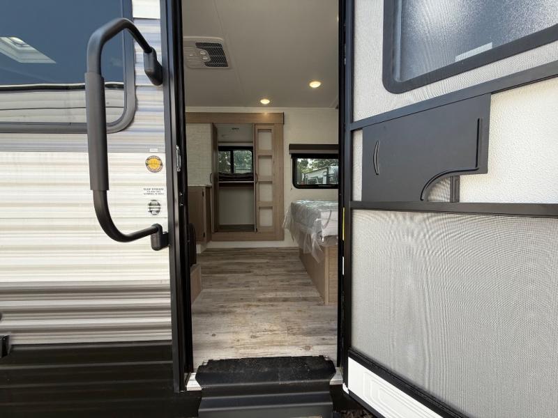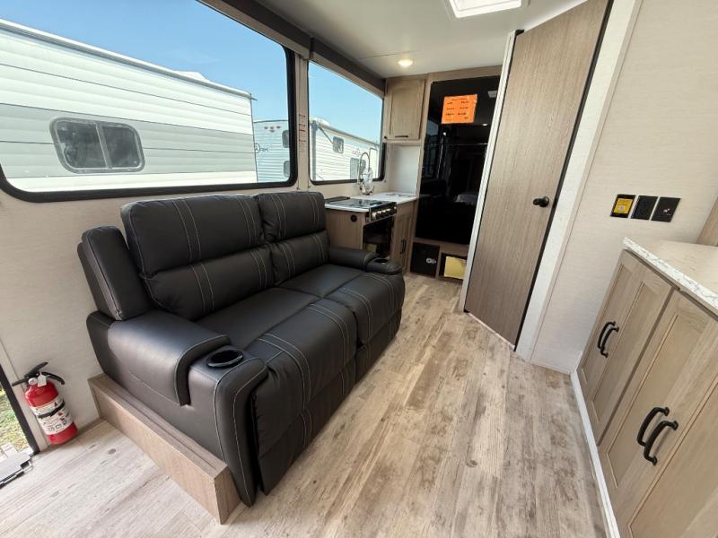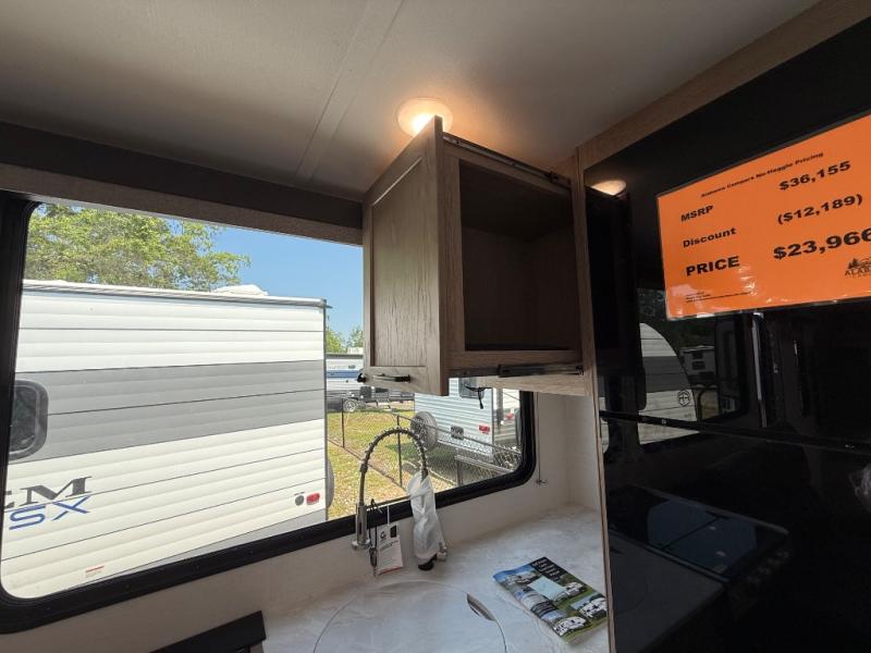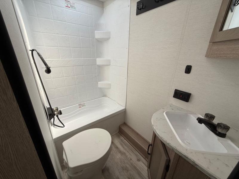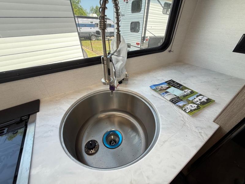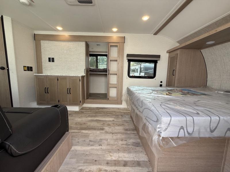 This travel trailer is perfect for a family thanks to its several spaces for rest on the road like the queen bed for you and your partner, the upper and lower bunks for kids, and a folding sofa table for guests, who will also have tons of fun thanks to the entertainment center place In front of the sofa. This unit also has a lot of space to store things and belongings like a shirt closet and wardrobe closet beside the bed, bunk shelves next to the bunk beds, and a sliding overhead cabinet in the kitchen. Also, you will find a refrigerator, sink, and a three-cooktop burner in the kitchen area. Finally, take a relaxing bath in the incredible full bathroom with a skylight