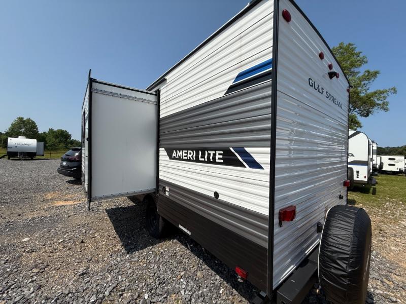 The Ameri-Lite Ultra Lite travel trailers by Gulf Stream are the perfect RV for families wanting to start their camping lifestyle, but not break the bank. These lightweight units are built with a diamond plate lower front, a one-piece synthetic vinyl roof, and a uni-body construction with steel hurricane straps tying the walls to the floor for added durability. The front power hitch jack and four stabilizer jacks will make set-up hassle-free once you arrive at the campground, and you can put out the electric awning to rest in the shade when you're done. Each model includes convenient amenities, like the 13,500 BTU A/C, the tankless water heater, a central control panel, and multiple USB ports for your tablet, phone, and camera! The inside is designed to make you feel at home with radiant LED lighting, designer kitchen backsplash, pleated privacy shades, craft-made cabinetry, plus many more features. Start your RV lifestyle with an affordable, lightweight Ameri-Lite Ultra Lite travel trailer today!