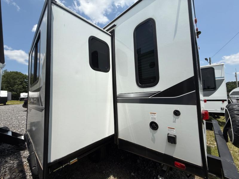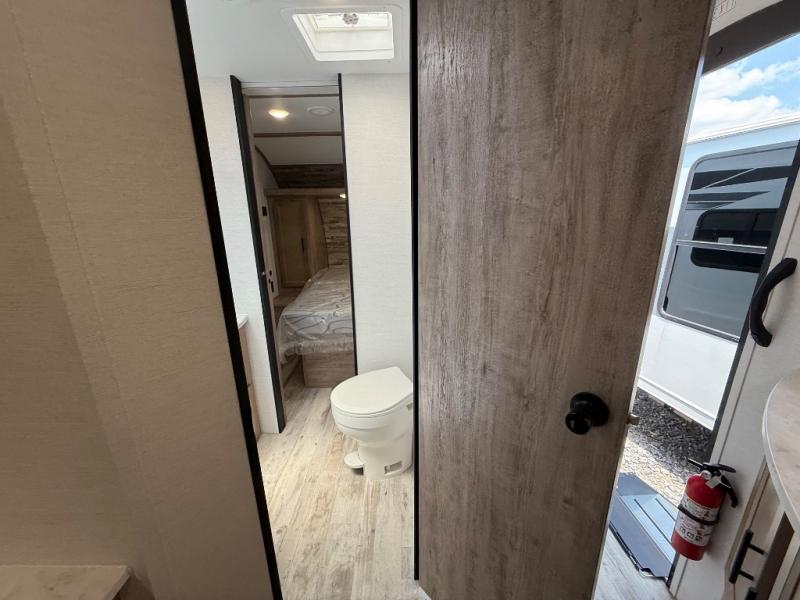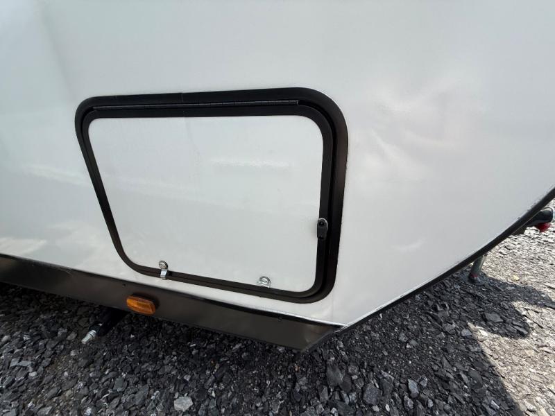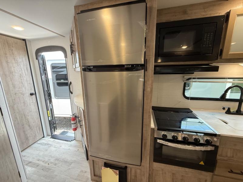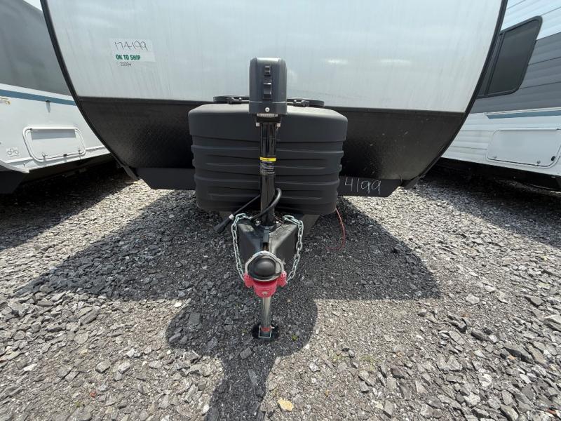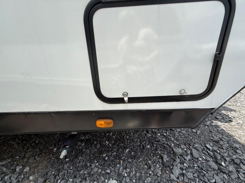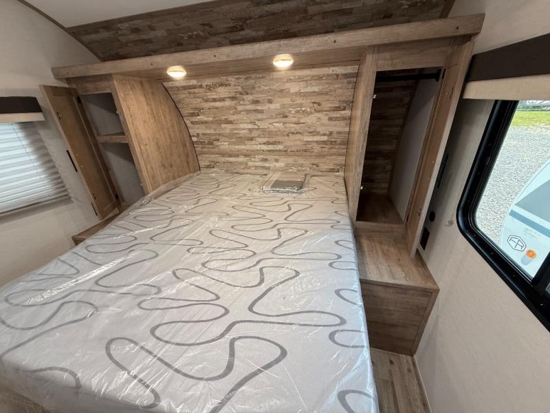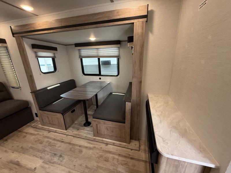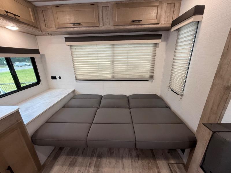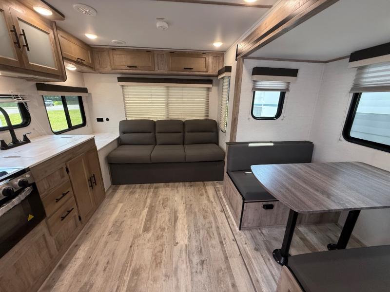 Camping with friends has never been so easy than in this cozy travel trailer. Once you arrive at your destination, prepare lunch on the three burner cooktop and you can dine at the booth dinette. Your guest can make this area their bed at night, along with the jack knife sofa. There is a front master bedroom with a queen bed that will feel just like home, and the two wardrobes provide a place for all your clothes. Head outside to find a pass-through storage, additional outside storage, plus an electric awning with LED lights!