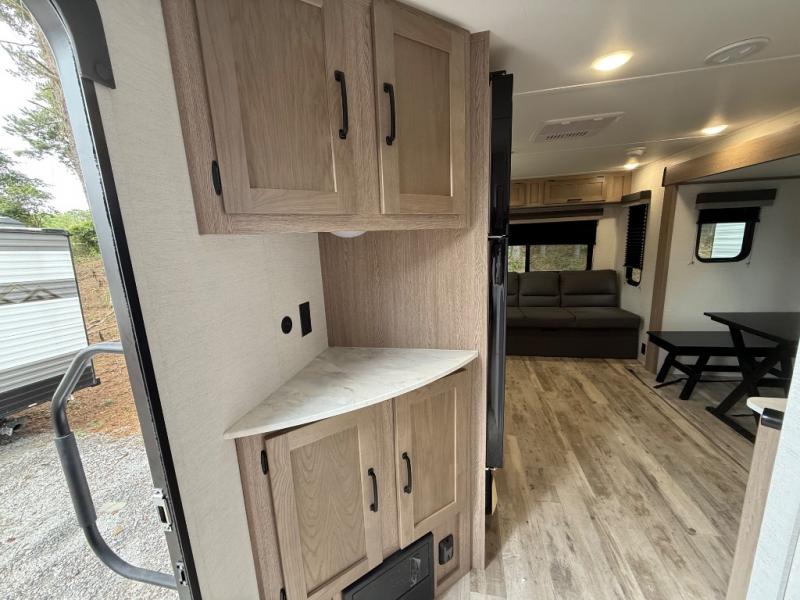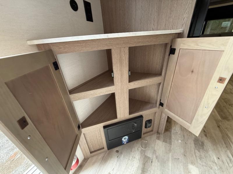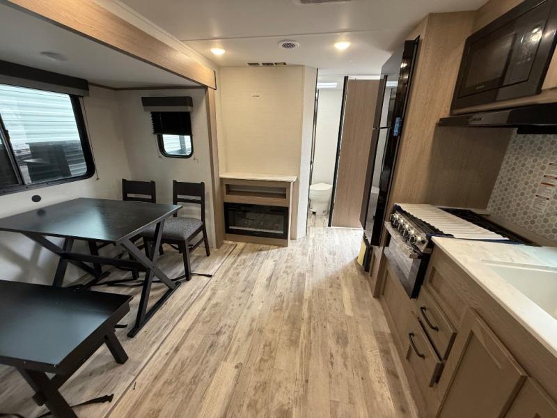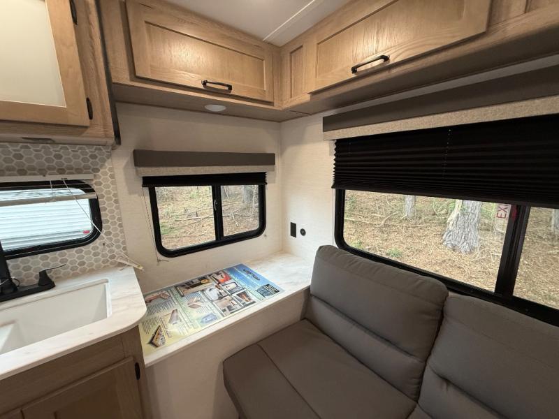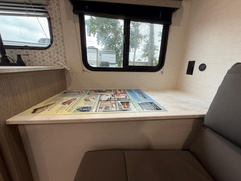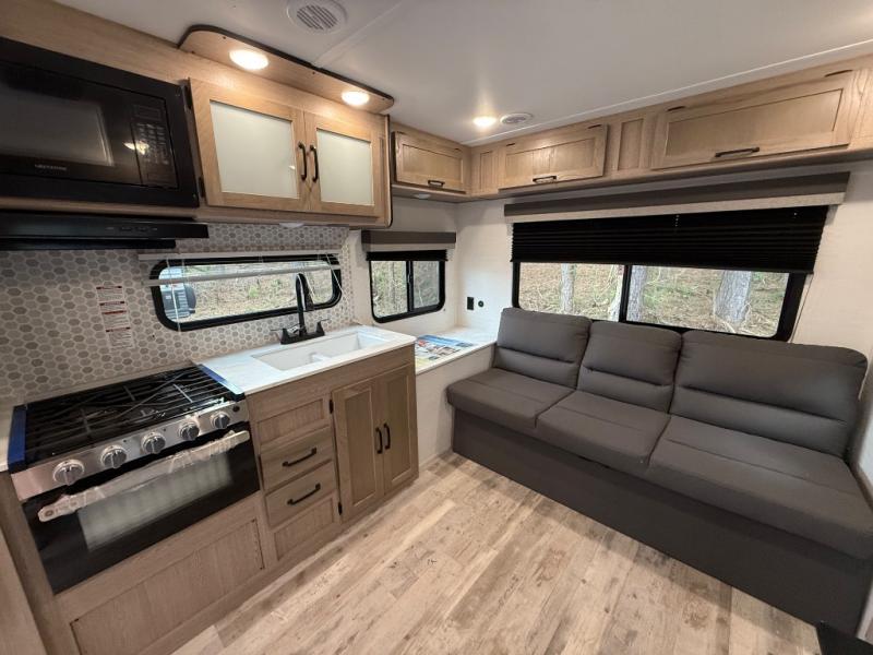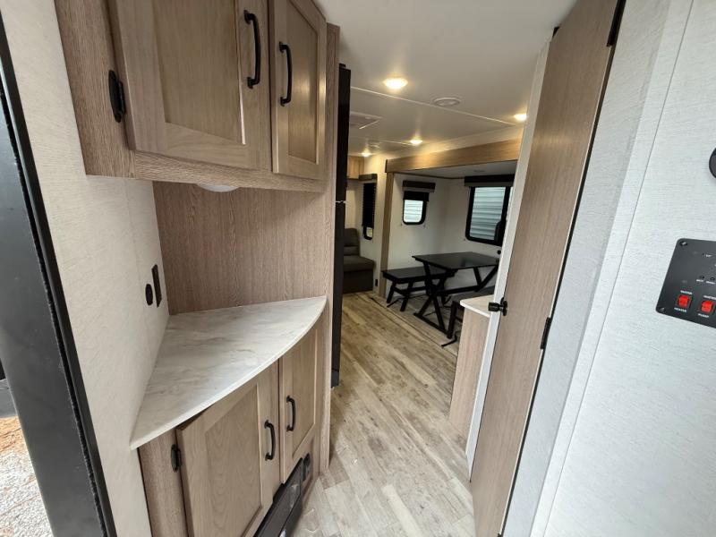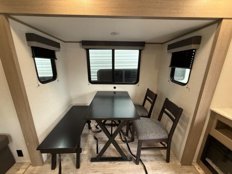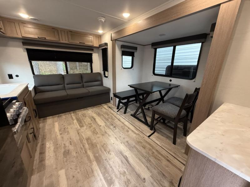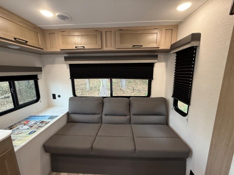 Camping with friends has never been so easy than in this cozy travel trailer. Once you arrive at your destination, prepare lunch on the three burner cooktop and you can dine at the booth dinette. Your guest can make this area their bed at night, along with the jack knife sofa. There is a front master bedroom with a queen bed that will feel just like home, and the two wardrobes provide a place for all your clothes. Head outside to find a pass-through storage, additional outside storage, plus an electric awning with LED lights!