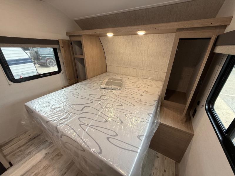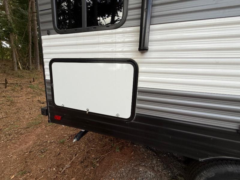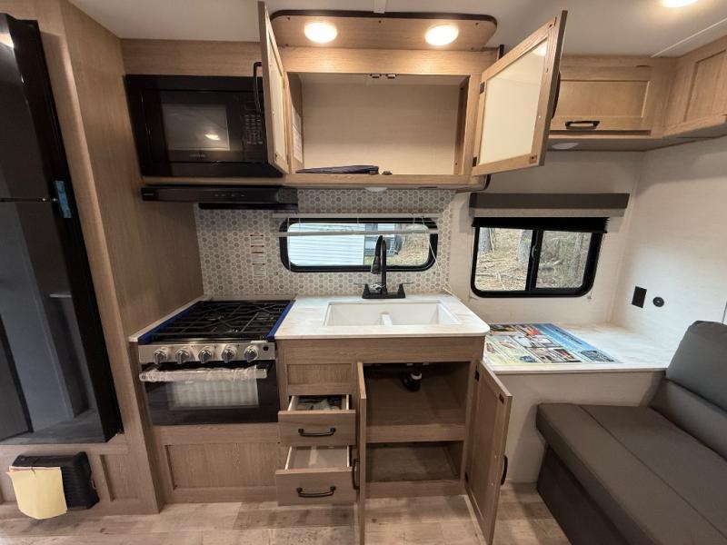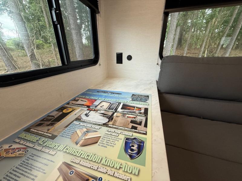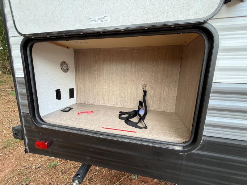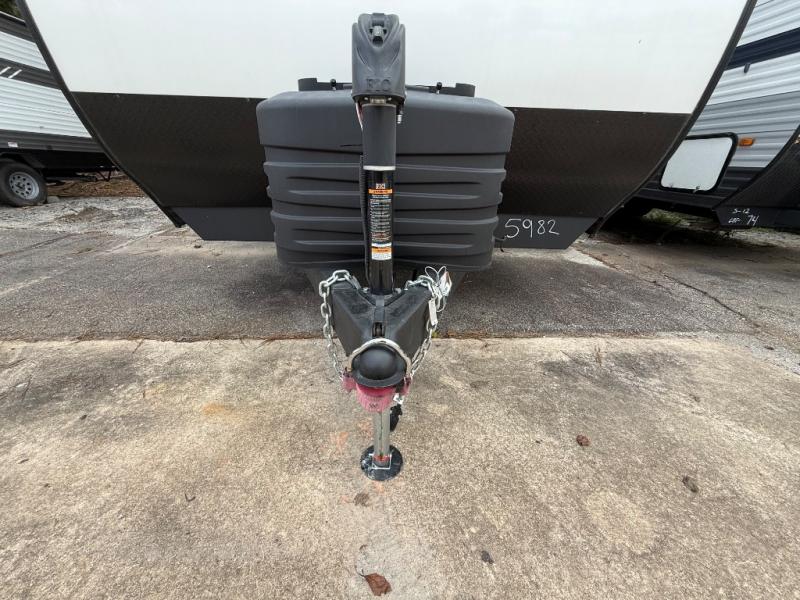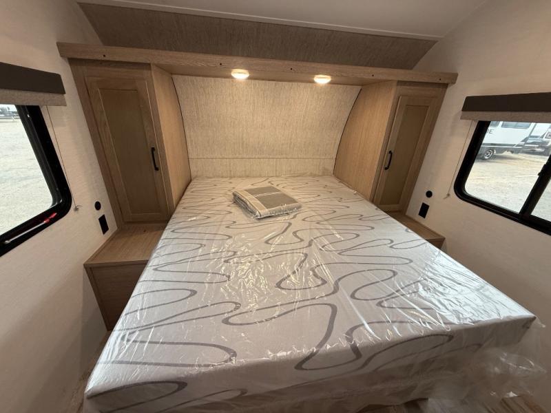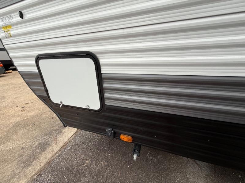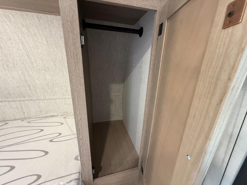 Camping with friends has never been so easy than in this cozy travel trailer. Once you arrive at your destination, prepare lunch on the three burner cooktop and you can dine at the booth dinette. Your guest can make this area their bed at night, along with the jack knife sofa. There is a front master bedroom with a queen bed that will feel just like home, and the two wardrobes provide a place for all your clothes. Head outside to find a pass-through storage, additional outside storage, plus an electric awning with LED lights!