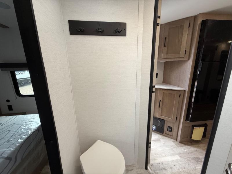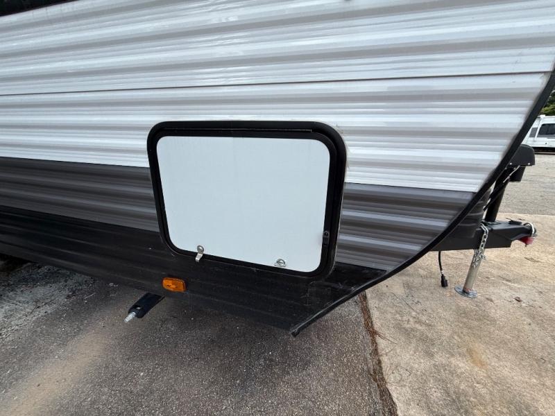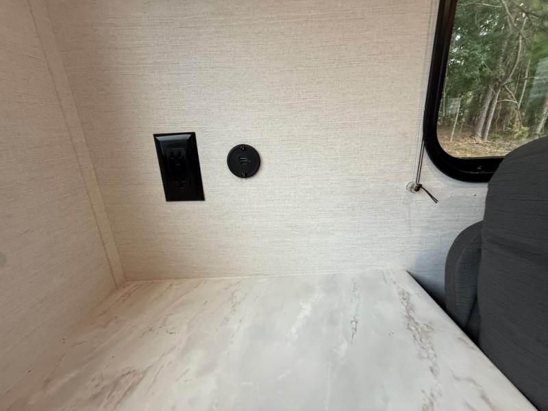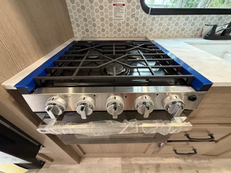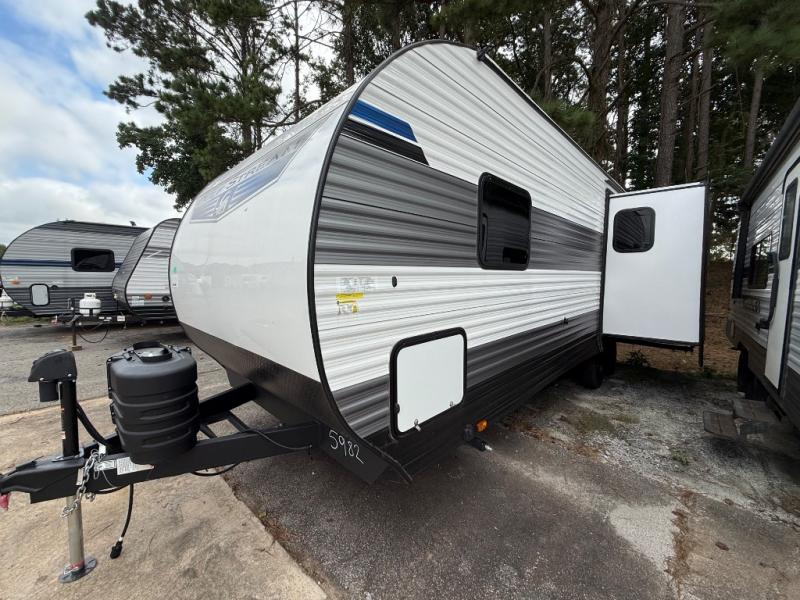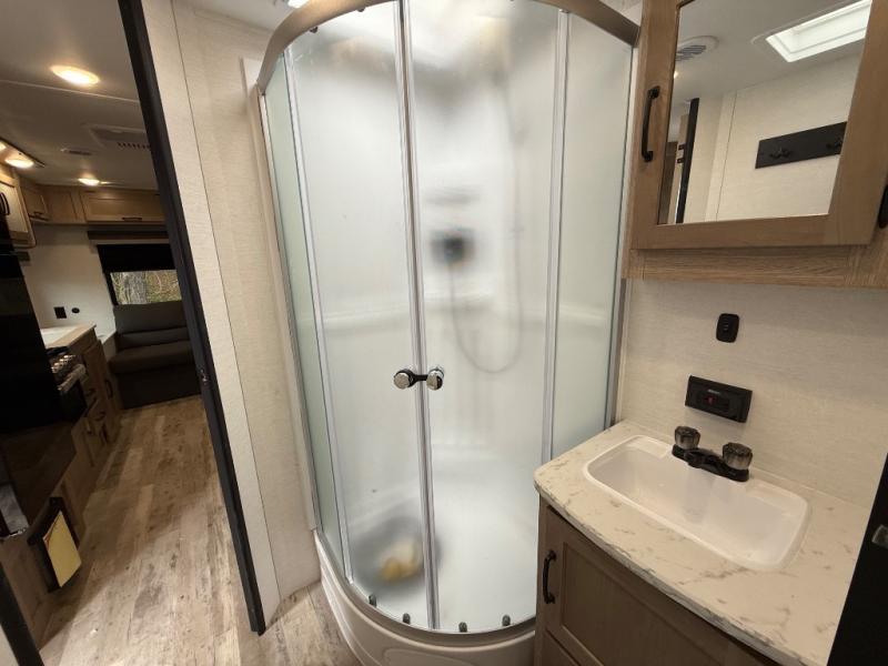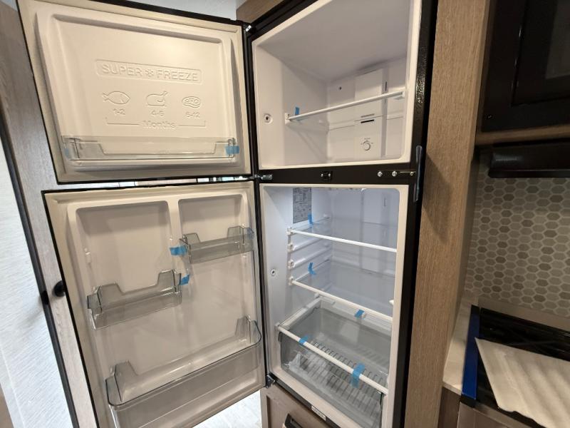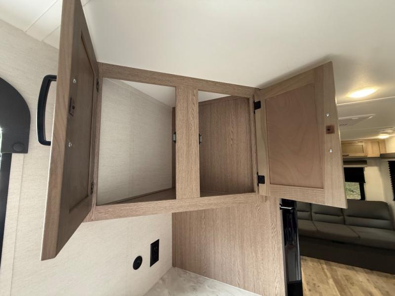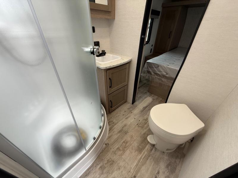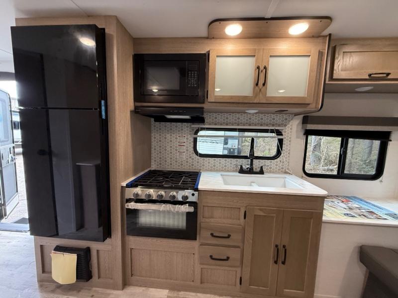 Camping with friends has never been so easy than in this cozy travel trailer. Once you arrive at your destination, prepare lunch on the three burner cooktop and you can dine at the booth dinette. Your guest can make this area their bed at night, along with the jack knife sofa. There is a front master bedroom with a queen bed that will feel just like home, and the two wardrobes provide a place for all your clothes. Head outside to find a pass-through storage, additional outside storage, plus an electric awning with LED lights!