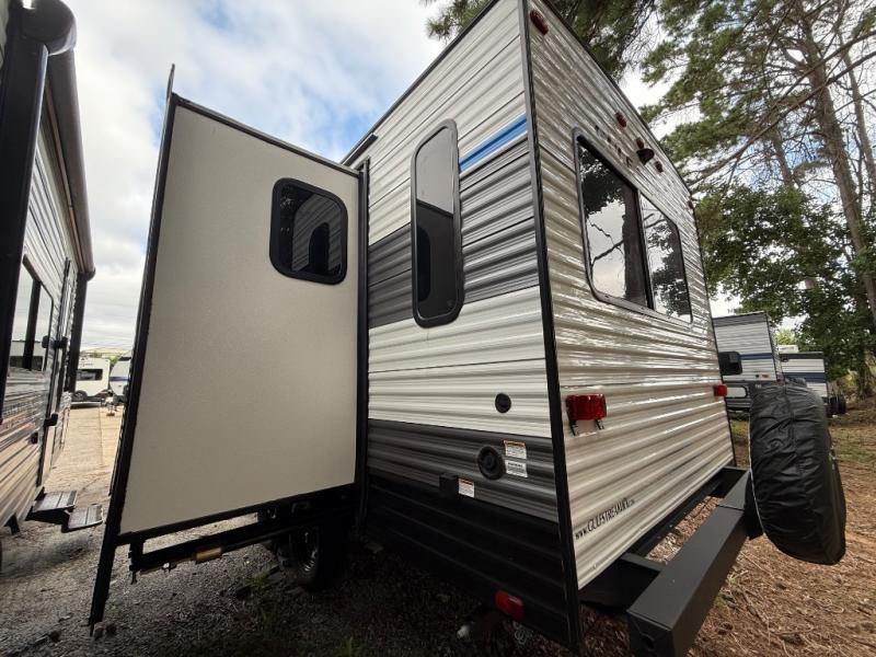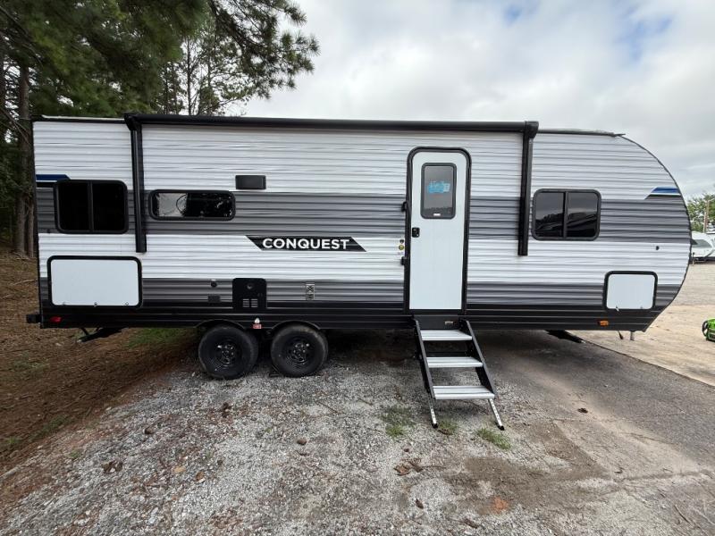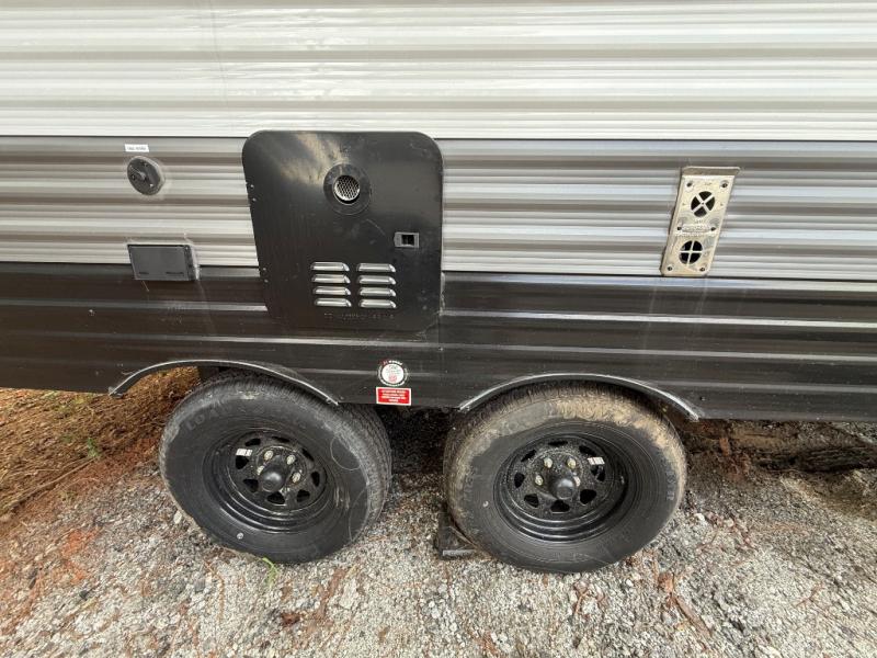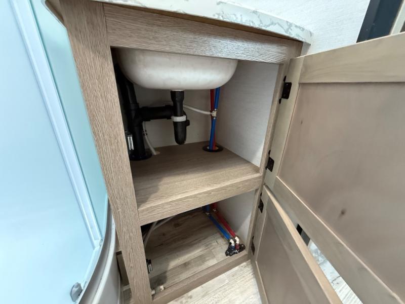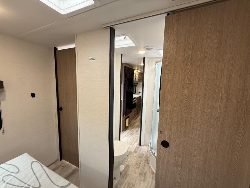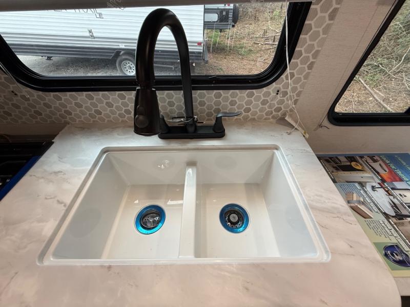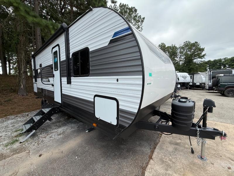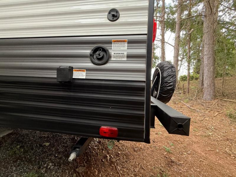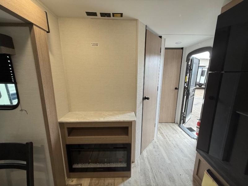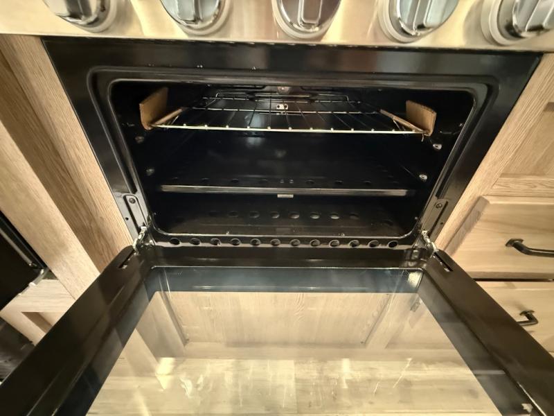 Camping with friends has never been so easy than in this cozy travel trailer. Once you arrive at your destination, prepare lunch on the three burner cooktop and you can dine at the booth dinette. Your guest can make this area their bed at night, along with the jack knife sofa. There is a front master bedroom with a queen bed that will feel just like home, and the two wardrobes provide a place for all your clothes. Head outside to find a pass-through storage, additional outside storage, plus an electric awning with LED lights!