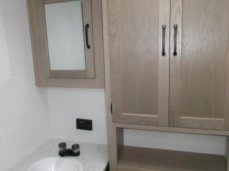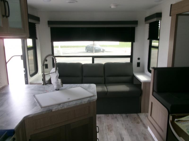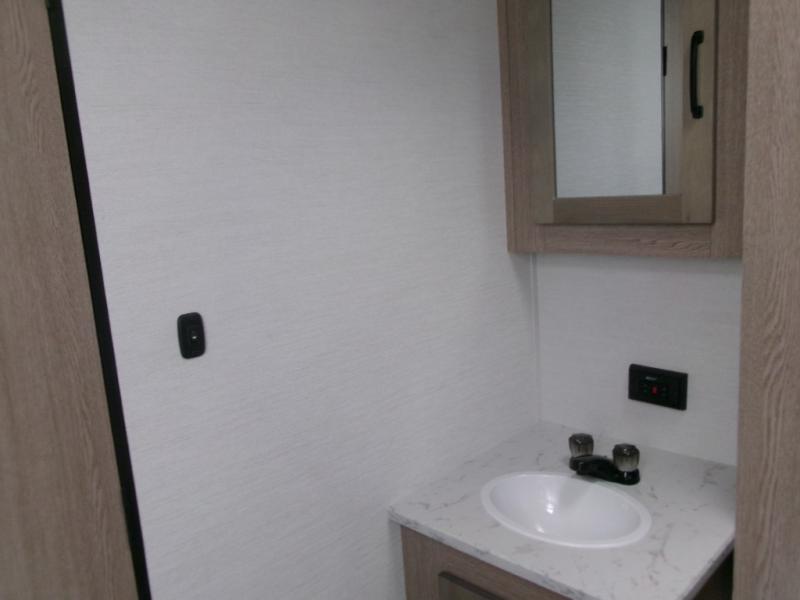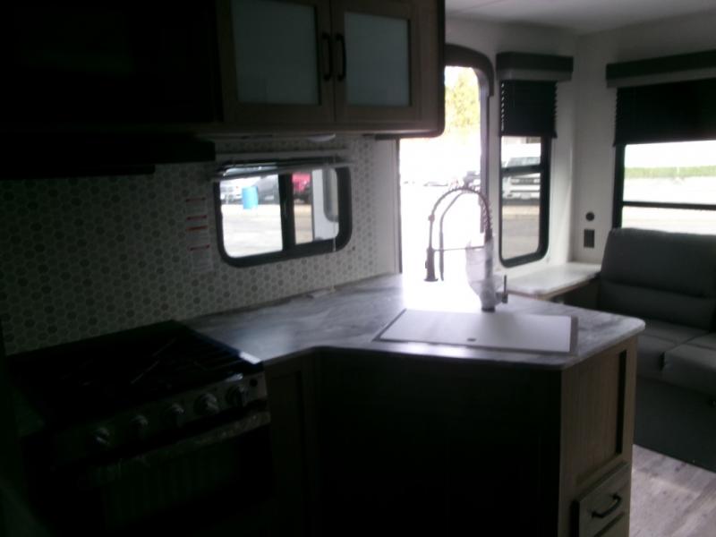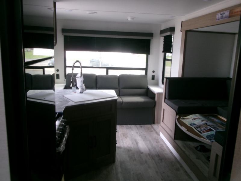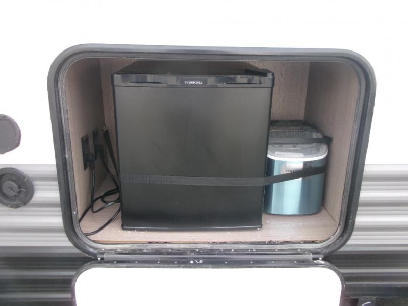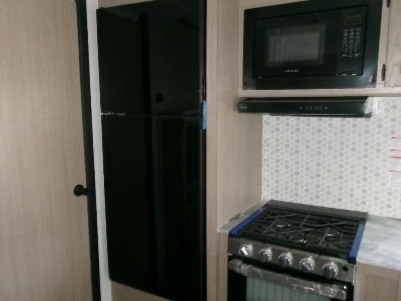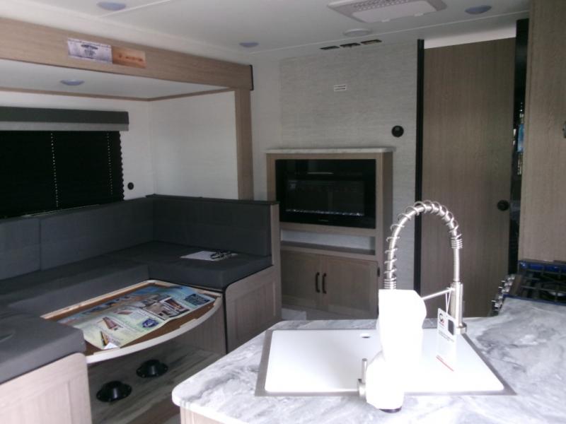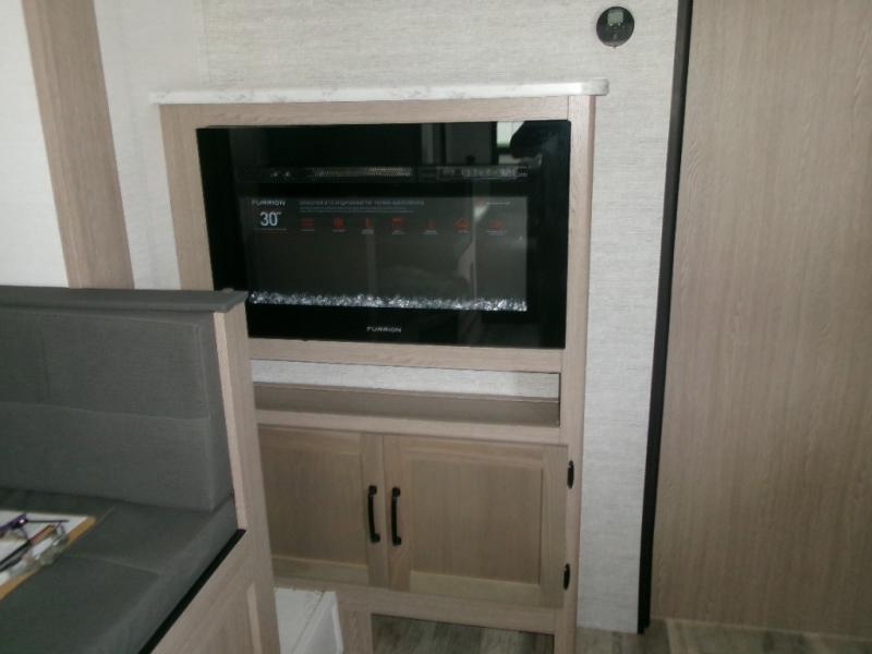 Make this comfortable travel trailer your home-away-from-home on the weekends. You will love having your own master bedroom up front with a queen bed and dual wardrobes for your clothes. The walk-through bath is spacious, allowing you to easily clean up each day. Your guests can sleep on the jackknife sofa or U-shaped dinette, and the fireplace here will make it feel more like home. This model includes all the appliances needed each day to prepare home-cooked meals, including a three burner cooktop, a microwave oven, and a 10.7 cu. ft. Everchill refrigerator/freezer. There is even an outdoor beverage center with a refrigerator and an icemaker to entertain guests!