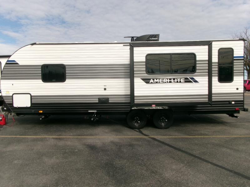 The Ameri-Lite Ultra Lite travel trailers by Gulf Stream are the perfect RV for families wanting to start their camping lifestyle, but not break the bank. These lightweight units are built with a diamond plate lower front, a one-piece synthetic vinyl roof, and a uni-body construction with steel hurricane straps tying the walls to the floor for added durability. The front power hitch jack and four stabilizer jacks will make set-up hassle-free once you arrive at the campground, and you can put out the electric awning to rest in the shade when you're done. Each model includes convenient amenities, like the 13,500 BTU A/C, the tankless water heater, a central control panel, and multiple USB ports for your tablet, phone, and camera! The inside is designed to make you feel at home with radiant LED lighting, designer kitchen backsplash, pleated privacy shades, craft-made cabinetry, plus many more features. Start your RV lifestyle with an affordable, lightweight Ameri-Lite Ultra Lite travel trailer today!