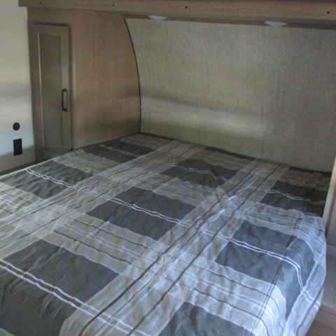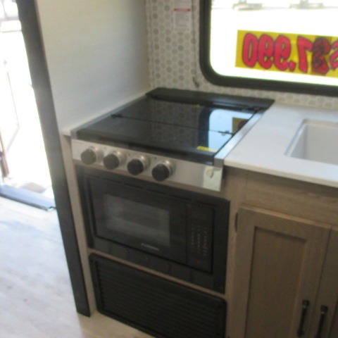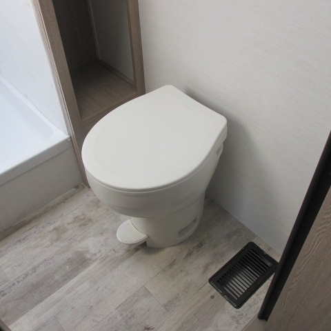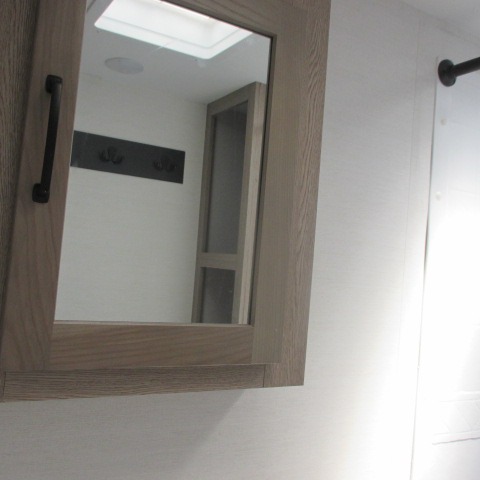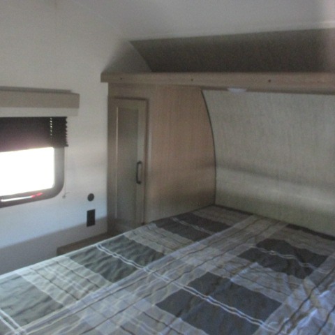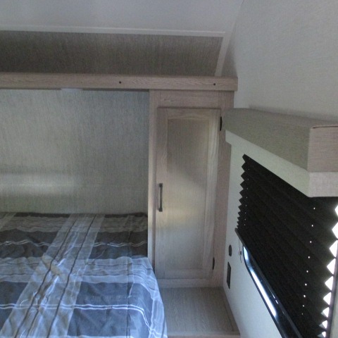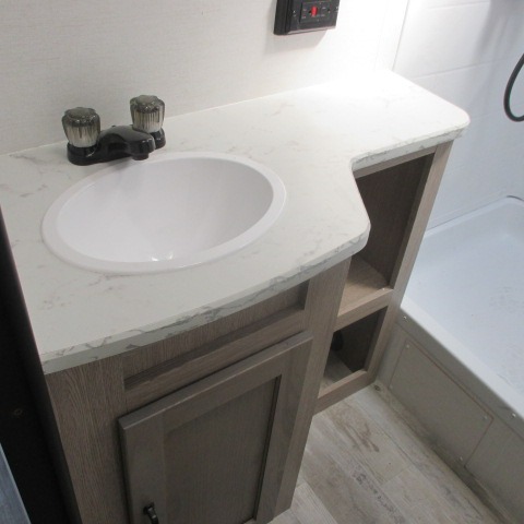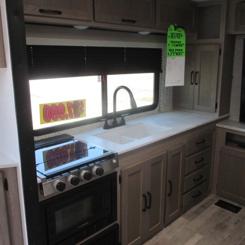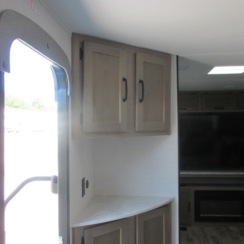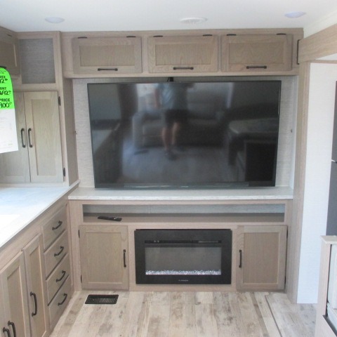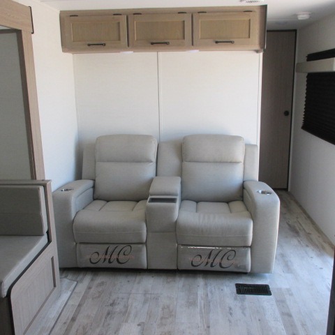 Designed with luxury and convenience in mind, this stunning RV offers the perfect blend of relaxation and excitement. The living room/kitchen area is the heart of the home, featuring a refrigerator, dinette, three-burner stove ideal for cooking your favorite meals, overhead cabinets, pantry, theater seating, and entertainment center. Perfect for having fun with friends and family, or simply relaxing and enjoying the comforts of home. The front bedroom boasts a queen bed, wardrobe, and shirt closet for all your favorite clothes and belongings. The full bathroom is a tranquil oasis, complete with a shower with skylight for added natural light. The perfect place to freshen up and feel at home.