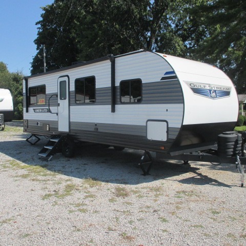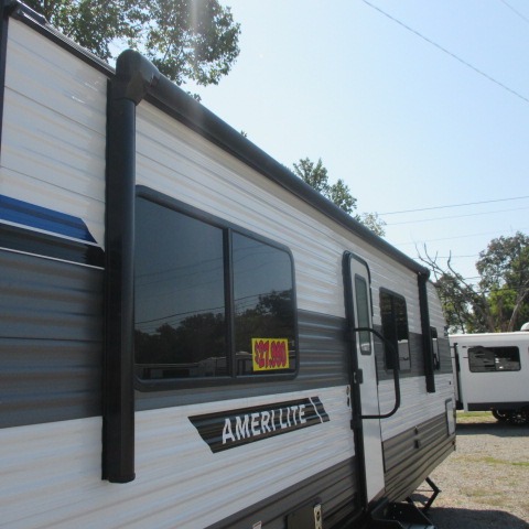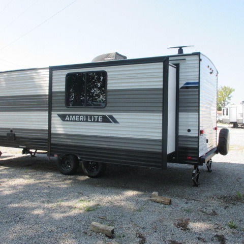 The Ameri-Lite Ultra Lite travel trailers by Gulf Stream are the perfect RV for families wanting to start their camping lifestyle, but not break the bank. These lightweight units are built with a diamond plate lower front, a one-piece synthetic vinyl roof, and a uni-body construction with steel hurricane straps tying the walls to the floor for added durability. The front power hitch jack and four stabilizer jacks will make set-up hassle-free once you arrive at the campground, and you can put out the electric awning to rest in the shade when you're done. Each model includes convenient amenities, like the 13,500 BTU A/C, the tankless water heater, a central control panel, and multiple USB ports for your tablet, phone, and camera! The inside is designed to make you feel at home with radiant LED lighting, designer kitchen backsplash, pleated privacy shades, craft-made cabinetry, plus many more features. Start your RV lifestyle with an affordable, lightweight Ameri-Lite Ultra Lite travel trailer today!