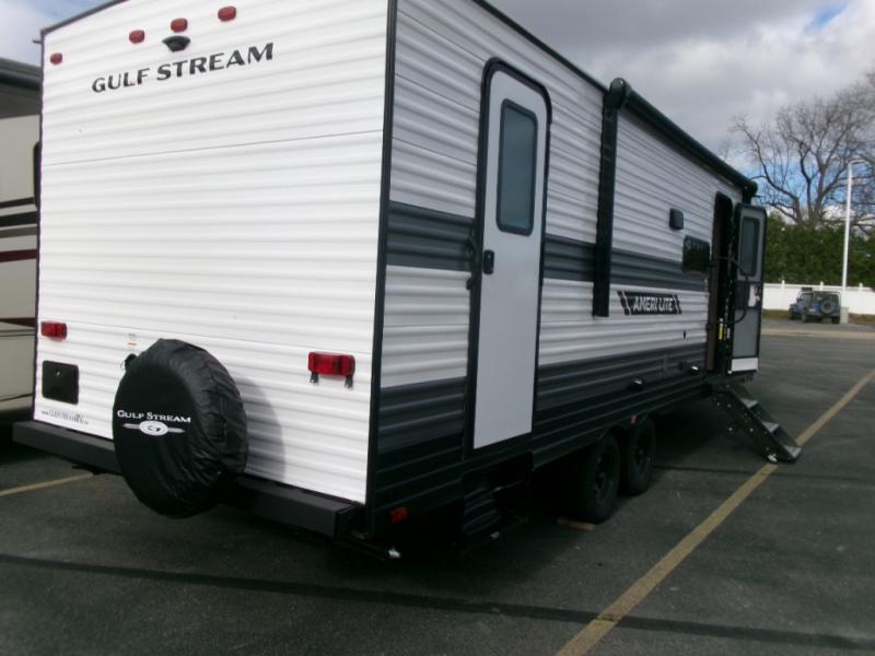 The Ameri-Lite Ultra Lite travel trailers by Gulf Stream are the perfect RV for families wanting to start their camping lifestyle, but not break the bank. These lightweight units are built with a diamond plate lower front, a one-piece synthetic vinyl roof, and a uni-body construction with steel hurricane straps tying the walls to the floor for added durability. The front power hitch jack and four stabilizer jacks will make set-up hassle-free once you arrive at the campground, and you can put out the electric awning to rest in the shade when you're done. Each model includes convenient amenities, like the 13,500 BTU A/C, the tankless water heater, a central control panel, and multiple USB ports for your tablet, phone, and camera! The inside is designed to make you feel at home with radiant LED lighting, designer kitchen backsplash, pleated privacy shades, craft-made cabinetry, plus many more features. Start your RV lifestyle with an affordable, lightweight Ameri-Lite Ultra Lite travel trailer today!